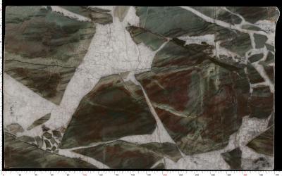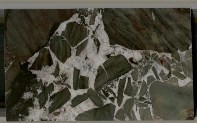 纹理呈现**不规则斑块与脉络交织的自然拼接状**。深绿色石块大小错落、形态各异:大块者呈棱角分明的多边形,小块者如细碎卵石镶嵌其间;浅灰白脉络则穿梭于石块缝隙,线条或粗或细、或直或曲,似岩石裂隙中矿物填充的天然痕迹,无刻意雕琢的规律,尽显原始野趣,仿佛将山间岩石碎裂后的地貌凝于一石之上。