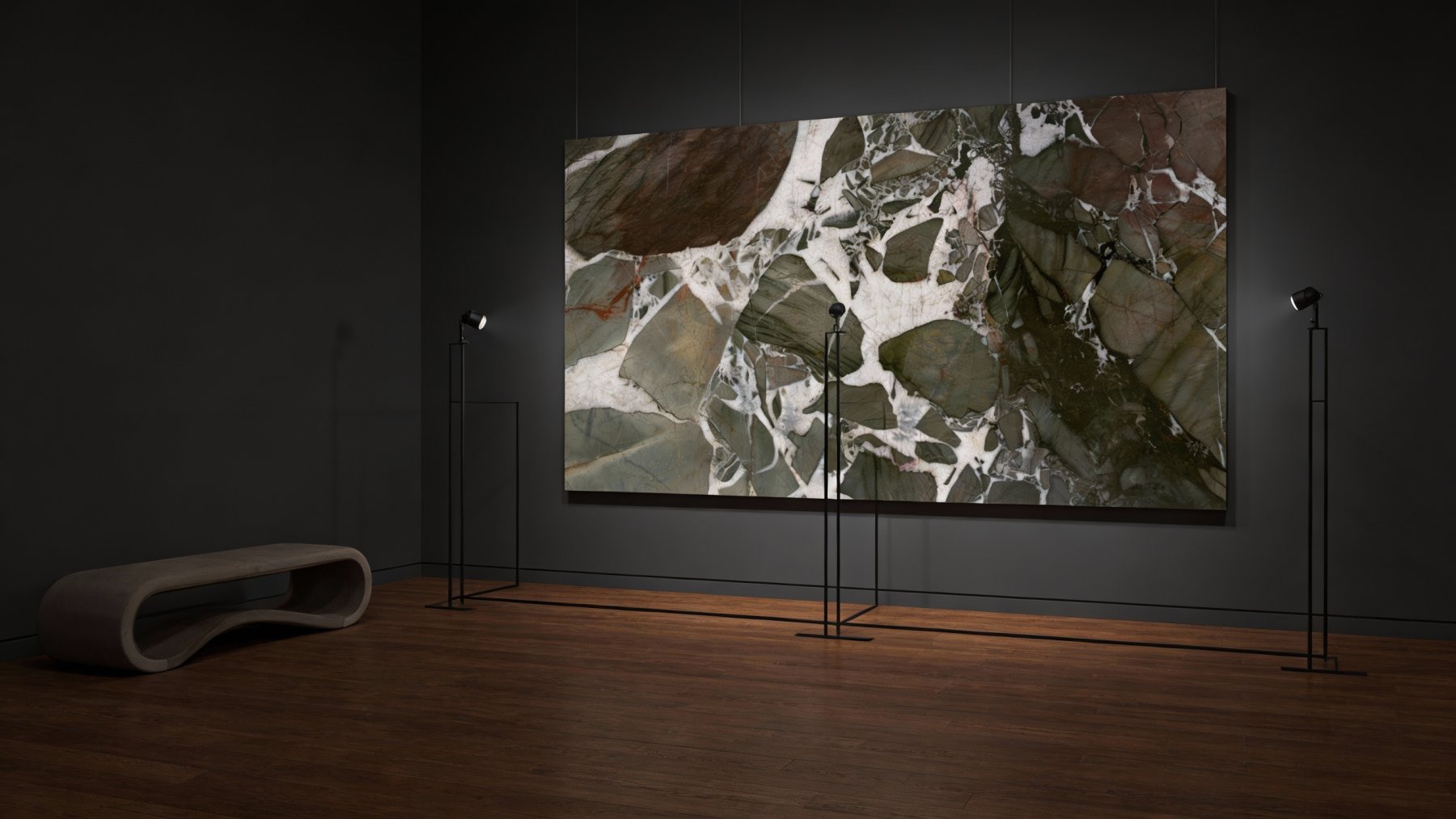 这款石材的底色基调以**浅灰白基质与深墨绿(带灰调)石质斑块形成鲜明对比**。浅灰白部分如天然石脉般舒展,色调柔和不刺眼;深墨绿斑块色泽沉稳厚重,略带灰调的绿调增添了自然质朴感。两者交织让整体基调既清爽通透,又因深色斑块的存在而富有层次,兼具视觉冲击力与和谐平衡感。