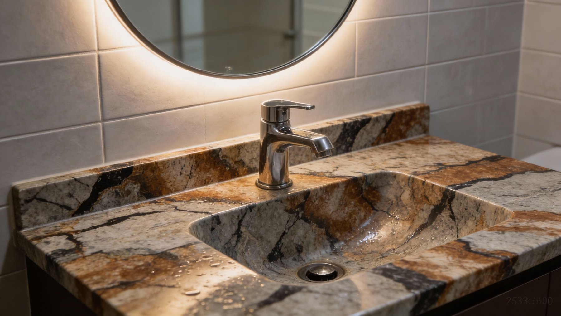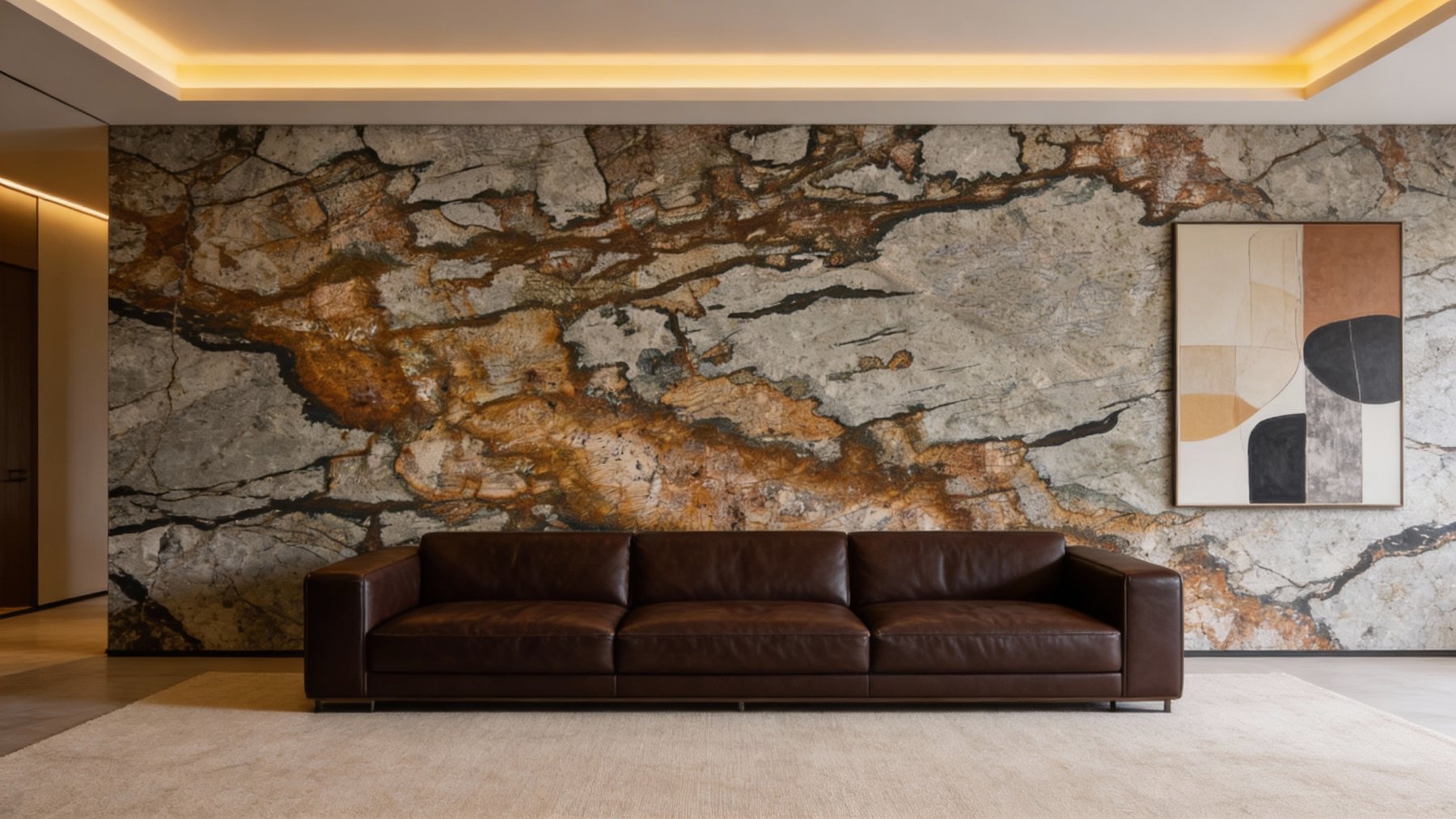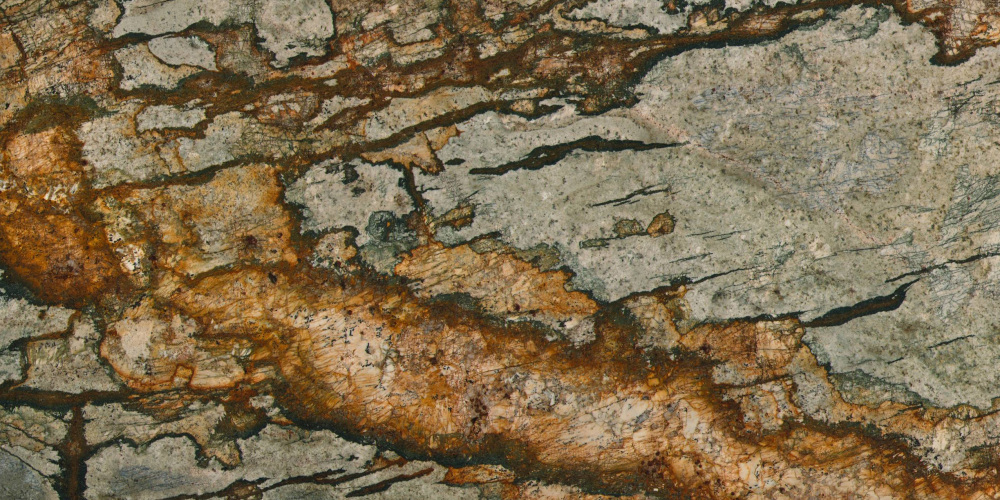 ### 底色基调 石材底色以浅灰与米白交织为柔和基调,呈现出层次丰富的浅色系基底。色彩并非单一平铺,而是在斑驳中透着自然的温润过渡——浅灰的冷静与米白的暖调相互渗透,细微的色彩渐变让基底不单调,反而自带原生的松弛感,仿佛未经刻意修饰的地质原貌。### 纹理形态 纹理以**脉络状有机形态**为主,深灰、暖棕与铁锈红等色调的纹理相互蜿蜒缠绕:既有纤细如丝的深色线条穿梭于基底间,似天然裂隙的痕迹;又有宽厚如带的暖棕色斑块铺展,如矿物浸染形成的温润条带。纹理走势灵动不规则,时而舒展蔓延,时而收缩聚敛,层次叠加间营造出动态的视觉张力,仿佛记录了地质演变中矿物流动的自然轨迹。### 细节质感 细节处藏着天然石材的丰富肌理:底色区域相对细腻平滑,却仍可见细微的矿物颗粒质感;暖棕色斑块带有磨砂般的温润触感,似经过岁月打磨的细腻;深色线条则因矿物成分差异,呈现出更明显的颗粒状凸起,部分细小裂纹状纹理更添真实感。整体呈哑光或半哑光质感,触摸时能感知到细微的起伏变化,既保留了天然石材的粗犷底蕴,又因细节的精致度显得厚重而有温度。