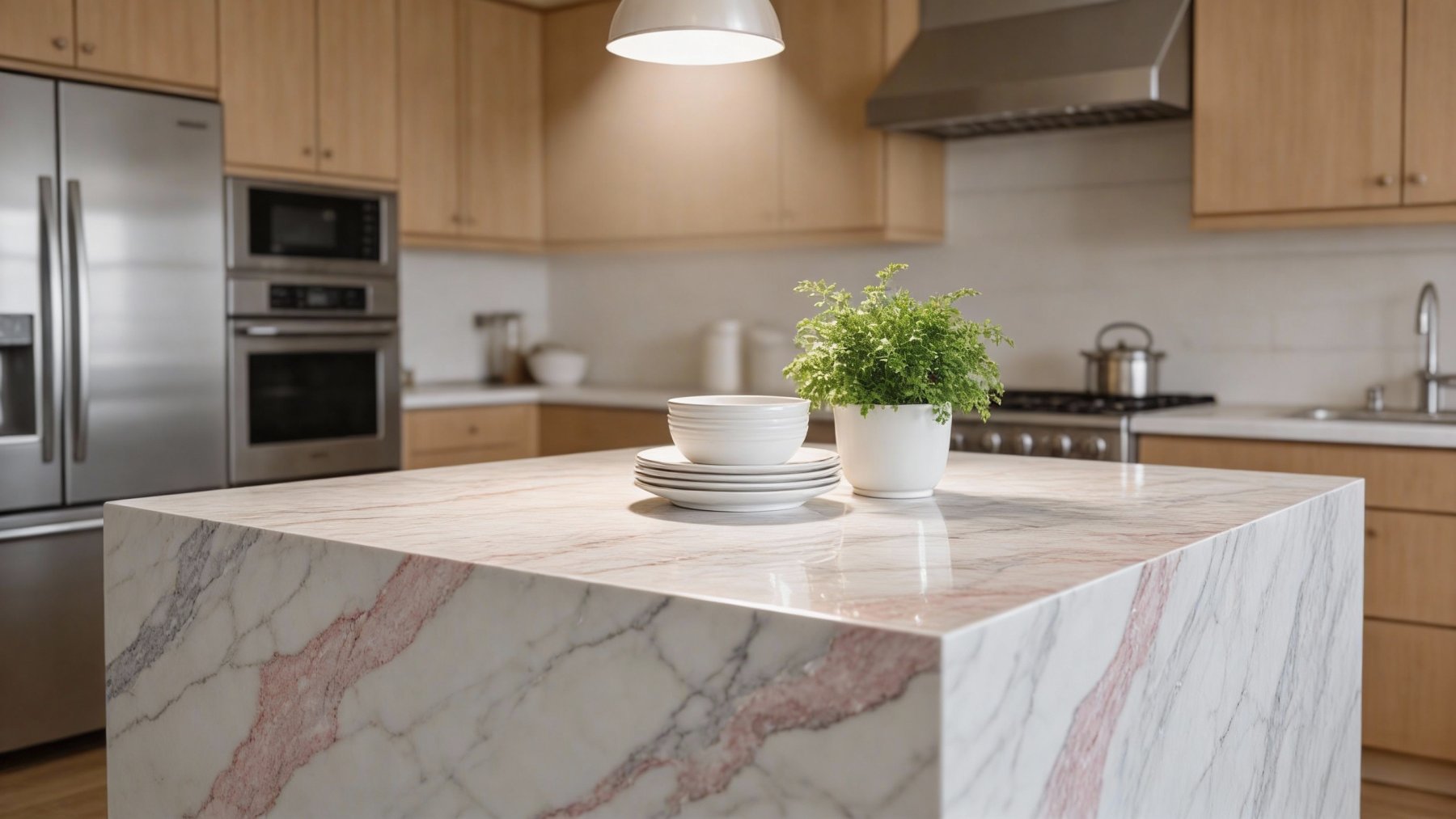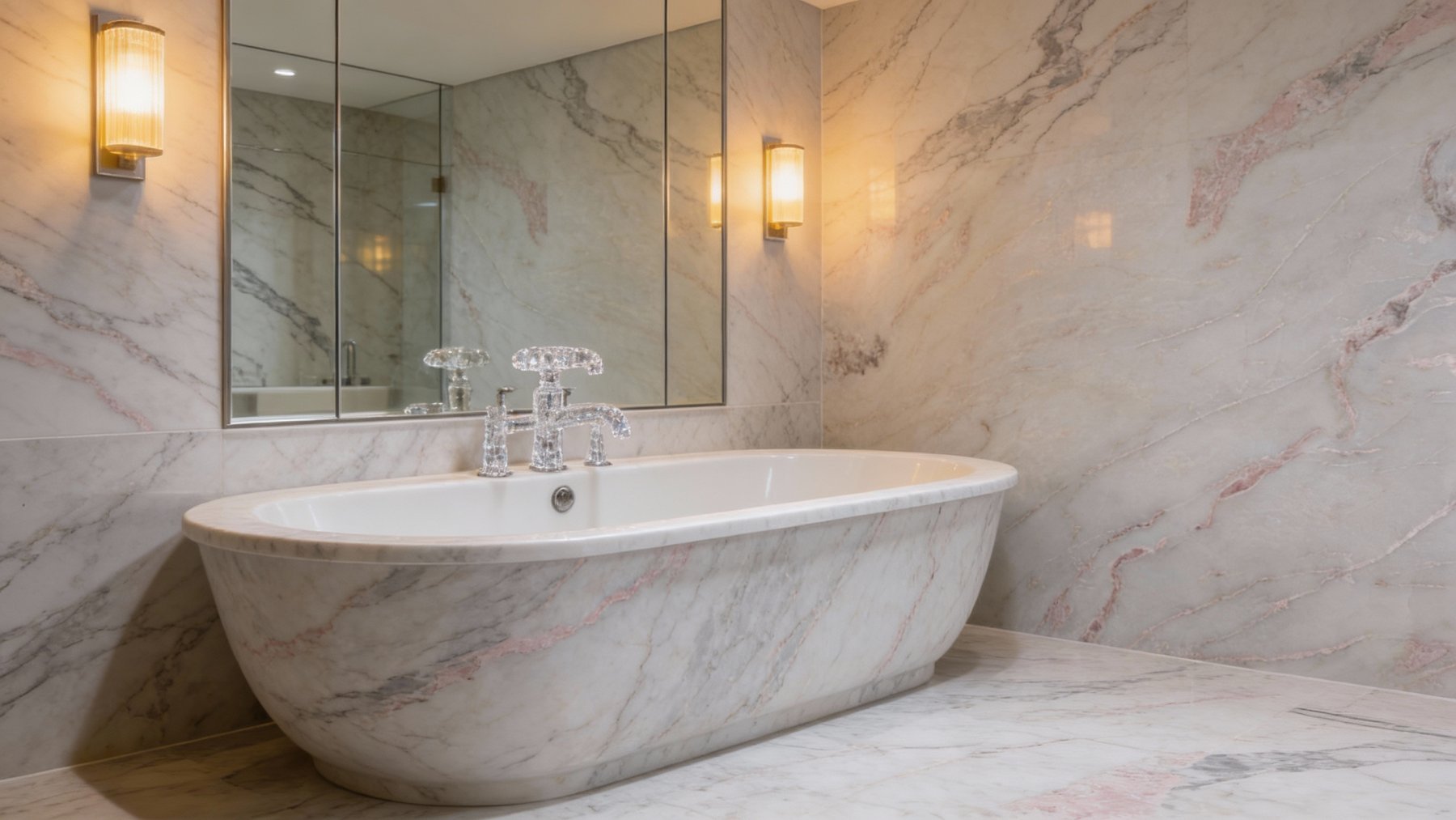 表面质感**细腻顺滑**,带有天然石材特有的温润光泽,触感应是平滑细腻、无明显颗粒感的;纹理过渡柔和自然,粉色纹路在白色基底上呈晕染式延展,无生硬边界,如同淡彩水墨般雅致。整体质感轻奢而不张扬,既保留了石材的坚实感,又传递出优雅柔和的视觉温度,适配多种风格空间。