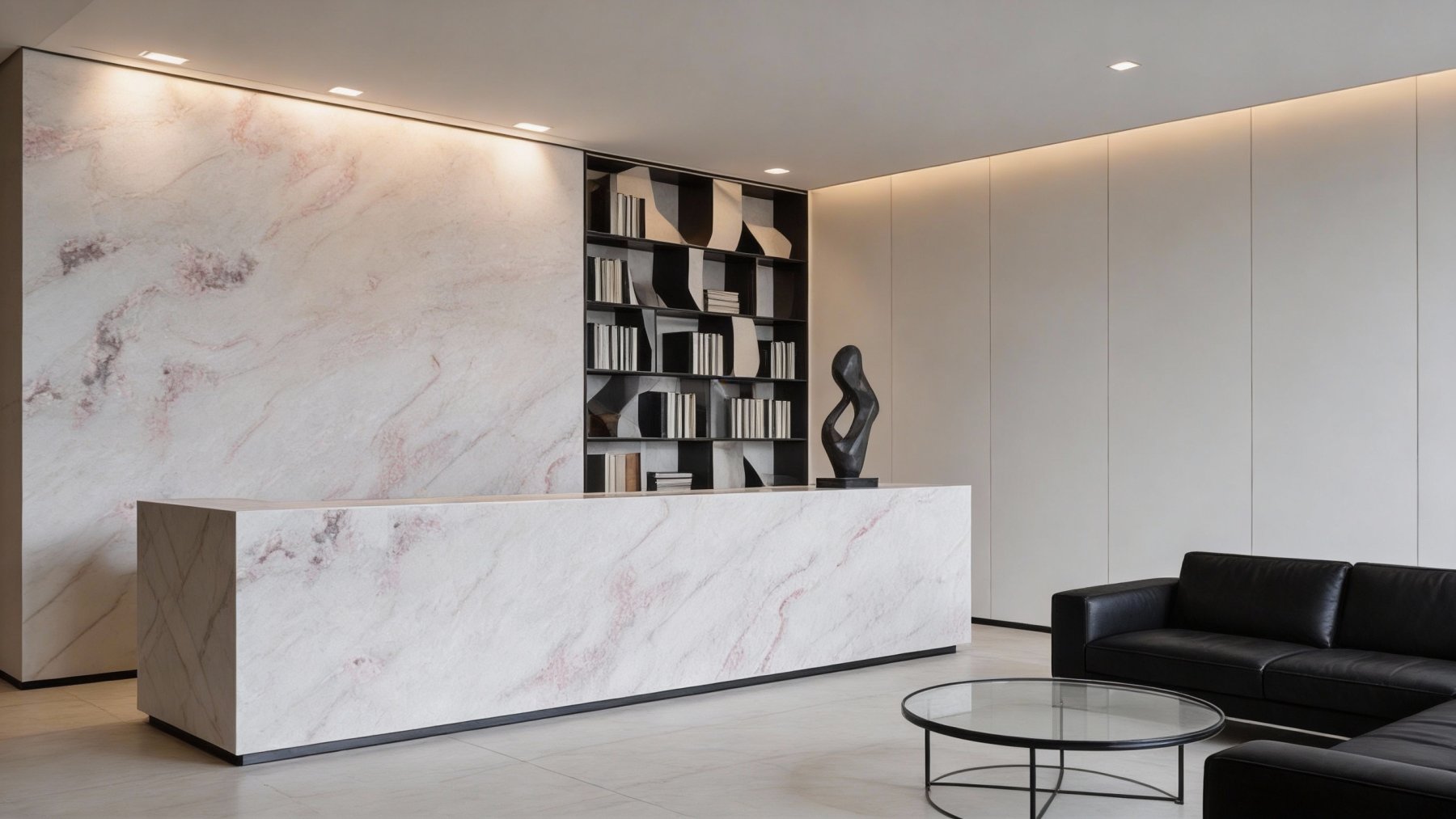 这款石材的底色以**纯净柔和的浅白色**为核心基调,略带一丝温润的象牙白质感,色调清新雅致且无强烈跳脱感,如同清晨薄雾般轻盈,为整体视觉奠定了简约高级的基底,既显明亮通透,又不失自然石材的温润底蕴。
