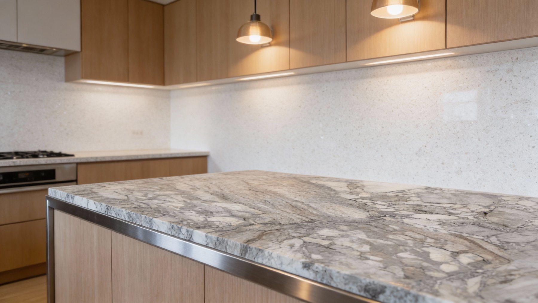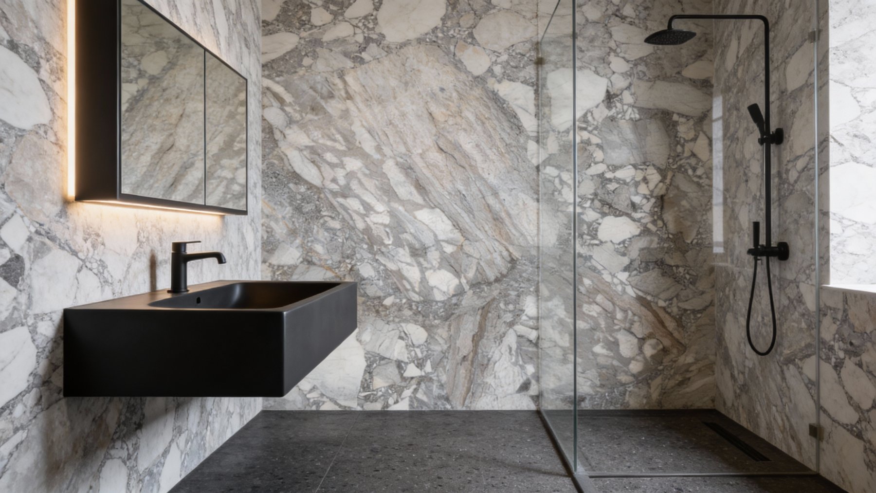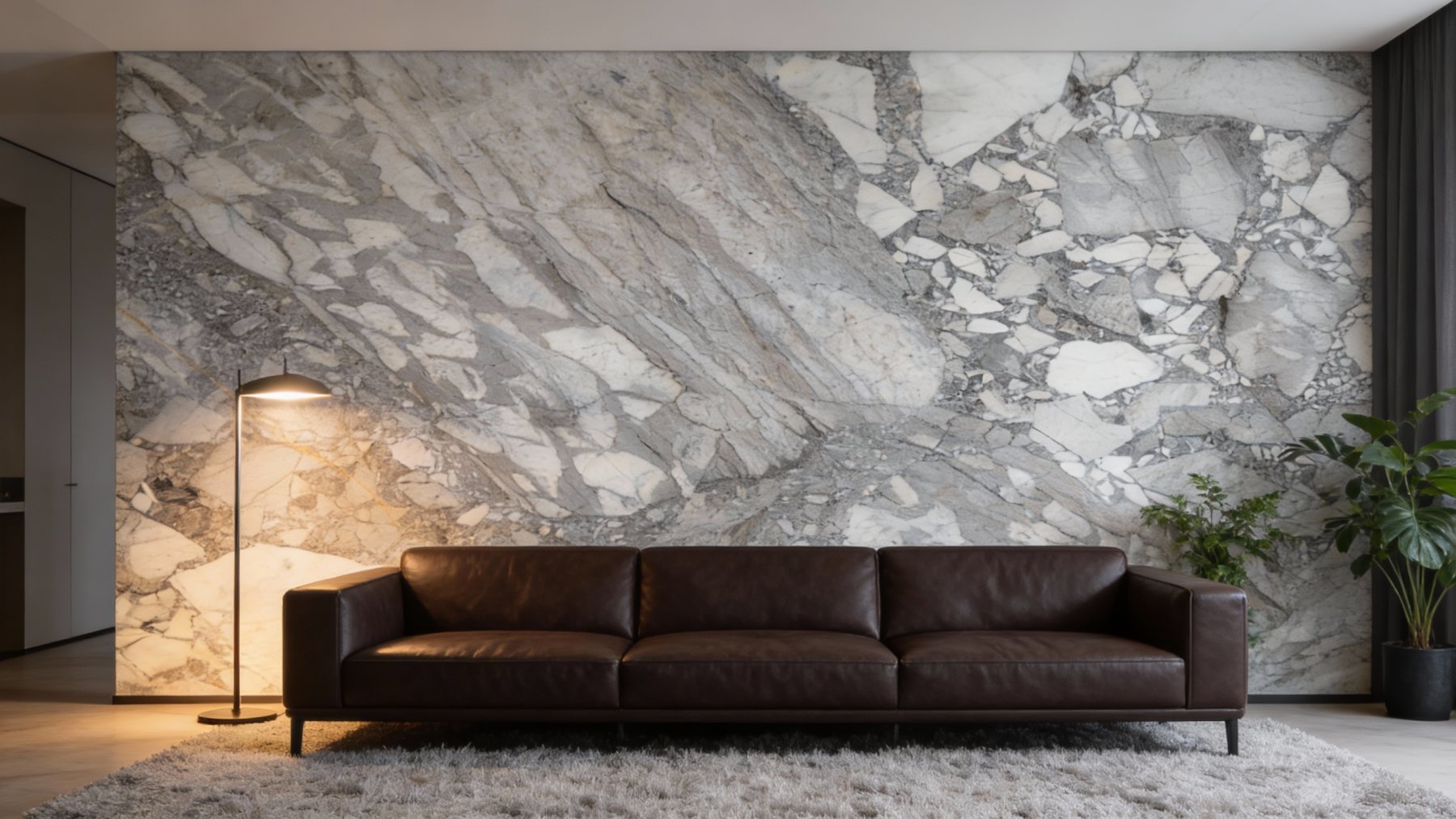 ### 底色基调 这款石材以**浅灰色为基底**,间杂大面积米白色与灰白色斑块,整体色调柔和且富有层次。浅灰的沉稳与米白的明亮相互交织,既保留了天然石材的素雅质感,又通过色彩的错落营造出不单调的视觉氛围,适配多种风格的空间搭配。### 纹理形态 纹理呈现**“层理脉络+碎块拼接”**的复合形态: - 部分区域可见流畅、略带倾斜的条状脉络,如同岩石经地质作用形成的层理结构,线条细密且方向相对一致,带有自然的拉丝感; - 另一部分则是**不规则碎块状纹理**——白色、浅灰与深灰色的小石块相互镶嵌、拼接,仿佛石材碎裂后重组的天然痕迹,大小不一的块状对比鲜明,却又通过色调的过渡和谐统一;整体纹理无刻意规律,尽显自然地质运动的随机性与原始感。### 细节质感 细节处兼具**细腻平滑与粗犷肌理**的双重质感: - 基底表面平滑温润,带有石材天然的坚实感; - 深浅灰色的纹理线条带有轻微的起伏肌理,仿佛触摸到岩石的原生层理; - 白色斑块部分通透感较强,隐约可见结晶状的光泽,而灰色区域则呈半哑光质感,内敛沉稳; - 碎块拼接处的边缘清晰自然,没有人工雕琢的痕迹,每一处细节都彰显出天然石材的原始质感与高级感。