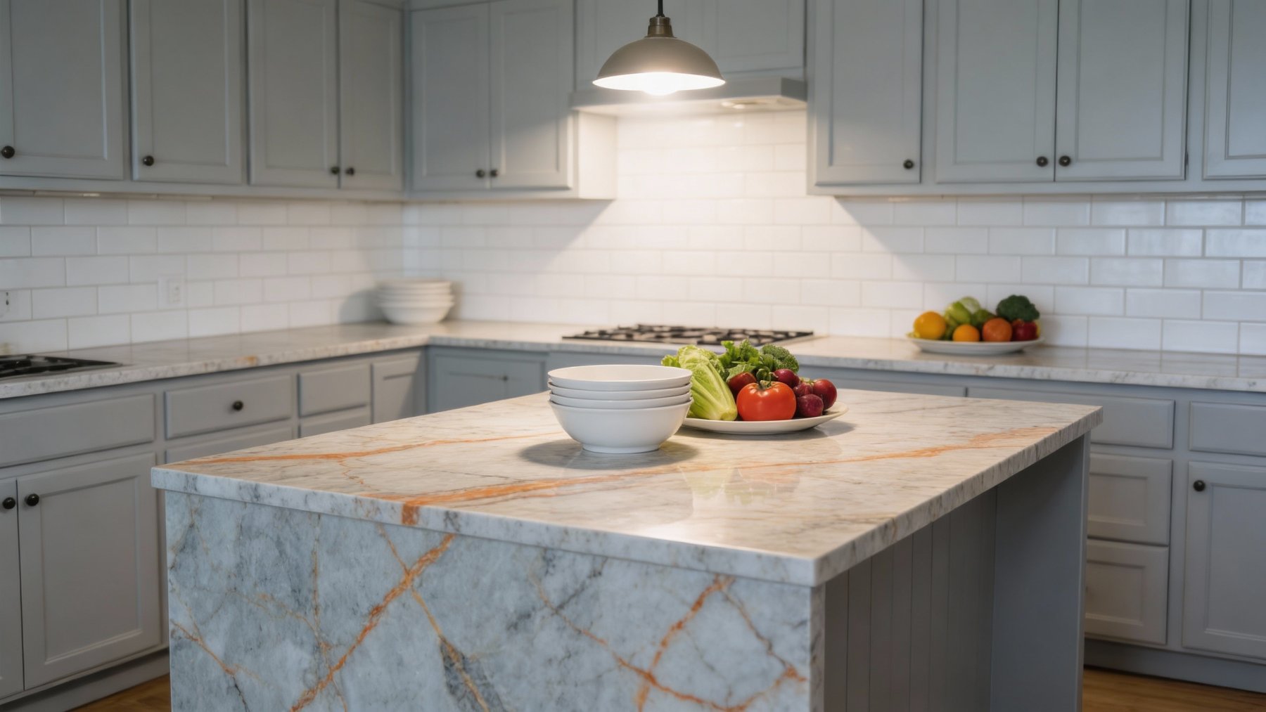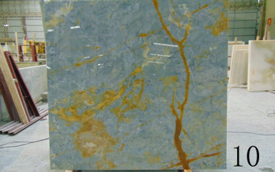 ### 底色基调 这款石材的底色基调以**浅灰青色**为主调,间杂着大面积的**乳白色斑块**,整体色调清冷雅致。浅灰青色的沉稳与乳白色的纯净相互交织,既保留了自然石材的质朴感,又因色调的柔和过渡,奠定了舒缓静谧的视觉基底。### 纹理形态 纹理呈现出自然随性的多元形态:**金黄色脉络状线条**肆意蜿蜒,粗细不一且相互交错,如大地脉络般充满流动感;局部点缀着**深灰色不规则小斑块**,似天然矿物结晶,与浅色基底形成微妙对比;乳白色斑块边缘过渡柔和,与灰青色区域自然融合,无规则却和谐,宛如写意山水的笔触,自带诗意韵律。### 细节质感 抛光后的表面呈现**温润细腻的莹润光泽**,触感应平滑致密;金黄色线条色泽饱满,带有矿物特有的通透质感;乳白色区域质地纯净,灰青色部分隐约可见细微的矿物颗粒肌理;深浅色块与线条的交织处过渡自然,整体质感层次丰富——既保留了石材的天然厚重感,又因细腻抛光而透出雅致高级的气质。