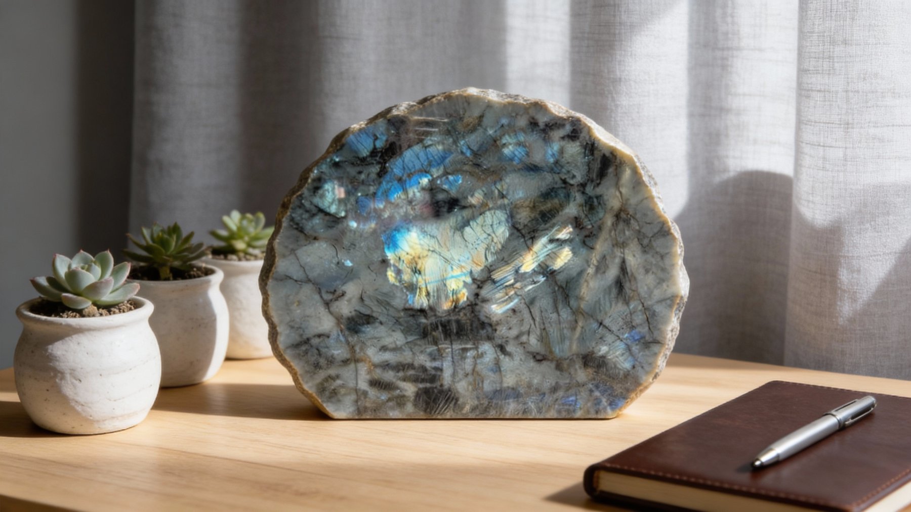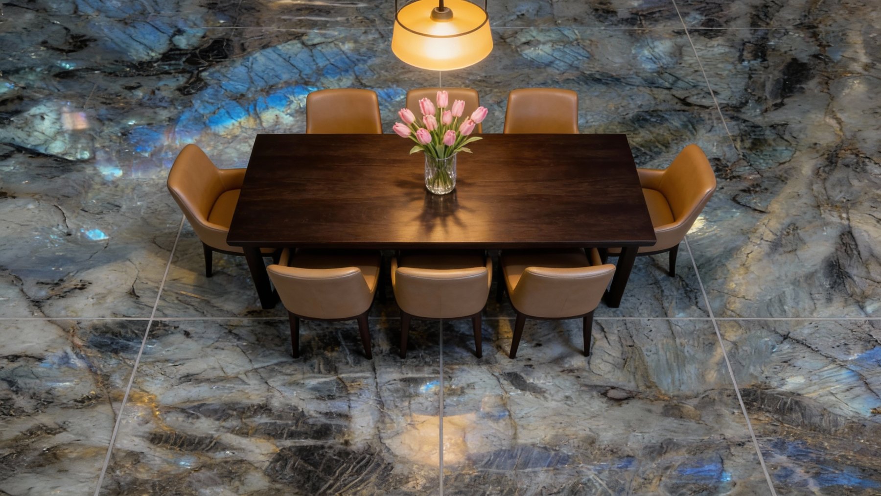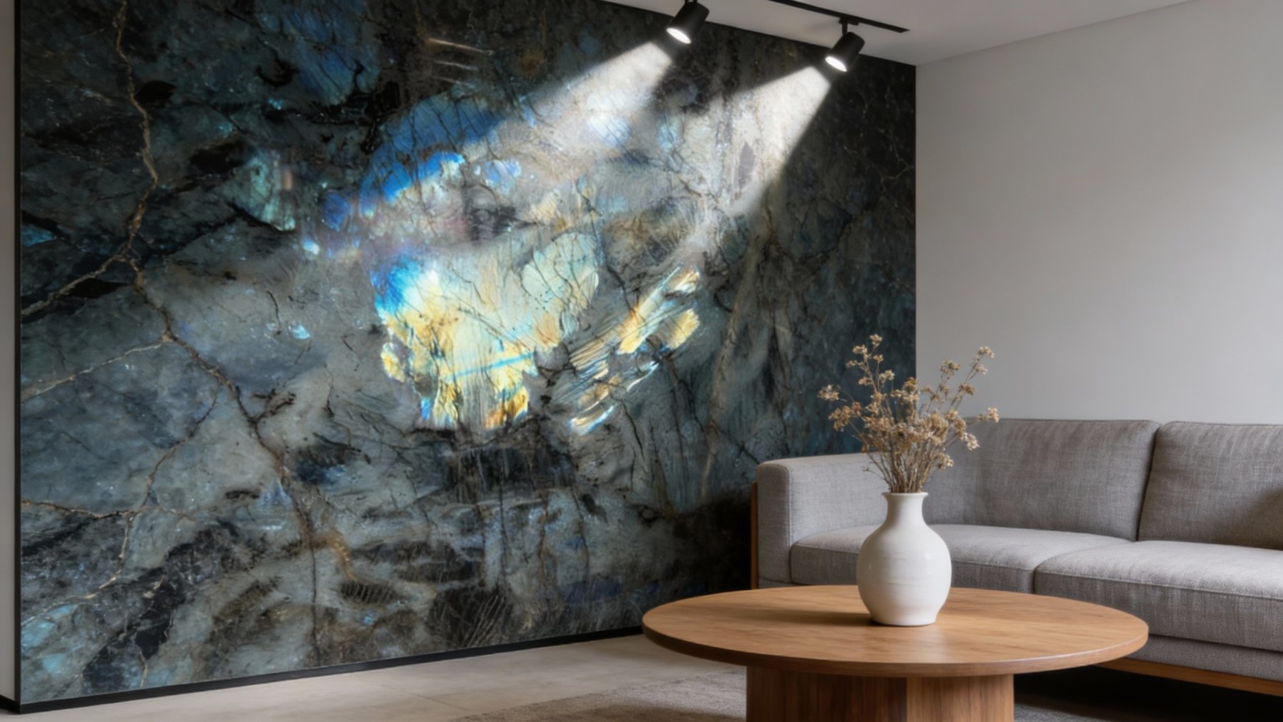 - 闪光区域的矿物颗粒呈现强烈的**珠光/金属光泽**,在光线变化下折射出蓝银渐变、金闪点缀的动态效果,如同嵌入石材的“星光碎片”;