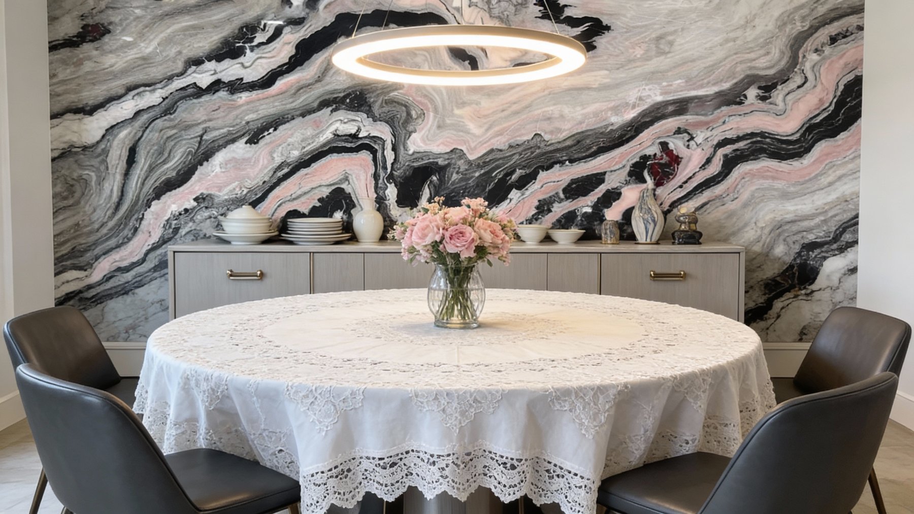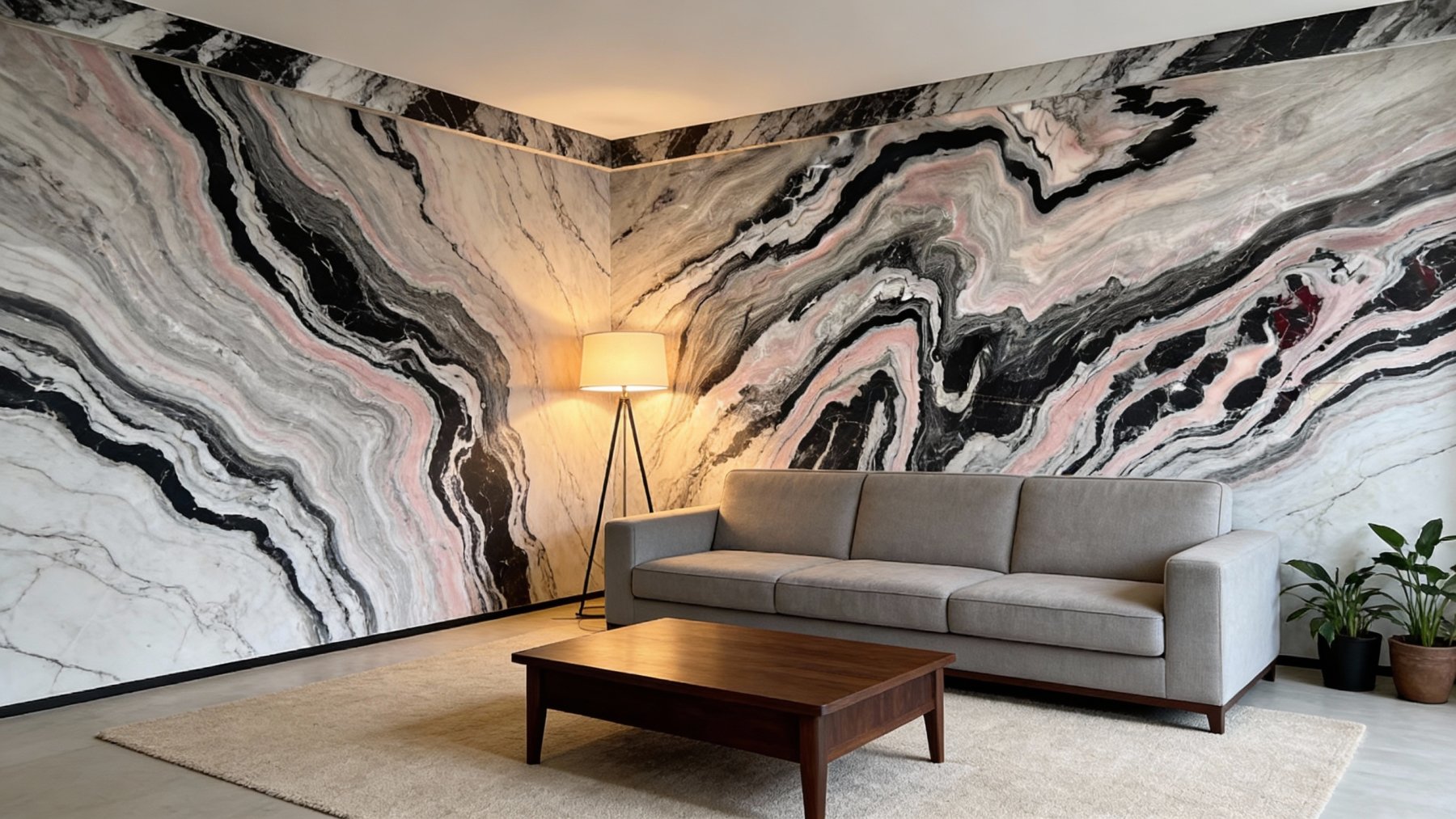 ### 底色基调 以**深邃墨黑**为基底,交织着**柔和淡粉**与**纯净乳白/浅灰**三色主调。墨黑的沉稳大气奠定了空间的静谧感,淡粉如樱花落痕般温婉柔和,乳白则似云雾般轻盈通透;三色并非割裂存在,而是自然渗透、相互映衬,既保留了深色系的庄重,又因粉白的融入消解了沉闷,整体基调平衡且富有温度,适配多元风格的空间氛围。### 纹理形态 纹理呈现**自然流动的水墨流体状**,如江河蜿蜒、云雾漫卷般富有动感。黑色纹理时而宽幅舒展如墨色长河,时而纤细如丝似游龙穿梭;粉色与白色纹理则以柔和曲线层叠漫延,与黑色纹理相互缠绕、渗透,形成“疏密有致、虚实交织”的视觉层次——宽处如浪潮翻涌,窄处似细线牵引,仿佛将液态艺术瞬间定格,每一寸纹理都承载着自然的随机与灵动。### 细节质感 表面经高光泽抛光处理,**触感平滑细腻**,视觉上泛着温润内敛的光泽。细节处颜色过渡自然晕染,无生硬边界:粉色与白色的衔接处渐变柔和,似豆沙与奶油的融合;黑色与浅色调的交界处则如墨滴入水般晕开,形成朦胧的过渡带。纹理内部虽无物理起伏,却因色彩浓淡、线条粗细的变化,在视觉上营造出“深浅交错、层次丰富”的精致感,尽显天然石材的高雅与独特性。