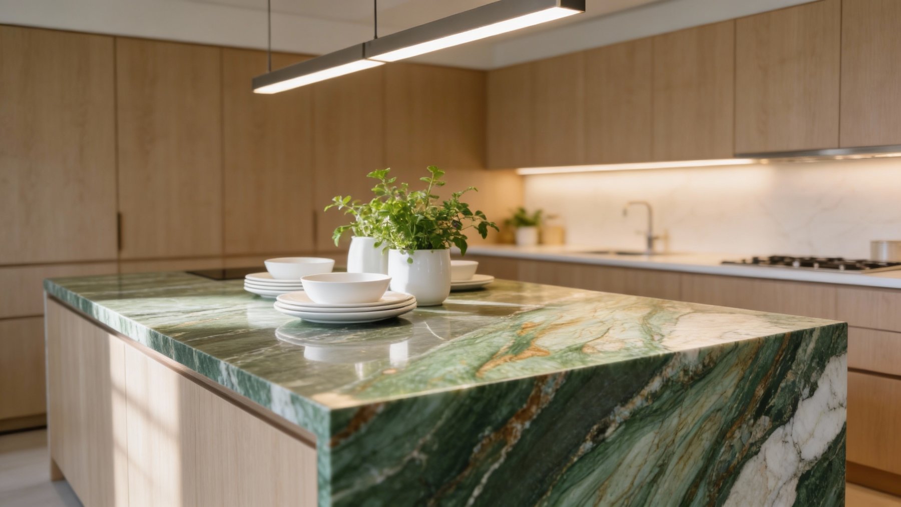 从细节质感来看,石材表面**细腻温润**,泛着柔和的自然光泽;部分浅色区域隐约可见**细微的矿物结晶闪光点**,为质感增添了精致的层次;纹理边缘过渡自然,触摸时能感受到平滑基底上微妙的肌理变化——既有石材的坚实厚重,又不失灵动精致的细节表现,整体质感高级且富有生命力,兼具观赏价值与实用的质感体验。