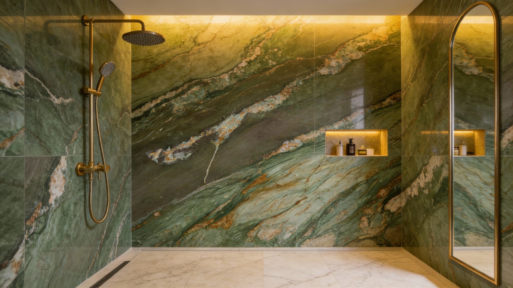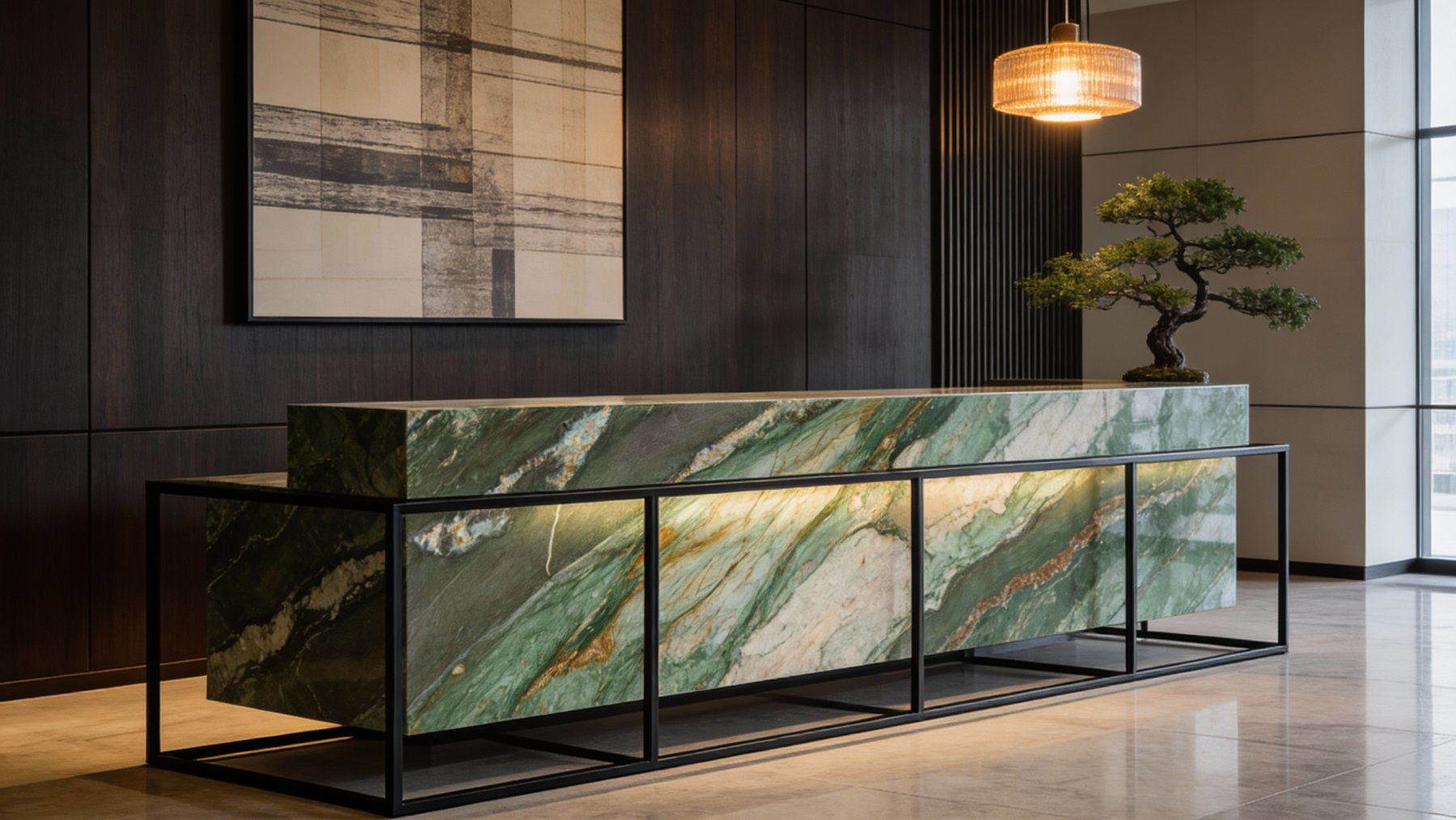 石材的底色基调层次丰富且富有张力,以**深邃沉稳的灰紫调**为基底,巧妙交织着**浅灰绿**与**暖米白**的渐变过渡色块。冷暖色调相互映衬,既保留了石材天然的厚重感,又通过浅色调的融入增添了柔和度,整体基调在沉稳中透着灵动,为空间奠定了高级且包容的视觉基础。