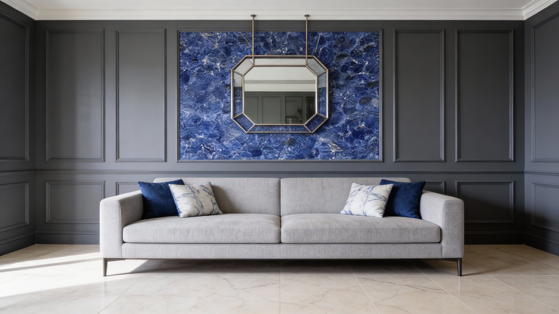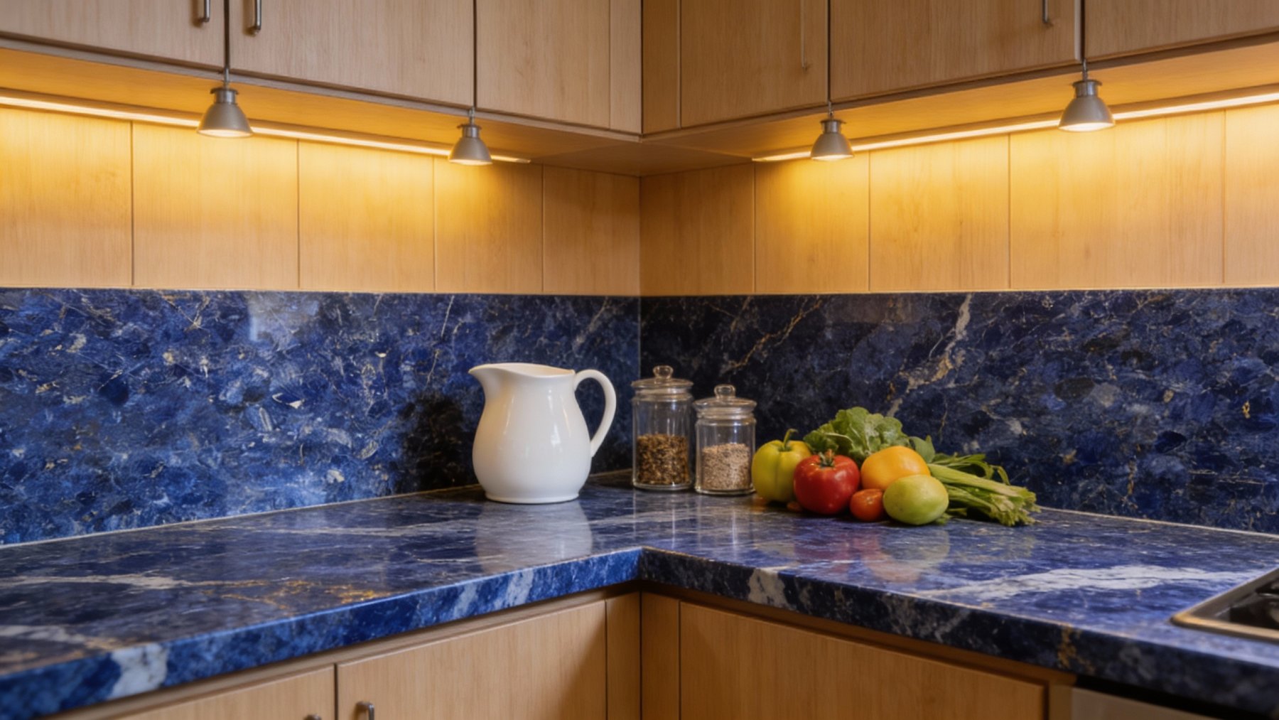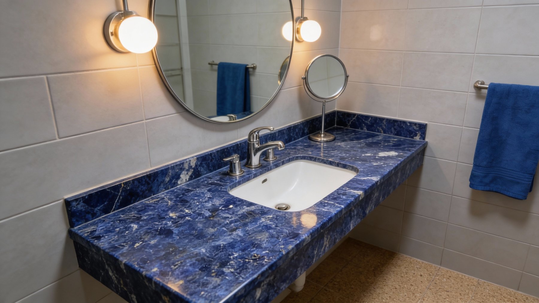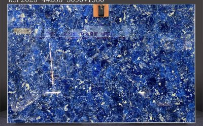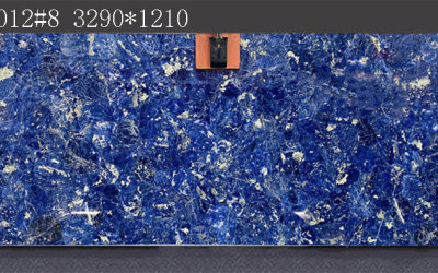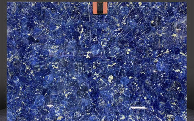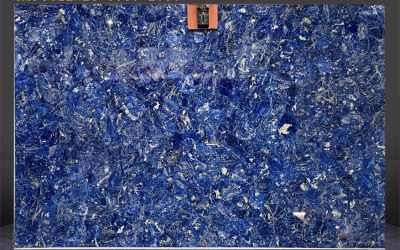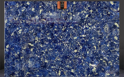 这款石材的底色基调以**浓郁深邃的蓝色系**为主,呈现出层次丰富的蓝调变化——从饱满鲜亮的钴蓝色到沉静内敛的藏蓝色交织融合,仿佛将深海的静谧与星空的幽邃凝萃于一体。整体色调厚重而富有张力,无单一色块的单调感,自带高贵沉稳的天然气质,给人以静谧而震撼的视觉冲击。