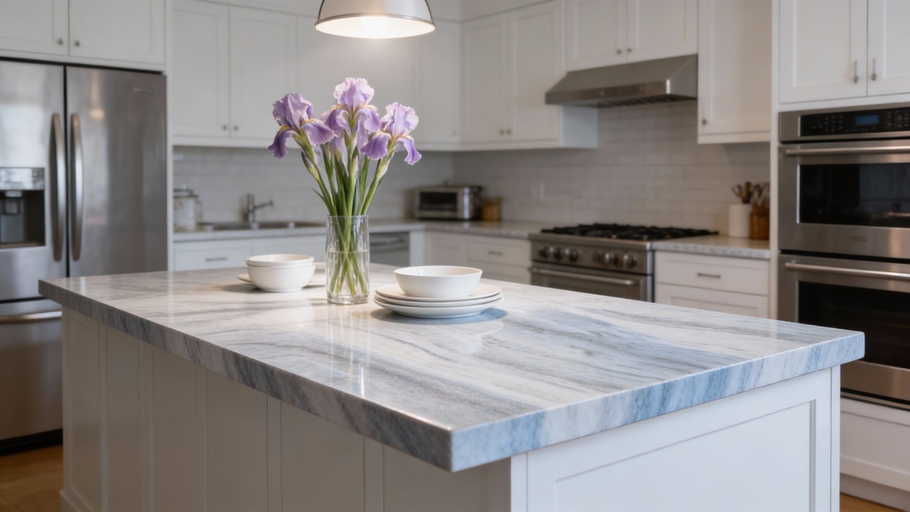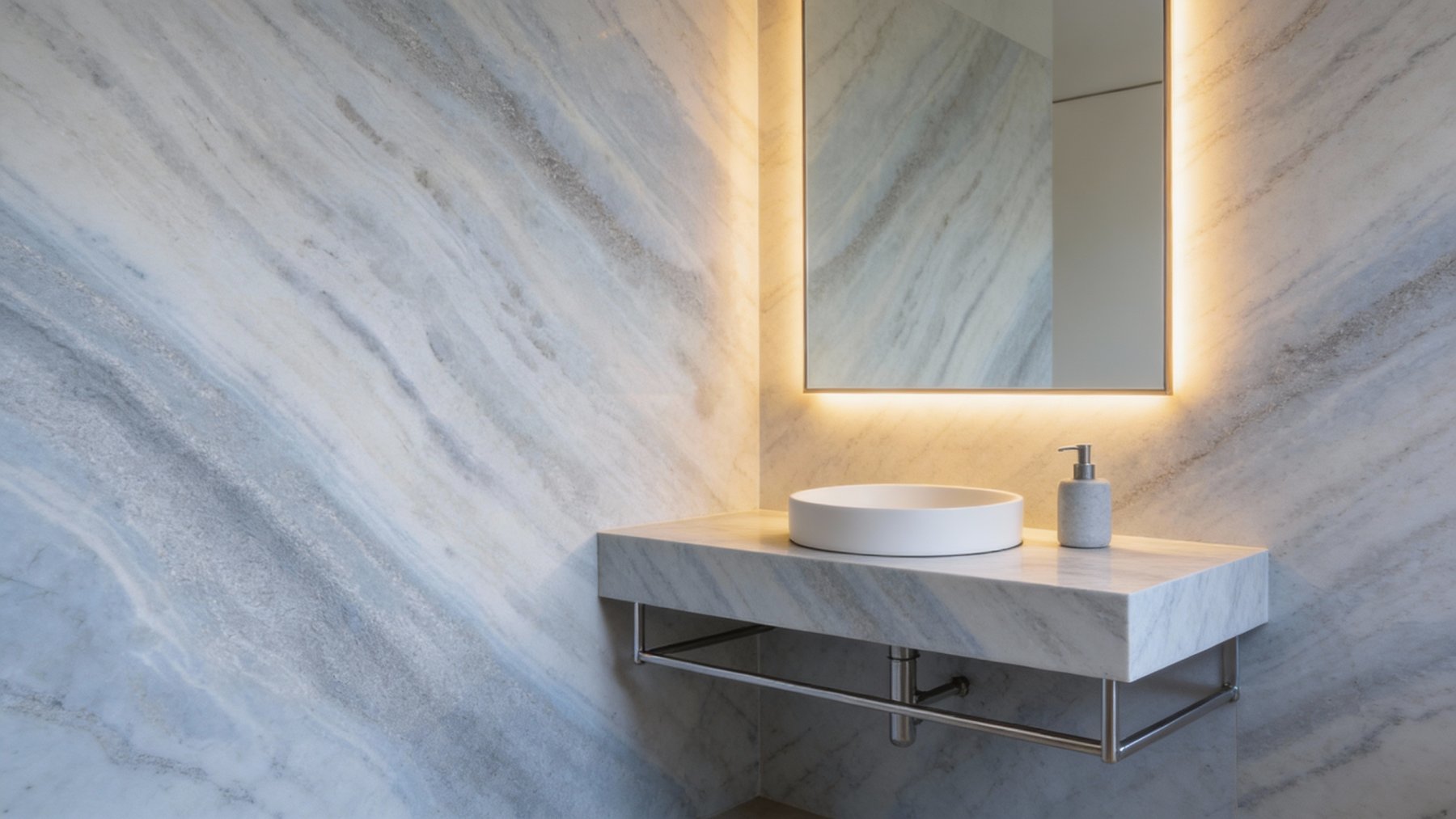 ### 底色基调 这款石材的底色以柔和的浅灰色为主调,间杂着纯净的白色肌理,整体呈现出清新淡雅的冷色调氛围,既不沉闷也不过于跳脱,给人宁静舒适的视觉感受。### 纹理形态 纹理以**流畅飘逸的斜向条纹**为核心特征,线条自然舒展、无刻意规则感,深浅不一的灰色纹理与底色相互交织,形成层次丰富的流动感;部分区域点缀着细碎的浅灰色斑点,增添了天然石材的随机与生动性,整体纹理如同自然晕染的水墨,灵动而富有韵律。### 细节质感 表面质感细腻温润,触感平滑细腻,纹理过渡自然柔和,无生硬边界;整体呈现低调的**柔光质感**,既保留了石材的天然肌理感,又兼具现代简约的精致度,视觉上层次分明却不杂乱,尽显石材的温润与雅致。