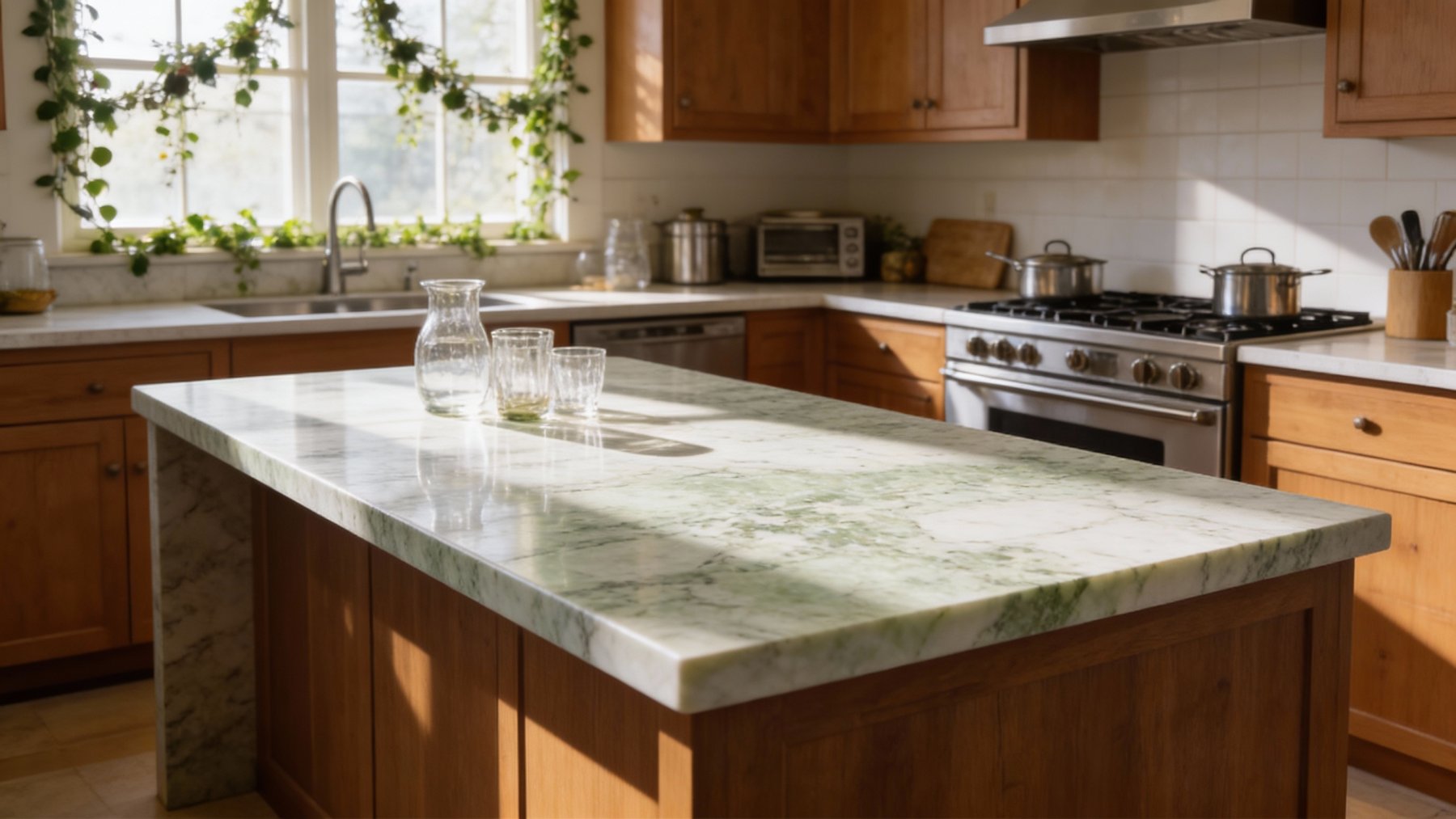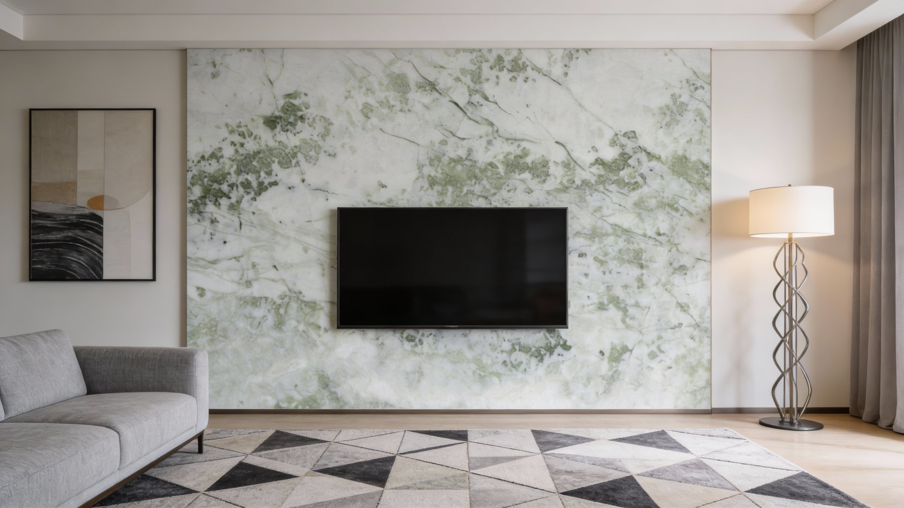### 一、底色基调 这款石材的底色以**柔和浅灰白色**为基底,其间隐约晕染着淡淡的青绿色调,整体基调清新雅致,如同清晨薄雾笼罩的青石板,柔和不刺眼。浅灰与青绿的融合自然含蓄,既保留了石材的干净通透感,又因青绿色的点缀增添了生机与温润气息,给人宁静舒缓的视觉感受。### 二、纹理形态 纹理呈现**自然随性的散点与脉络交织状**: - 青绿色纹理以不规则斑块与纤细线条并存,斑块大小不一、或聚或散,似雨后青苔散落于石面; - 纤细的脉络状线条蜿蜒舒展,如天然石材的原生肌理,无刻意雕琢感,流动且富有层次; - 整体纹理分布疏密有致,既有局部的集中点缀(如右下角的团状青绿),又有大面积的疏朗留白,避免了视觉拥挤,展现出天然石材的原生韵律感。### 三、细节质感 从视觉质感看,石材表面**细腻温润**: - 底色与青绿色纹理的过渡自然柔和,边缘处晕染交融,无生硬界限,似水墨淡彩般雅致; - 推测其物理质感为光滑细腻(经打磨后),青绿色区域的质感略显厚重,与浅灰白基底形成微妙的视觉对比,兼具石材的坚实感与玉石般的温润光泽,触摸时应能感受到细腻顺滑的触感,适合营造自然质感的空间氛围。