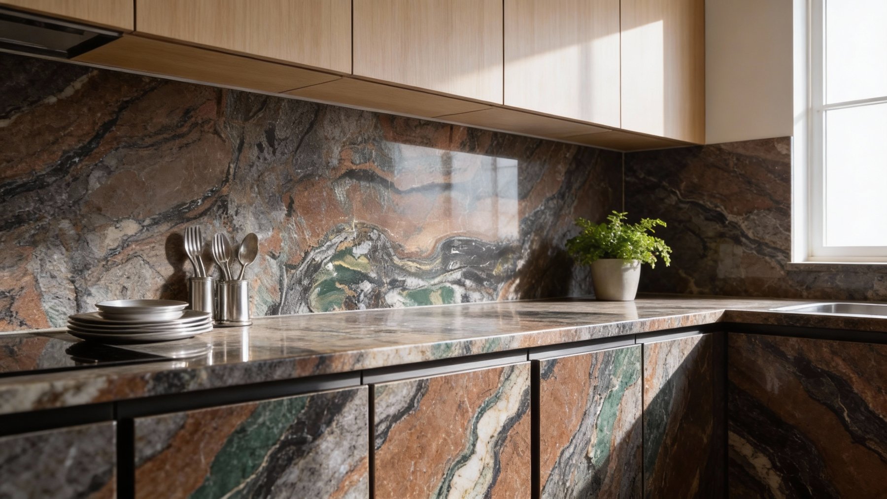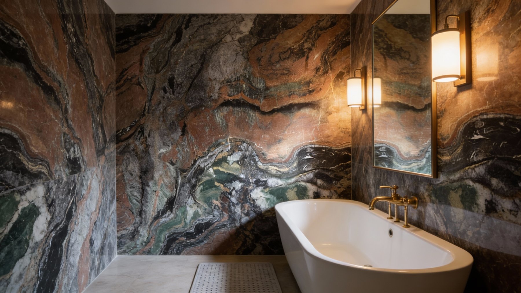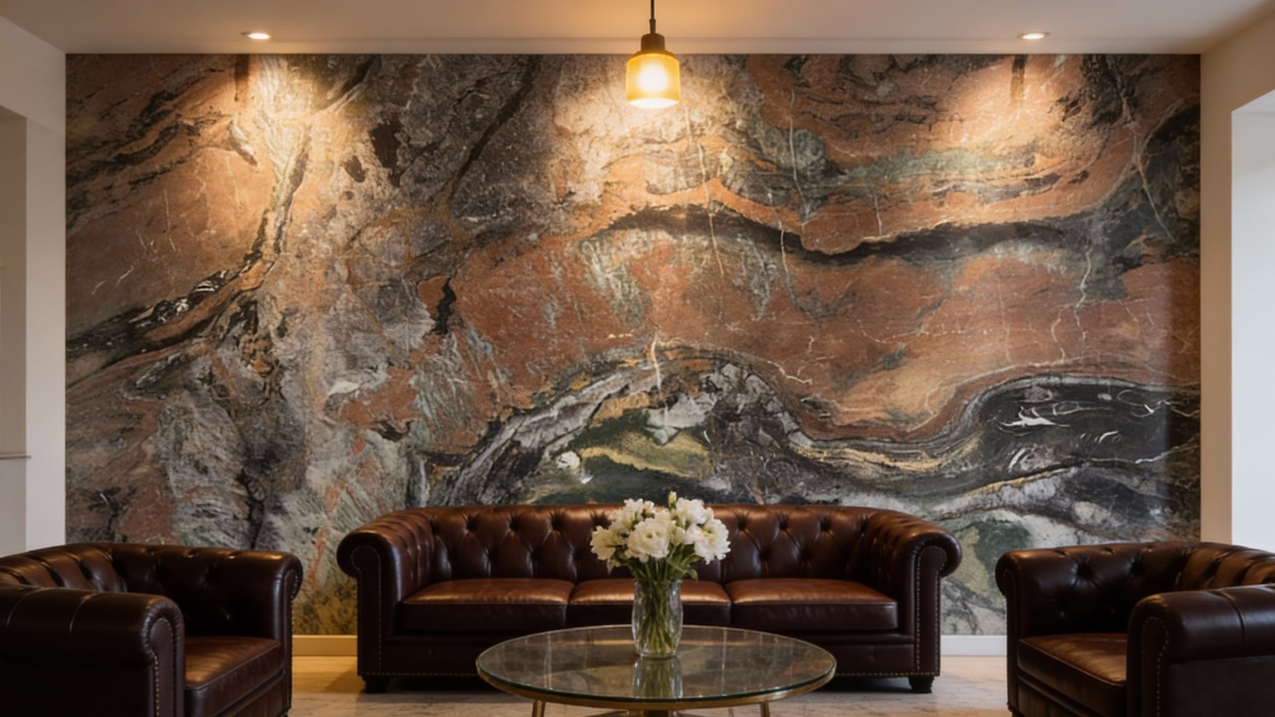 ### 底色基调 石材底色以**深灰与墨黑交织的沉稳冷调**为基底,间杂大面积暖调的**红褐色与赭石色区块**,形成冷暖色彩的碰撞与层叠。冷色基底奠定了整体的厚重质感,暖色区块则增添了视觉温度,二者自然过渡,构建出丰富且有张力的色彩层次。### 纹理形态 纹理呈现**自然蜿蜒的层理状与流动晕染感**:红褐色暖调区块中,深灰纹理如地质褶皱般缠绕穿插,线条粗细错落;下部深色区域则交织着**白色、浅绿的流畅曲线**,似水墨晕染的灵动韵律,又仿岩层挤压形成的自然肌理。整体纹理无规则却和谐,带着动态的流动感,仿佛记录了地质运动的自然轨迹。### 细节质感 表面兼具**细腻颗粒感与温润抛光光泽**:红褐色区域可见细微矿物颗粒的哑光质感,隐约透出自然的肌理起伏;深色基底中夹杂半透明的**白色石英细脉**,带有结晶般的亮泽点缀;整体触感平滑却暗藏层次变化,既保留了石材的坚硬厚重属性,又因色彩与纹理的细腻过渡,透出自然石材独有的温润精致感。