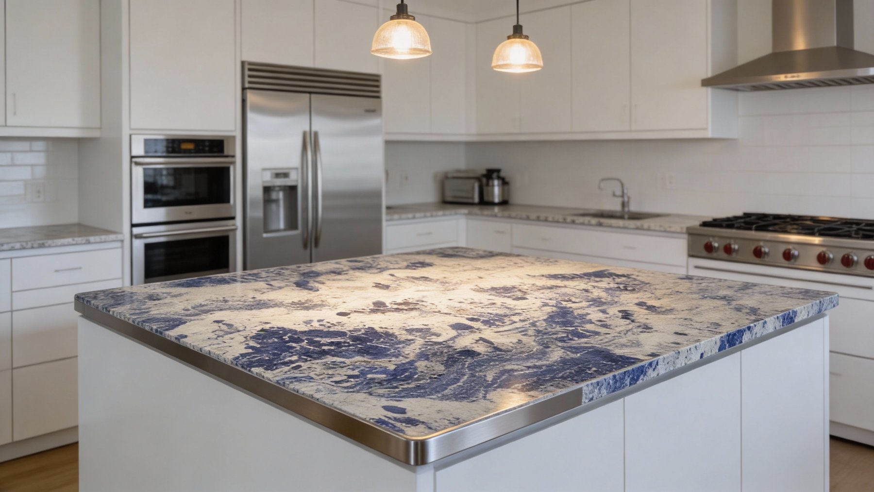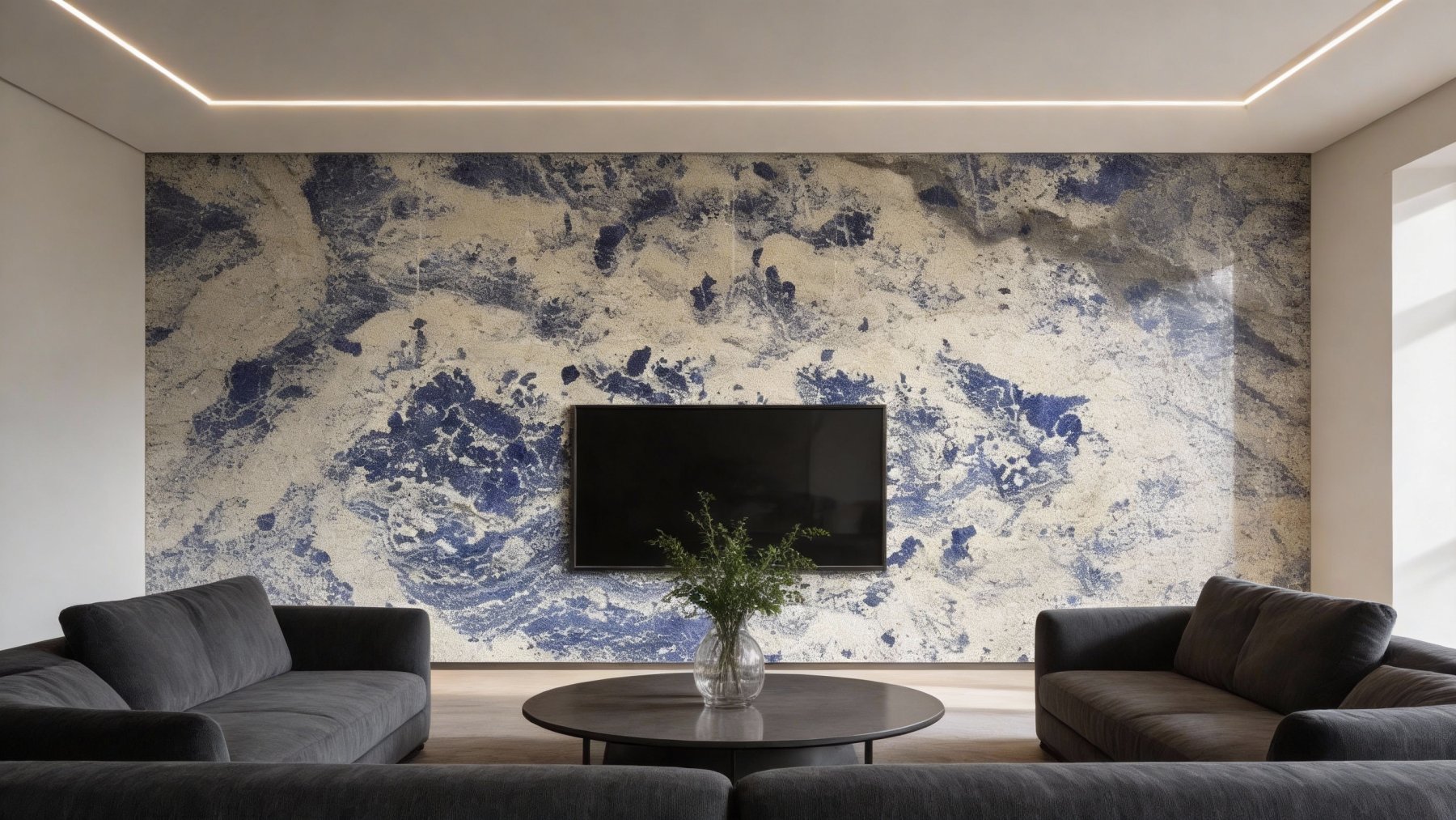 ### 底色基调 石材底色以**柔和的浅米色**为主调,略带暖调质感,如淡奶油般温润雅致,既不会过于艳丽抢眼,也不会显得沉闷单调,为整体纹理提供了清新自然的“画布”,奠定了温润舒适的视觉基底。### 纹理形态 纹理核心为**深邃的靛蓝色**,呈现出**自然流动的脉络与不规则斑块交织**的形态: - 大块浓郁的蓝紫色团状纹理似云雾翻涌,舒展且富有张力; - 细碎的点状、丝状纹路如墨汁晕染般散布,疏疏密密间毫无刻意雕琢感; - 深浅纹理相互缠绕、渗透,形成层次丰富的视觉层次,尽显天然石材的随性与灵动,仿佛将山水水墨的意境凝于石上。### 细节质感 表面质感**光滑莹润**,却因纹理的色彩与形态变化藏着微妙细节: - 深蓝色区域色泽饱满醇厚,似沉淀了岁月的厚重感; - 浅米色基底细腻致密,触感应是温润亲肤; - 纹理的起伏与色彩深浅形成了视觉上的立体感,既保留了天然石材的原始肌理韵味,又通过精细打磨呈现出精致高级的格调,整体质感兼具自然野趣与雅致轻奢。