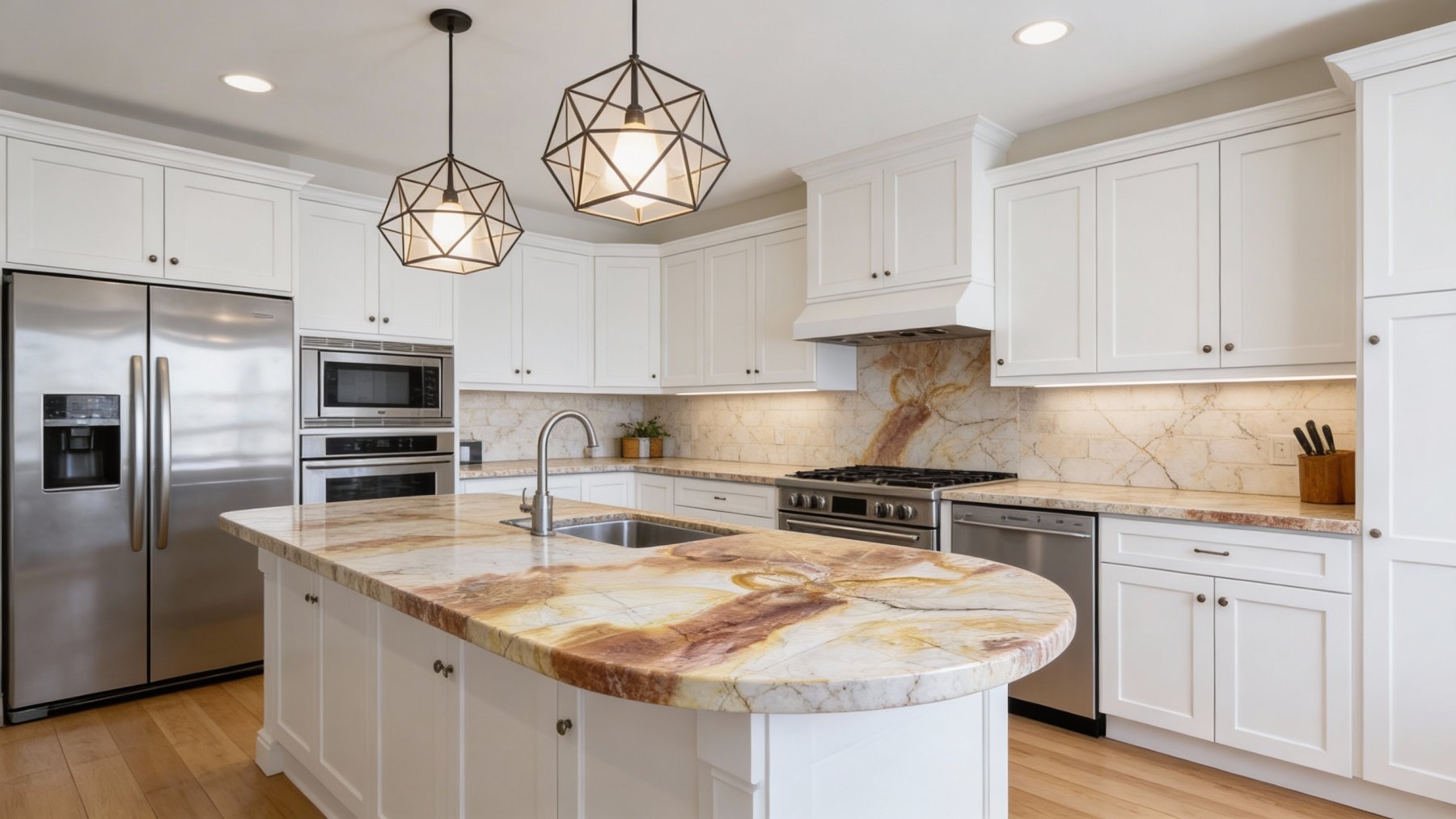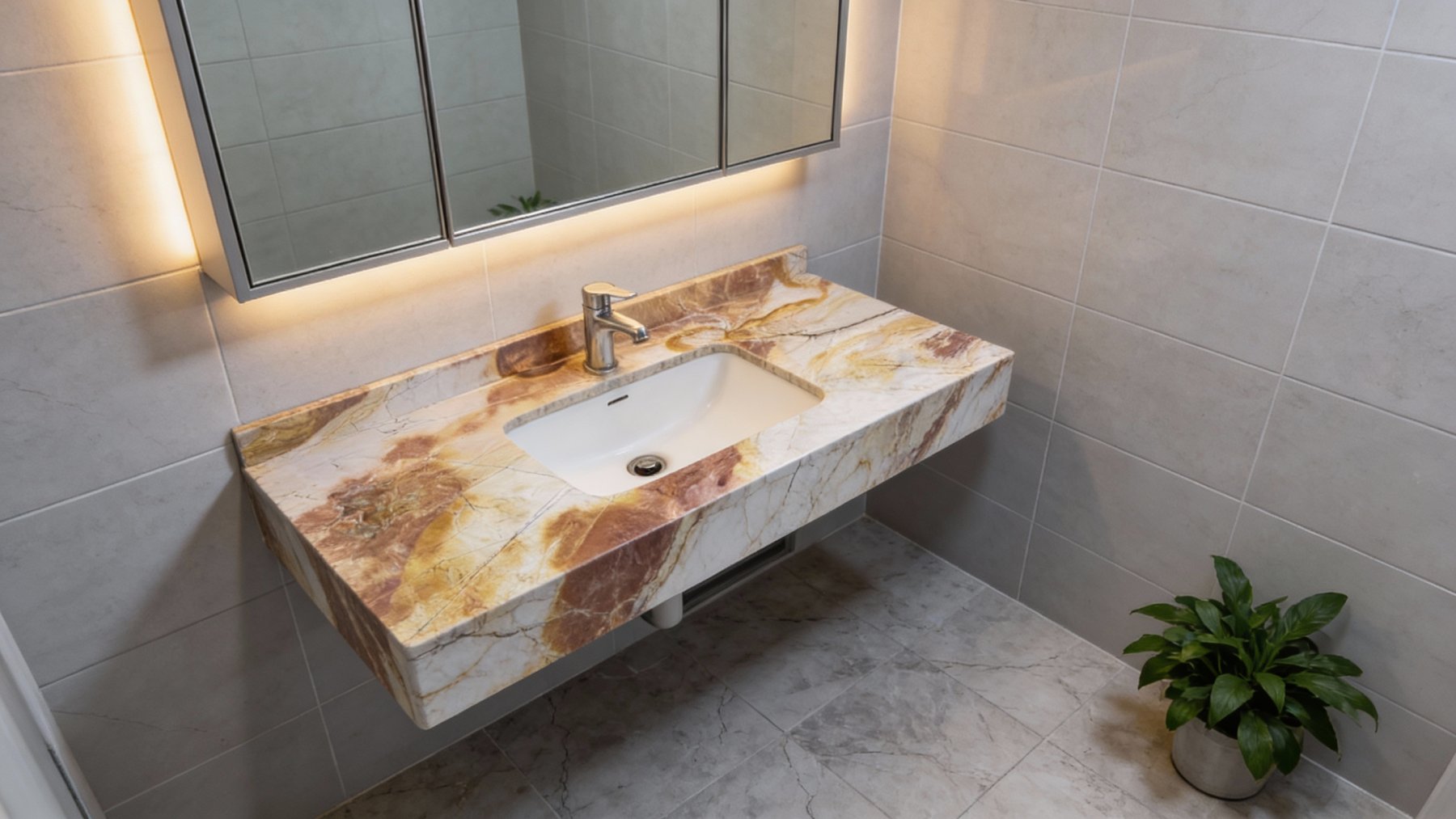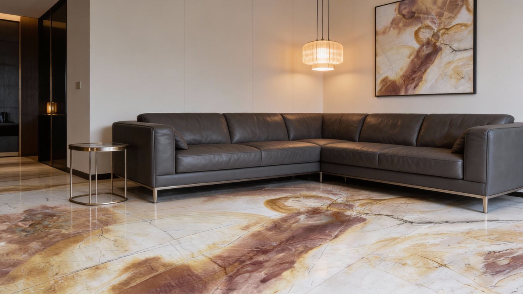 ### 底色基调 以柔和的浅暖白为基底,基调温润淡雅,如同清晨薄雾笼罩下的奶油色,自带朦胧通透感,为后续纹理的铺陈提供了干净且富有呼吸感的背景,整体色调偏向暖调,不刺眼却足够治愈,奠定了石材雅致柔和的整体气质。 ### 纹理形态 纹理呈现自然流动的晕染质感,深浅不一的赭石棕、蜜糖金与焦糖褐交织分布:既有大块面的色斑如云朵般舒展,边缘晕染模糊,似水墨泼洒后的随性;又有细密的脉络状线条如天然石纹般穿插其间,或粗或细、或断或连,如同大地深处的肌理脉络。整体形态自由随性,似山水写意的淡彩晕染,又似时光沉淀下的大地纹路,层次丰富且富有动态韵律,无刻意雕琢的痕迹,尽显自然天成之美。 ### 细节质感 表面质感细腻温润,带有天然石材特有的柔和光泽(非镜面高光),触感应是平滑细腻的。浅色基底处可见极细微的肌理纹路,似蚕丝般若隐若现;深色纹理区域颜色浓郁饱满,边缘过渡自然,部分色块呈现出半透明的温润感,如琥珀般通透;线条状纹理则增添了细节的精致度,似石纹脉络般清晰却不尖锐。整体视觉上兼具细腻与厚重感,既有天然石材的古朴斑驳,又不失雅致温润的格调,尽显自然造物的精致与大气。