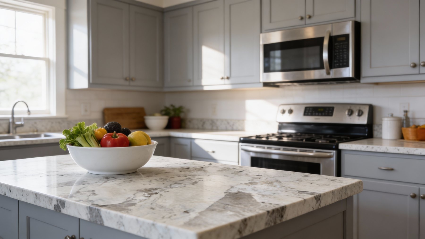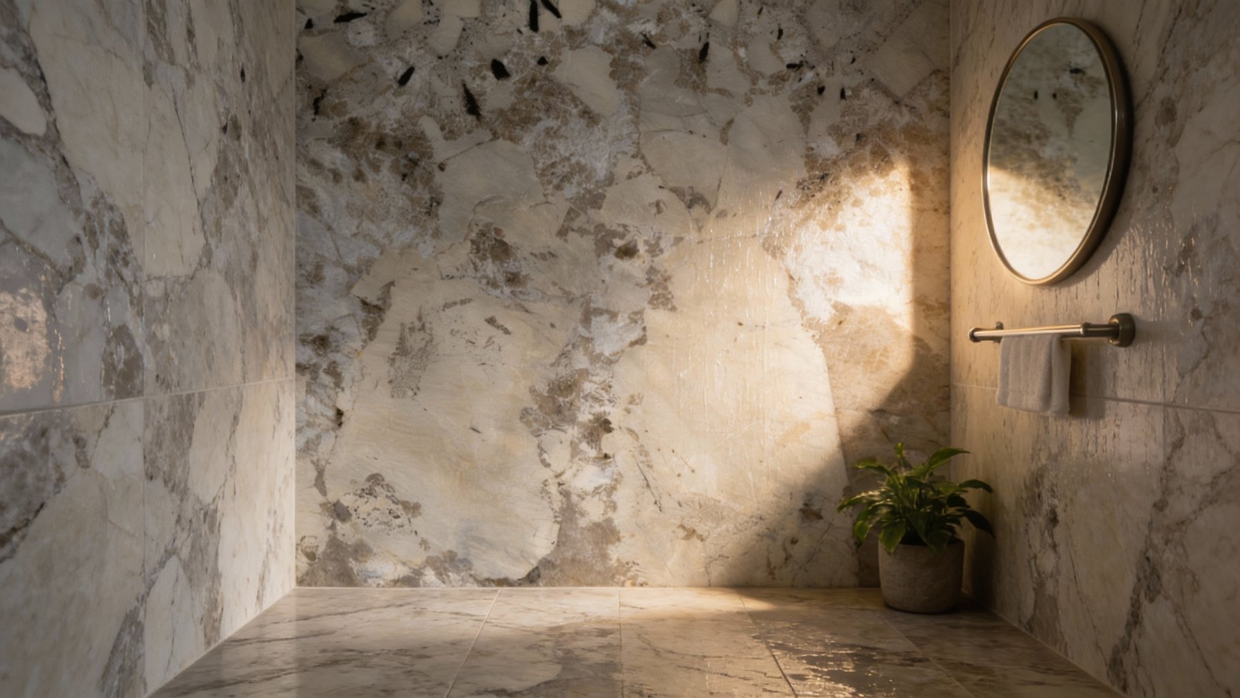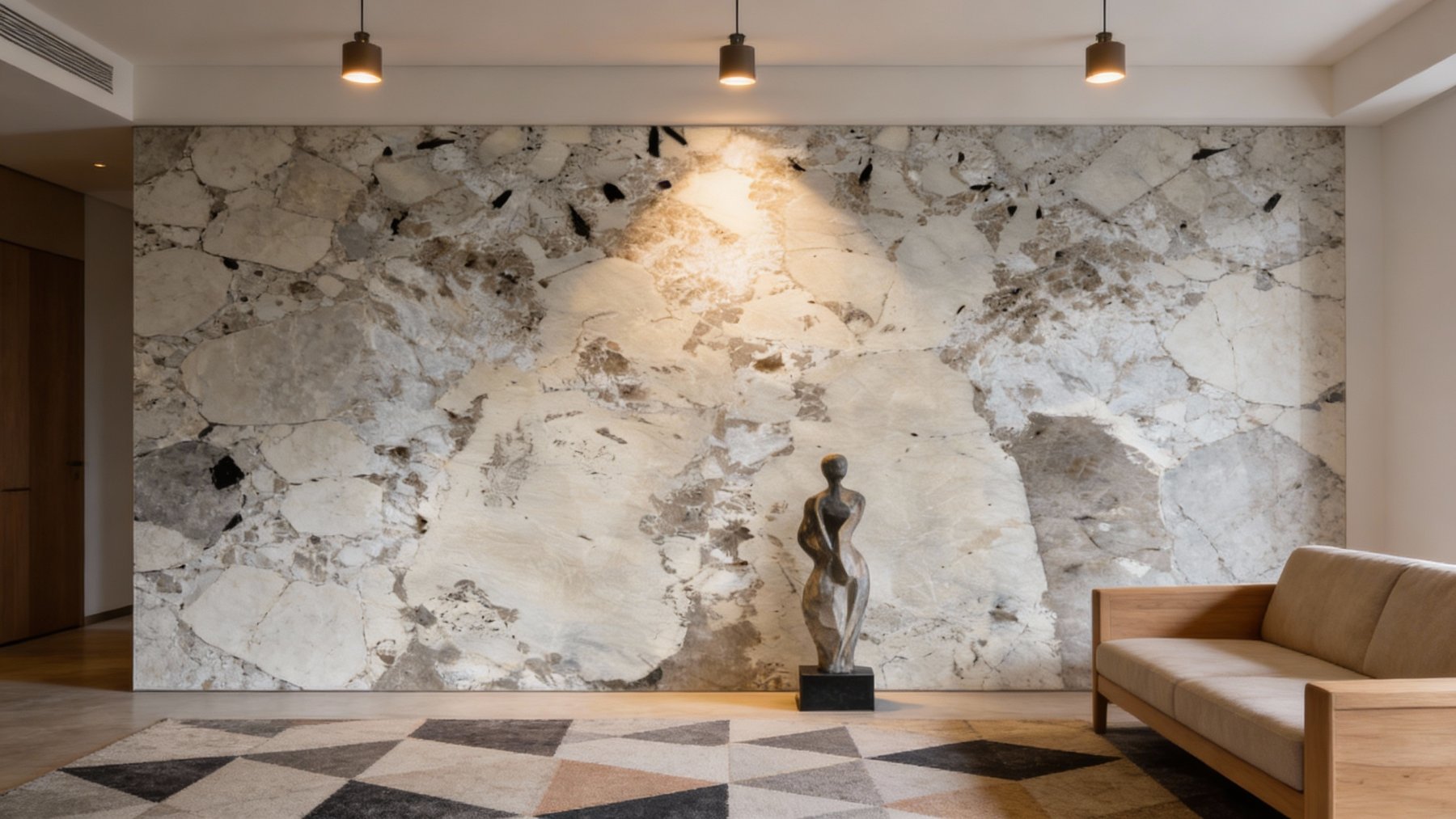 ### 底色基调 以**浅灰白色**为主基调,融合了米白、浅褐等柔和过渡的暖调色彩,形成淡雅温润的基底。整体色调无强烈对比,色彩间自然晕染,呈现出静谧、柔和的视觉感受。### 纹理形态 纹理呈**自然斑驳的有机形态**:大块浅灰白色与米白色块相互交织,边缘模糊且过渡自然;其间点缀着稀疏的黑色细针状纹理及细小斑点,如同天然矿物结晶;同时穿插着浅灰褐色的脉络状纹理,似自然肌理的“血管”般散布。整体纹理无明显规律,展现出天成的随机感与层次感。### 细节质感 表面质感**细腻温润**:浅色区域平滑细腻,触感应偏向温润(若为抛光处理则带柔和光泽);黑色细针纹与浅褐脉络增添了细节的颗粒感与层次变化,打破单调。视觉上既有天然石材的质朴厚重感,又因色彩的丰富变化与细节点缀,透出精致而富有生机的质感。