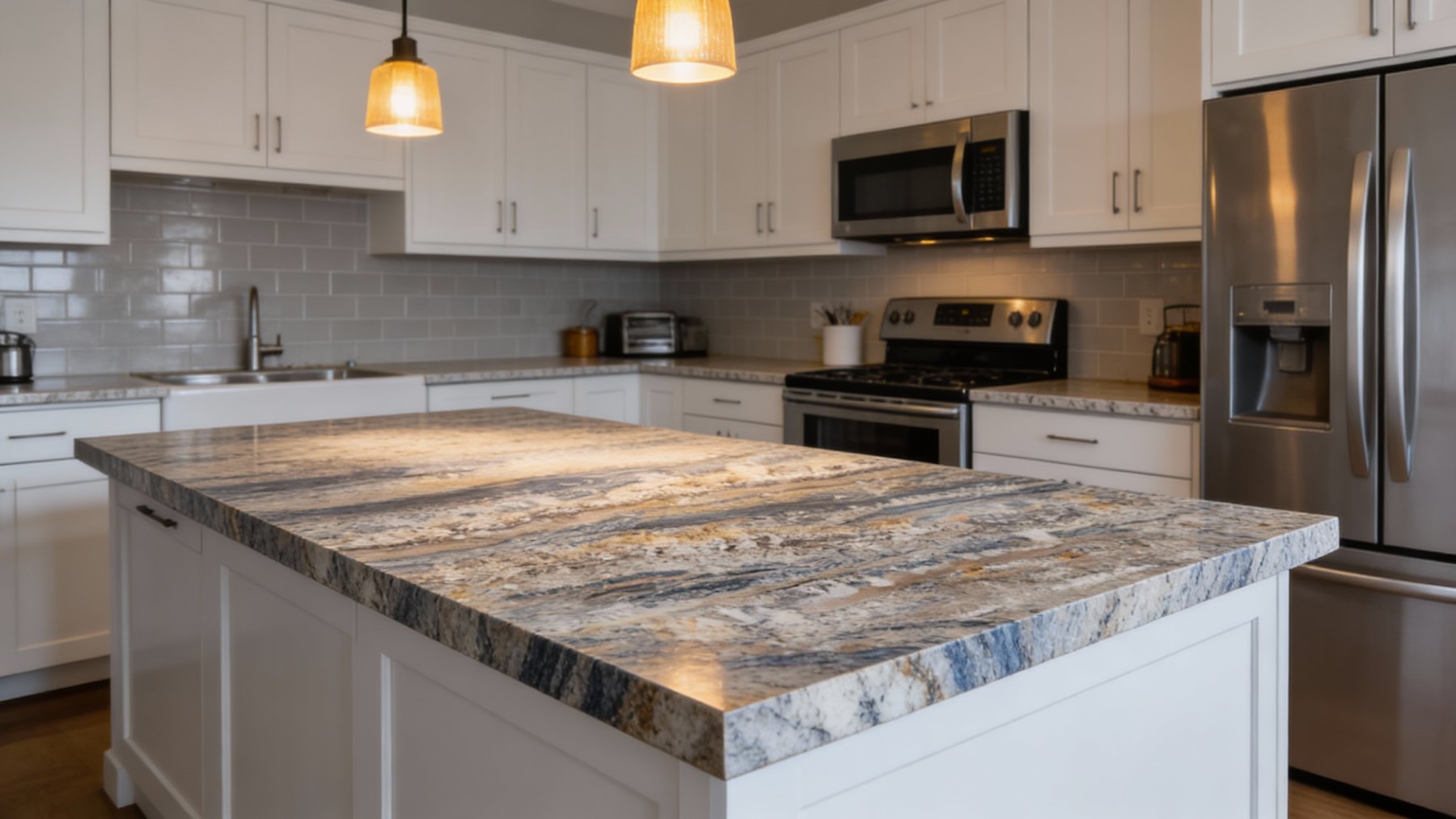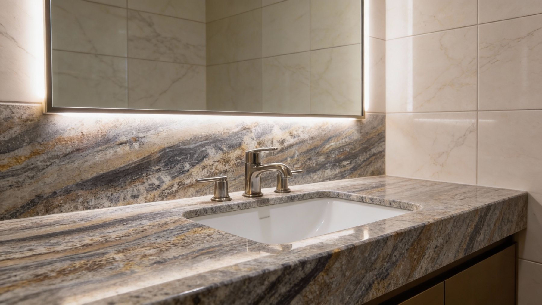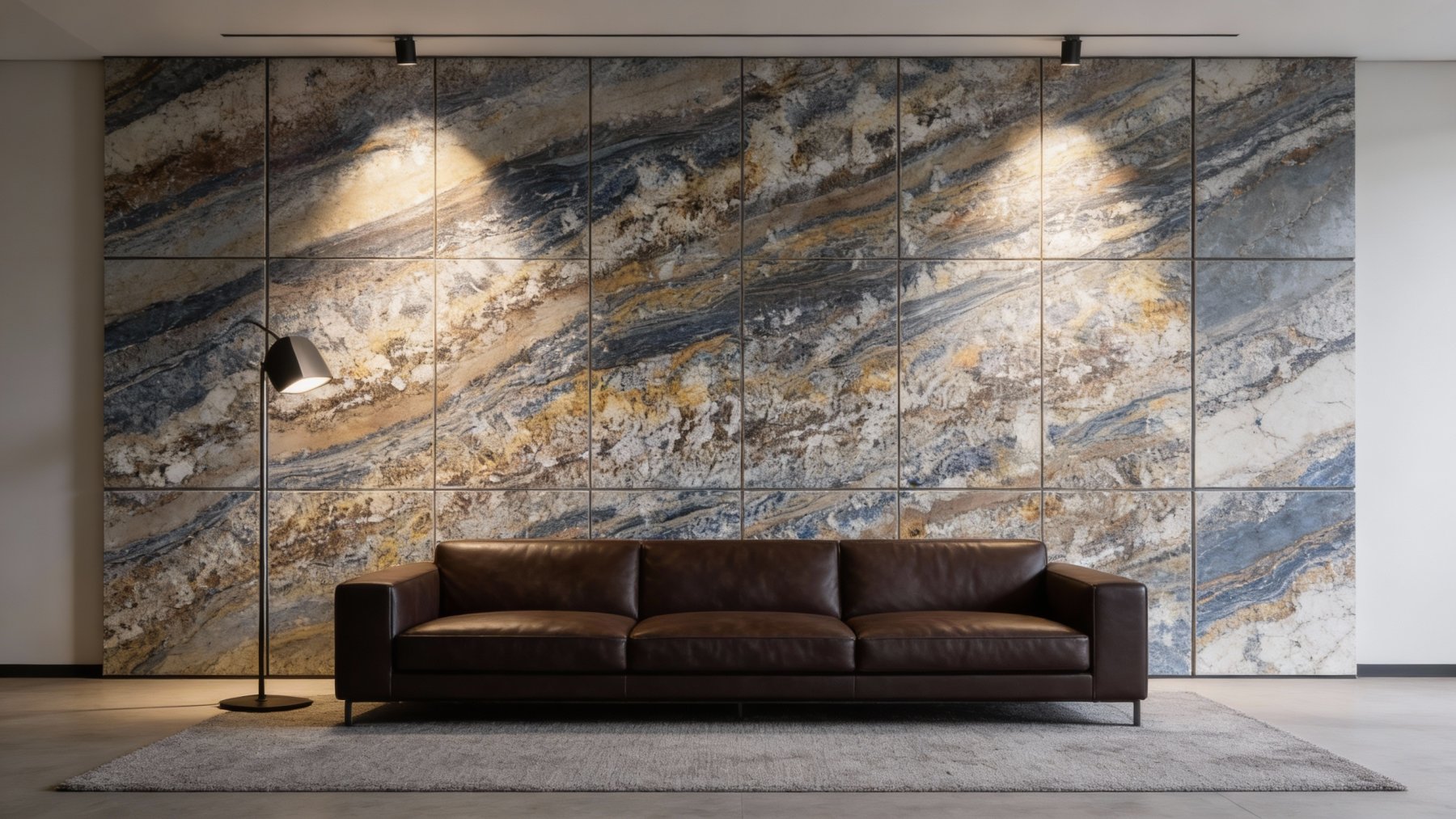 从细节看,石材表面蕴含**天然矿物的细腻颗粒感**,间杂细小的白色晶体斑点与深色条带中的斑驳肌理,触感应是细腻中带着轻微的天然纹理起伏;视觉上呈现**哑光或半哑光的柔和光泽**,既没有过度抛光的刺眼感,又能凸显天然石材的温润厚重——整体质感沉稳却不失精致,既有原始石材的粗犷底蕴,又藏着矿物颗粒的细腻细节,尽显自然高级感。