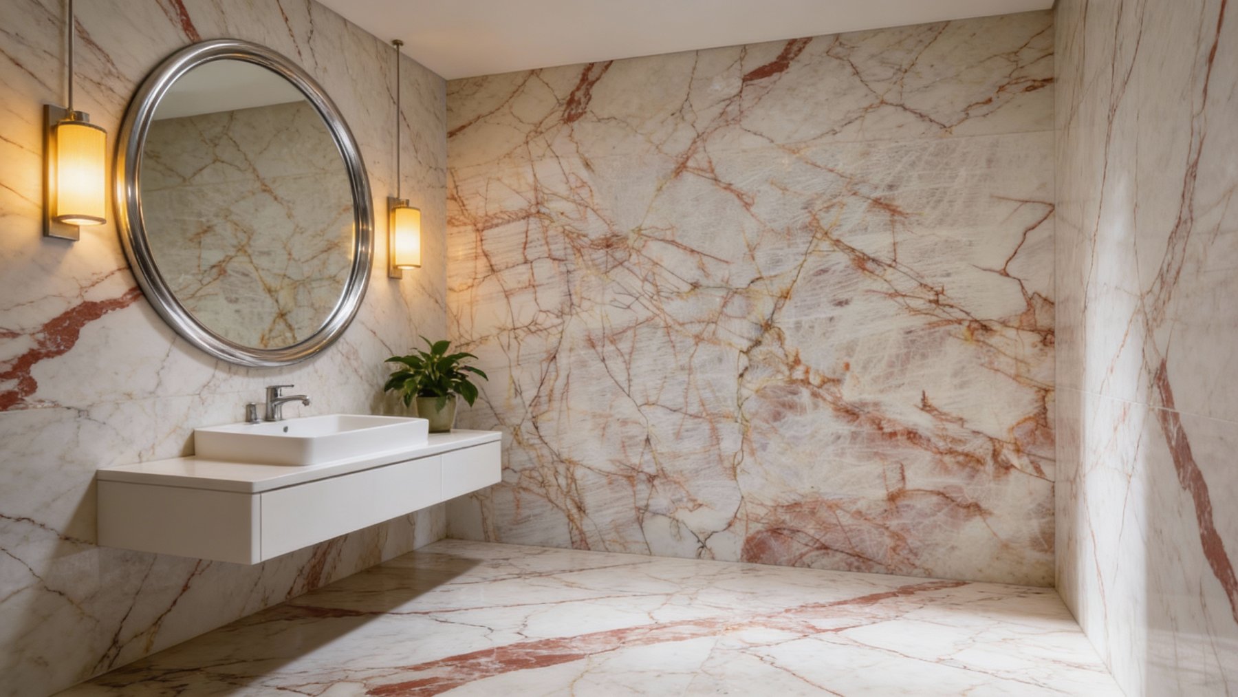 表面质感细腻平滑,带有温润的微光感(非刺眼高光,亦非哑光沉闷);纹理线条边缘过渡自然,部分区域颜色深浅渐变:红棕线条中夹杂浅橙层次,淡金线条与底色柔和融合,基底处还可见细微的天然肌理起伏,而非完全均匀的平面。整体质感层次丰富,视觉上既有纹理的立体脉络感,触摸时又能感受到石材的平滑细腻,尽显天然石材的质朴与精致平衡。