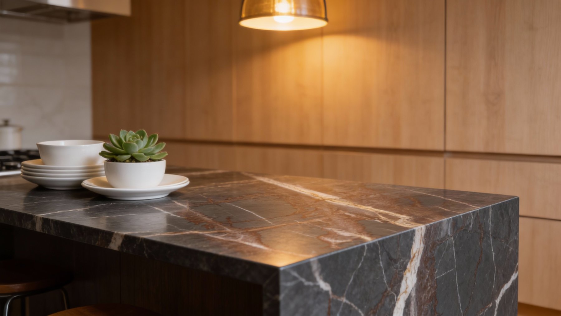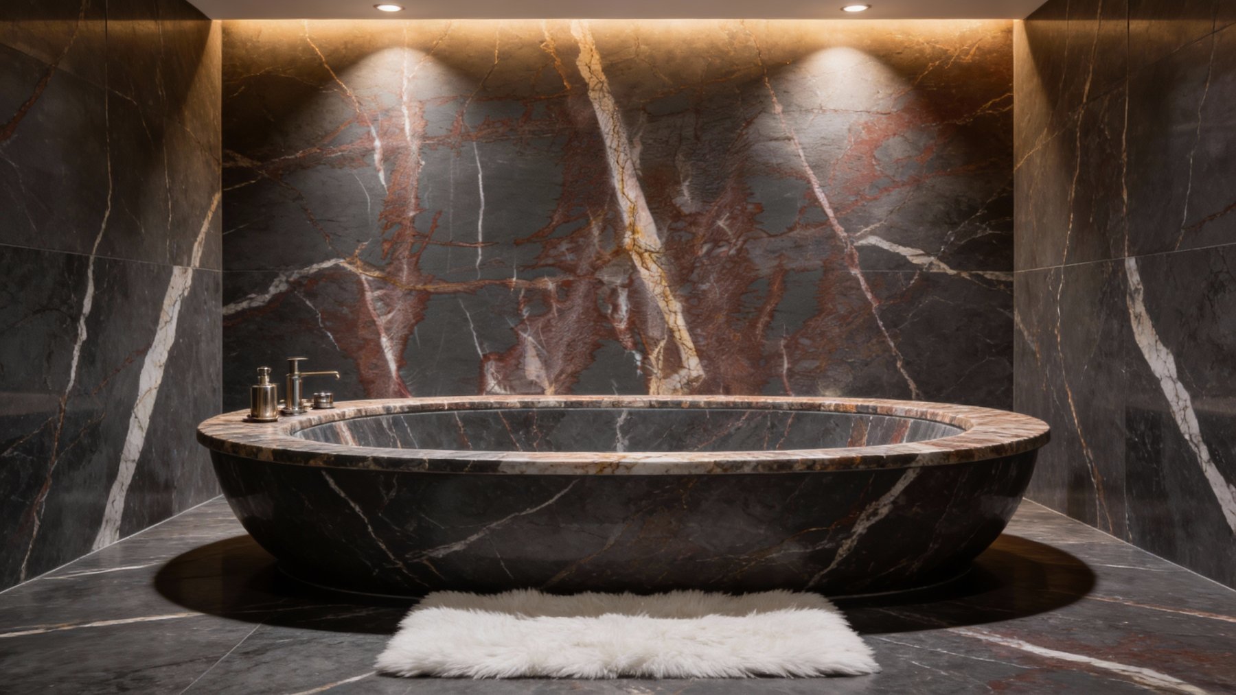 以**深邃的炭黑色与暗灰色**为主色调,局部交织着暗褐色的基底,整体呈现出沉稳厚重的视觉基调。深色底色如同夜幕般静谧,为纹理提供了极具张力的衬托,奠定了石材大气、内敛的质感基础。