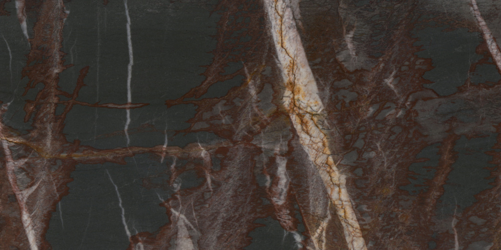 - 同时穿插**深棕色的晕染状纹理**,色彩由深到浅自然过渡,如同墨汁在水中扩散般随性,与白色脉络、黑色底色形成三重色彩对比,整体纹理层次丰富,走势自然无规律,尽显天然石材的野性与独特性。