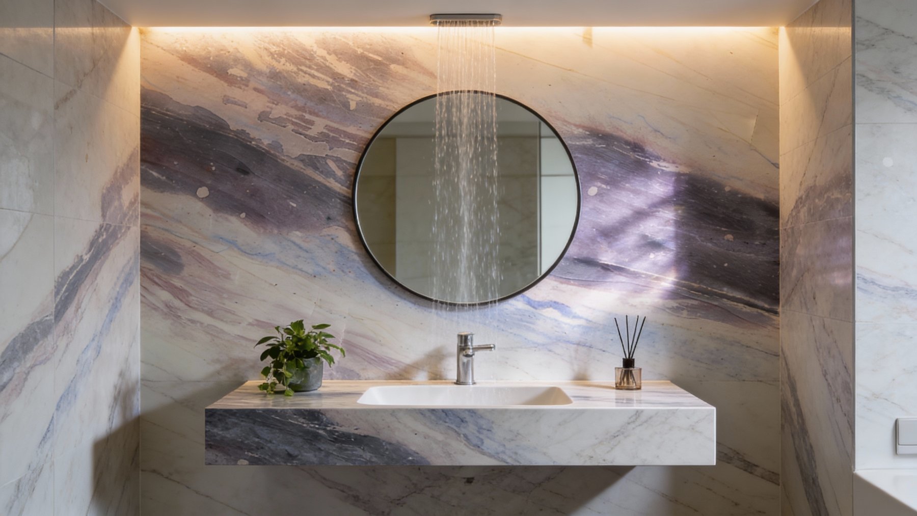 以浅灰与米白为基底,交织着朦胧的淡紫调与淡蓝韵,整体色调柔和雅致。既保留了石材自然沉稳的底色质感,又因低饱和的粉紫与浅蓝点缀,打破了传统石材的冷硬感,增添了一丝温婉灵动的气息,让基底更显层次与温度。