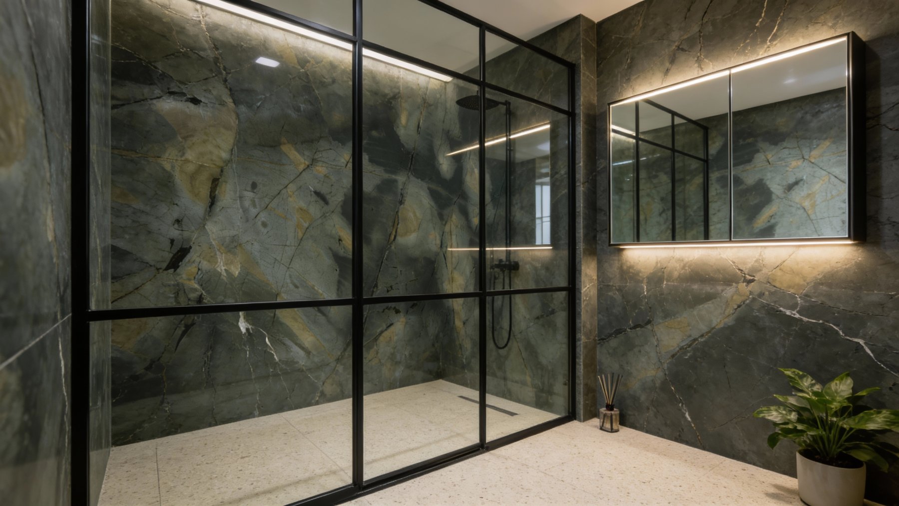 ### 底色基调 以**墨绿与深灰交织的沉稳基底**为主调,色调内敛厚重,似被岁月浸润的岩石肌理,既无鲜亮跳脱的色彩,也非单调的深暗,而是在深浅过渡中藏着自然的层次——墨绿的温润与深灰的冷静相互融合,传递出低调奢华的静谧感,仿佛蕴藏着大地深处的沉淀力量。### 纹理形态 纹理呈**自然不规则的流动脉络状**:墨黑色的斑块如云雾般晕染,浅金色的条状纹理似溪流般蜿蜒穿插,辅以细密的浅灰色裂纹肌理,整体疏密有致、毫无刻意。有的区域纹理集中交错,形成类似山峦叠嶂的层次感;有的区域则留白舒展,让基底色调自然透气,每一处纹理都独一无二,尽显天然石材的鬼斧神工。### 细节质感 表面**细腻温润**,触感应是平滑却略带天然石材的肌理感——非冰冷的镜面光感,而是带着哑光般的高级质感;纹理边缘过渡自然,无生硬切割痕迹:墨绿基底的厚重、浅金纹理的灵动、墨黑斑块的深邃相互映衬,色块间的融合层次分明,视觉上既有“流动感”又不失“厚重感”,触手可及的温润与视觉上的层次交织,尽显天然石材的格调与质感。