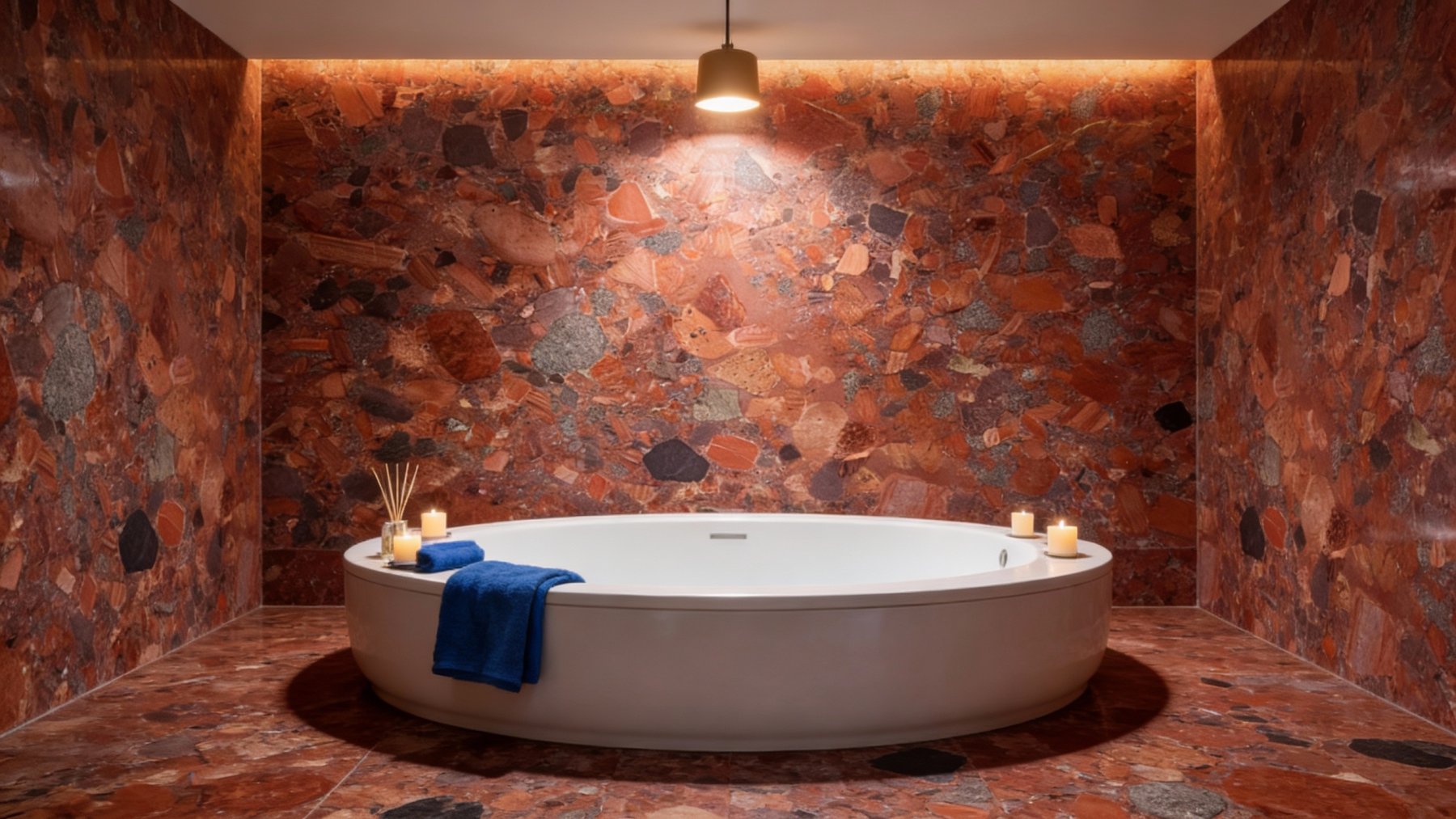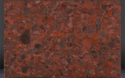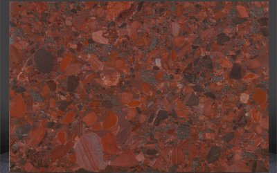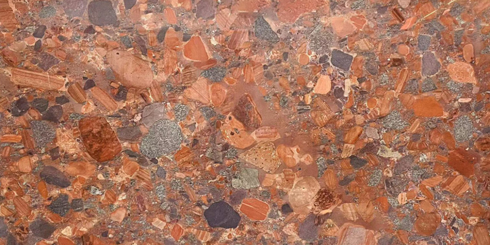 ### 底色基调 这款石材的底色基调以暖色系为主导,融合了浓郁的砖红、醇厚的橙褐与浅棕色调,整体呈现出温暖而厚重的视觉基底。不同暖色块之间相互晕染又界限隐约,既保留了色彩的层次感,又形成了统一的热烈氛围,仿佛是自然沉淀中岁月温度的凝聚,沉稳中透着鲜活的张力。### 纹理形态 纹理呈现典型的**砾岩聚合形态**,大量不规则碎石颗粒镶嵌于基底之中:石块大小错落(小至细碎砂粒,大至拇指般块状),形状多为棱角略显圆润的不规则多边形,彼此紧密拼接却保持独立轮廓。无连续流畅线条,而是充满自然随机的颗粒拼接感,如同大地岩层中凝结的砾石群落,层次丰富且斑驳生动,每一处纹理都是自然随机的独特印记。### 细节质感 细节质感丰富多元:每颗碎石颗粒都有独特色泽与肌理——橙红色颗粒带细微矿物光泽,灰色/深褐色颗粒呈哑光粗糙感,偶尔点缀的深黑色小块添对比张力;颗粒间缝隙填充细腻浅基质,既保留天然砾岩的粗犷凹凸感,又因紧密结合显坚实耐用。触摸可感知颗粒的立体肌理,视觉上则因色彩碰撞与颗粒层次,充满动态细节魅力,兼具自然原始感与质感厚重感。