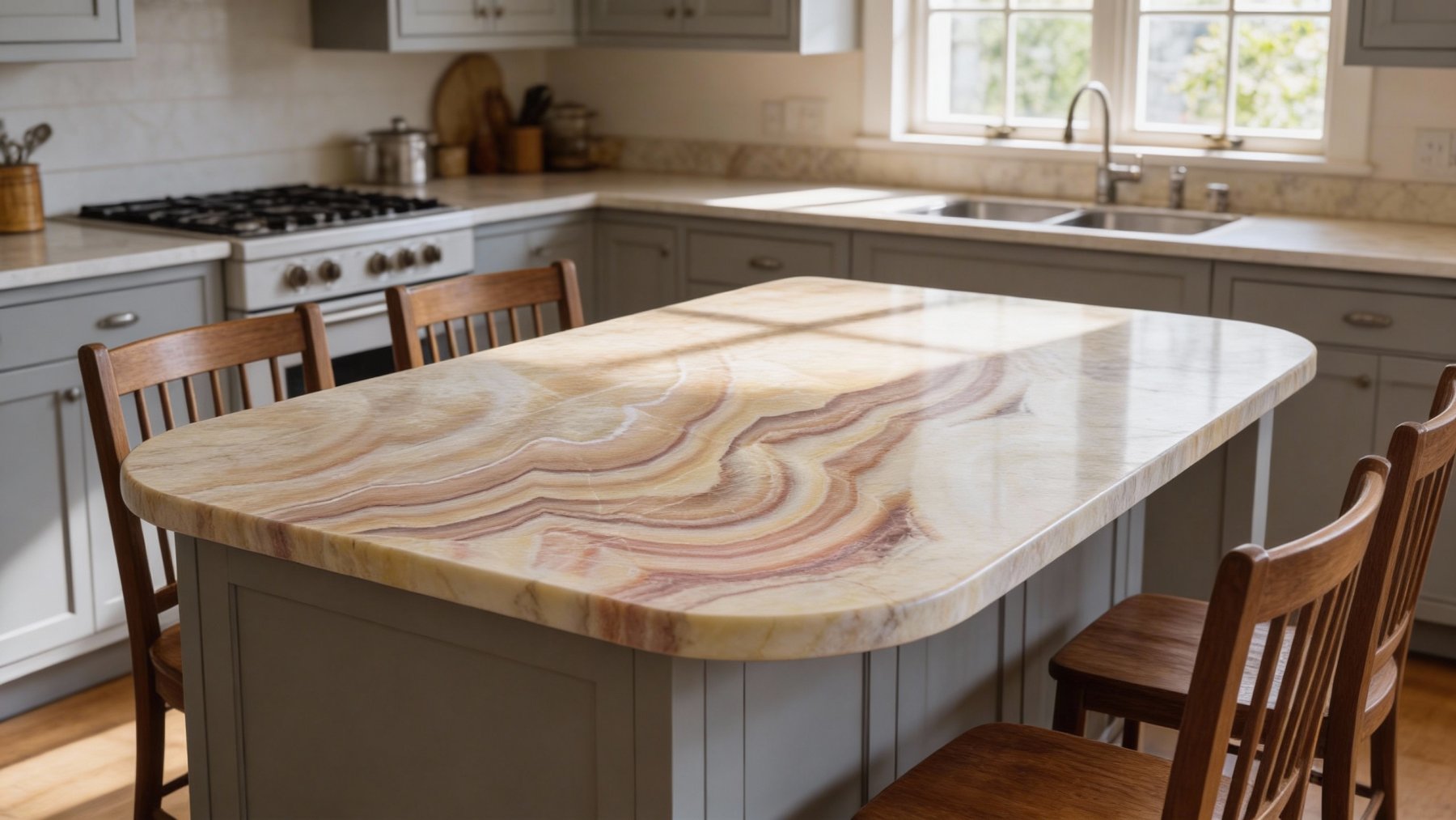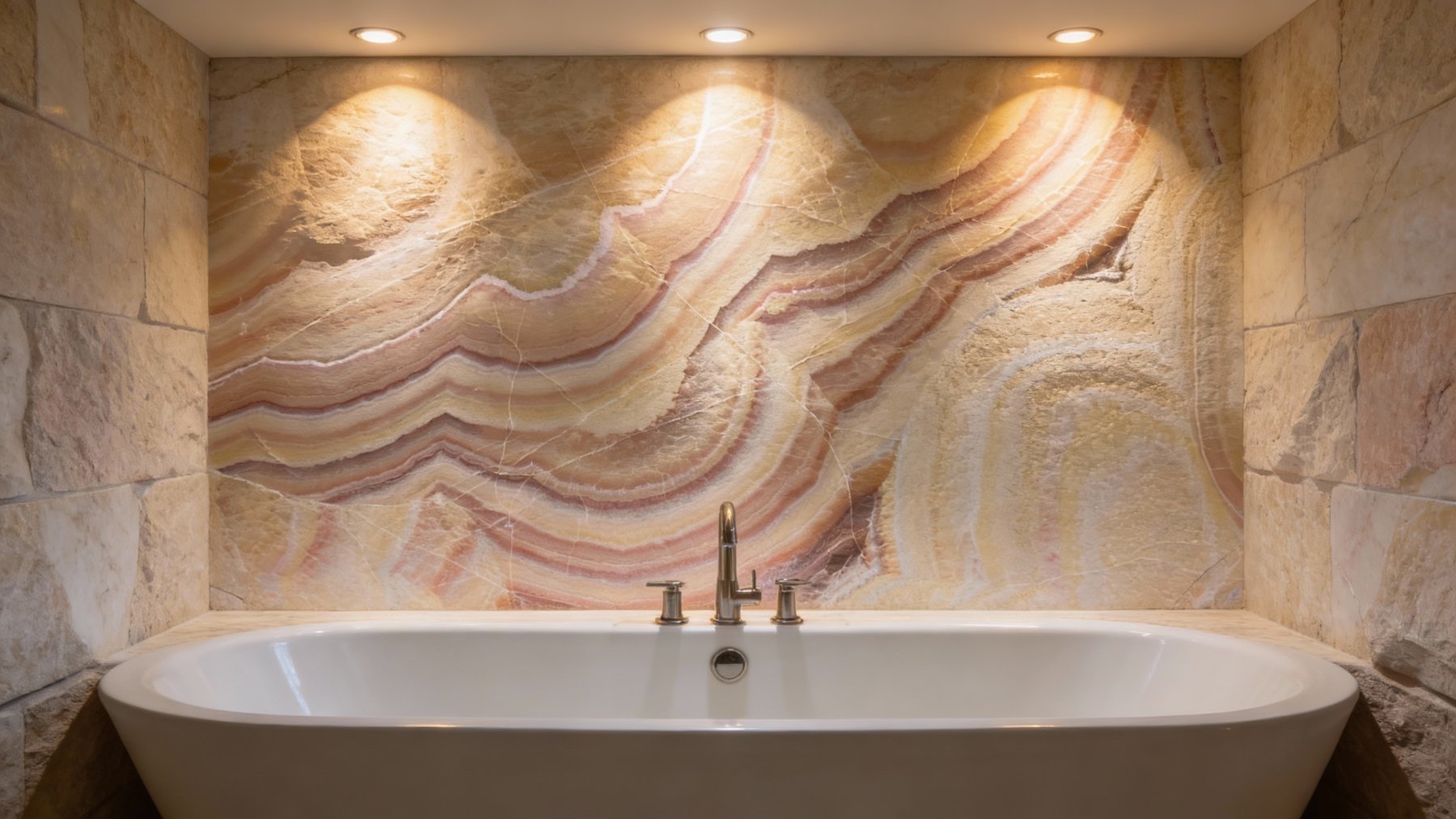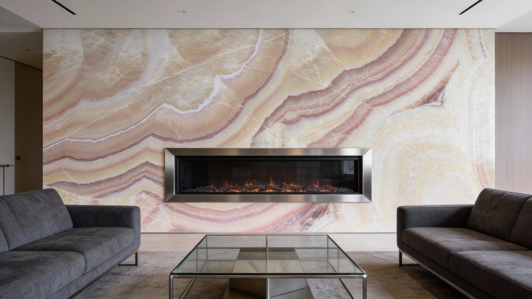 这款石材的底色基调以暖色系为主,融合了柔和的米黄色、浅粉色与淡橙色,整体色调温暖而雅致,仿佛裹挟着阳光的暖意,给人一种舒适、治愈的视觉感受,自带温柔松弛的氛围。