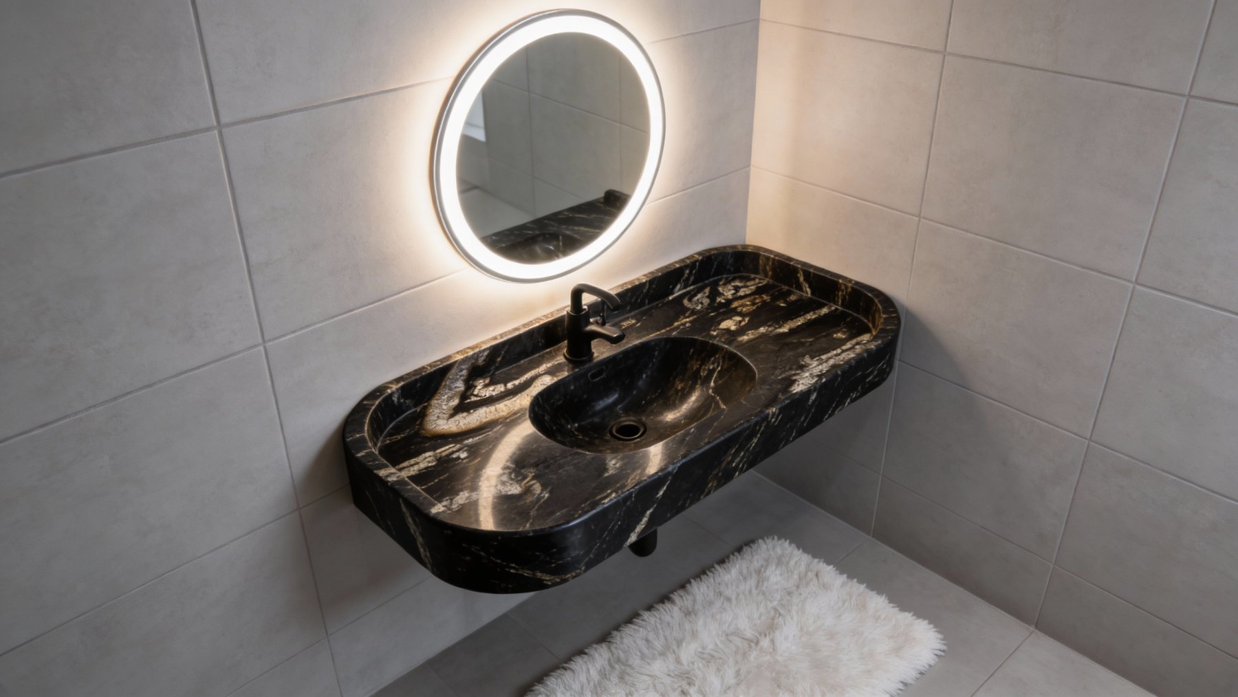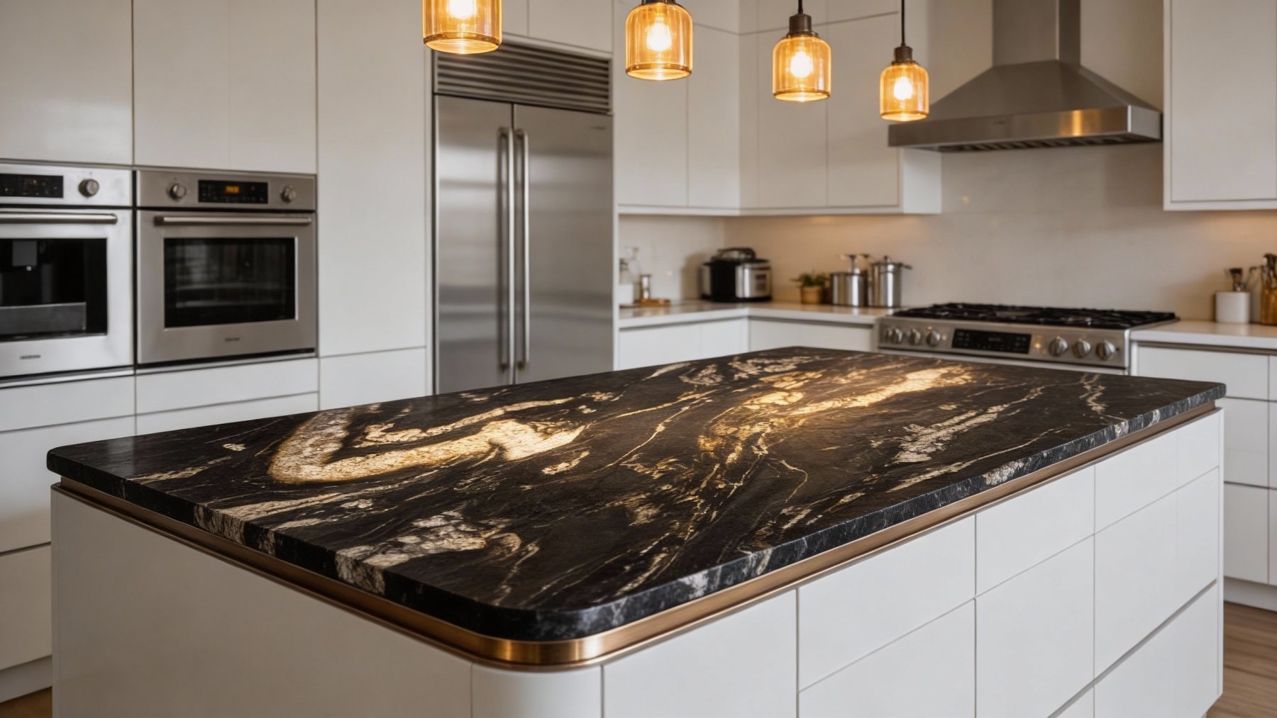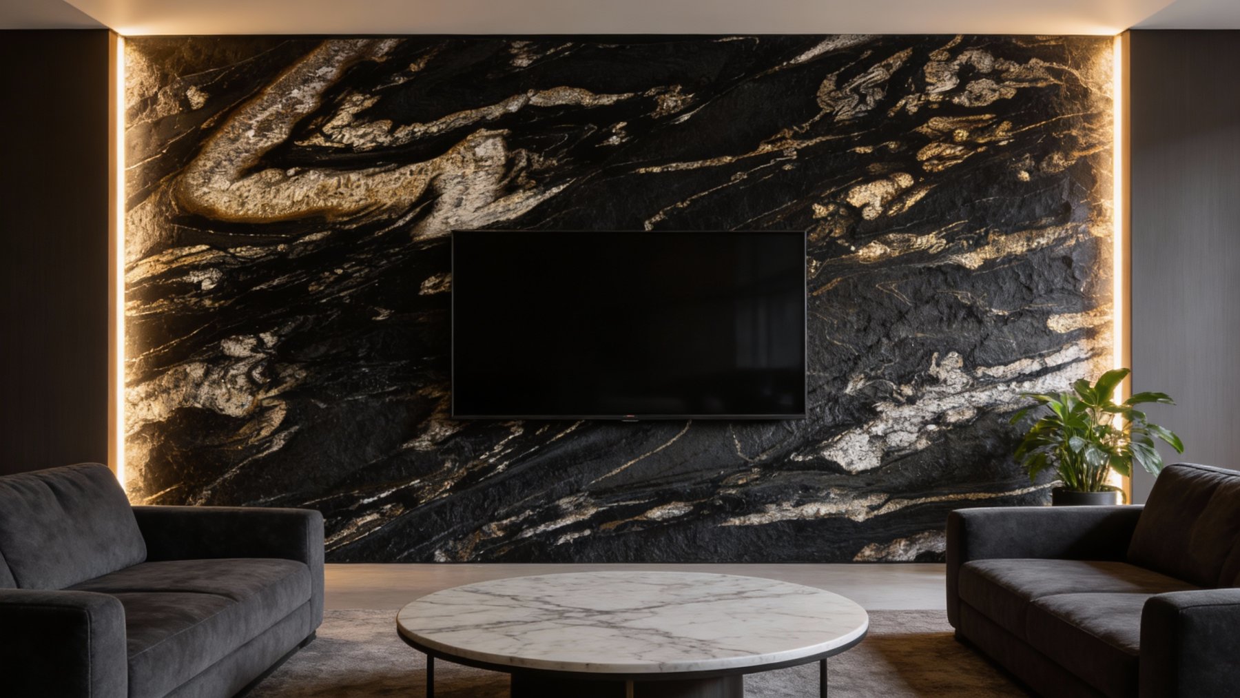 ### 底色基调 底色以**深邃浓郁的墨黑**为核心基调,色泽饱满且富有层次,并非单调的平面黑,而是如夜幕般蕴含着细腻的明暗过渡——局部略带哑光质感的深沉,局部又因光线折射显露出近乎丝绒的温润厚重感,整体散发着静谧、高贵的内敛气质,为纹理的展现提供了极具张力的“画布”。### 纹理形态 纹理以**金黄、浅褐交织的暖色调**为主,呈现出**自然流动的蜿蜒脉络**:线条粗细变幻有致,时而纤细如丝绦般轻盈舒展,时而宽厚如带状般沉稳铺陈,似山间溪流冲刷出的灵动波纹,又若大地肌理中舒展的地质脉络,在黑色基底上交织出不规则却和谐的视觉韵律。纹理无刻意规则感,却暗含天然的秩序——或平行延伸,或交错缠绕,形成“静中藏动”的艺术张力,仿佛将自然亿万年的演化轨迹凝刻其中。### 细节质感 细节处尽显天然石材的精致肌理: - 黑色基底表面**细腻平滑**,触感应是温润且略带哑光的致密质感,无明显颗粒感,却藏着石材特有的坚硬厚重; - 金色纹理部分则蕴含**微妙的结晶光泽**,仿佛细碎的矿物颗粒沉淀而成,在光线下隐约折射出柔和的暖调光晕,纹理边缘与黑色基底过渡自然,无生硬切割感,似天然融合的“金墨晕染”; 整体质感兼具石材的坚固耐用与自然纹理的灵动温润,每一处细微的纹路变化都独一无二,彰显出不可复制的天然魅力。