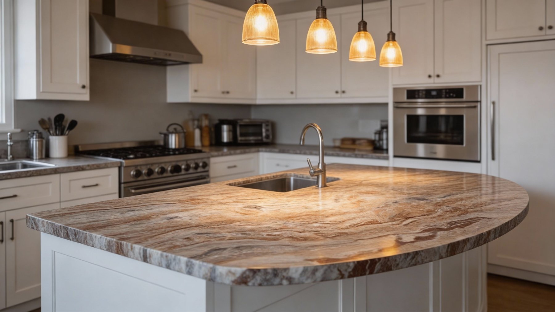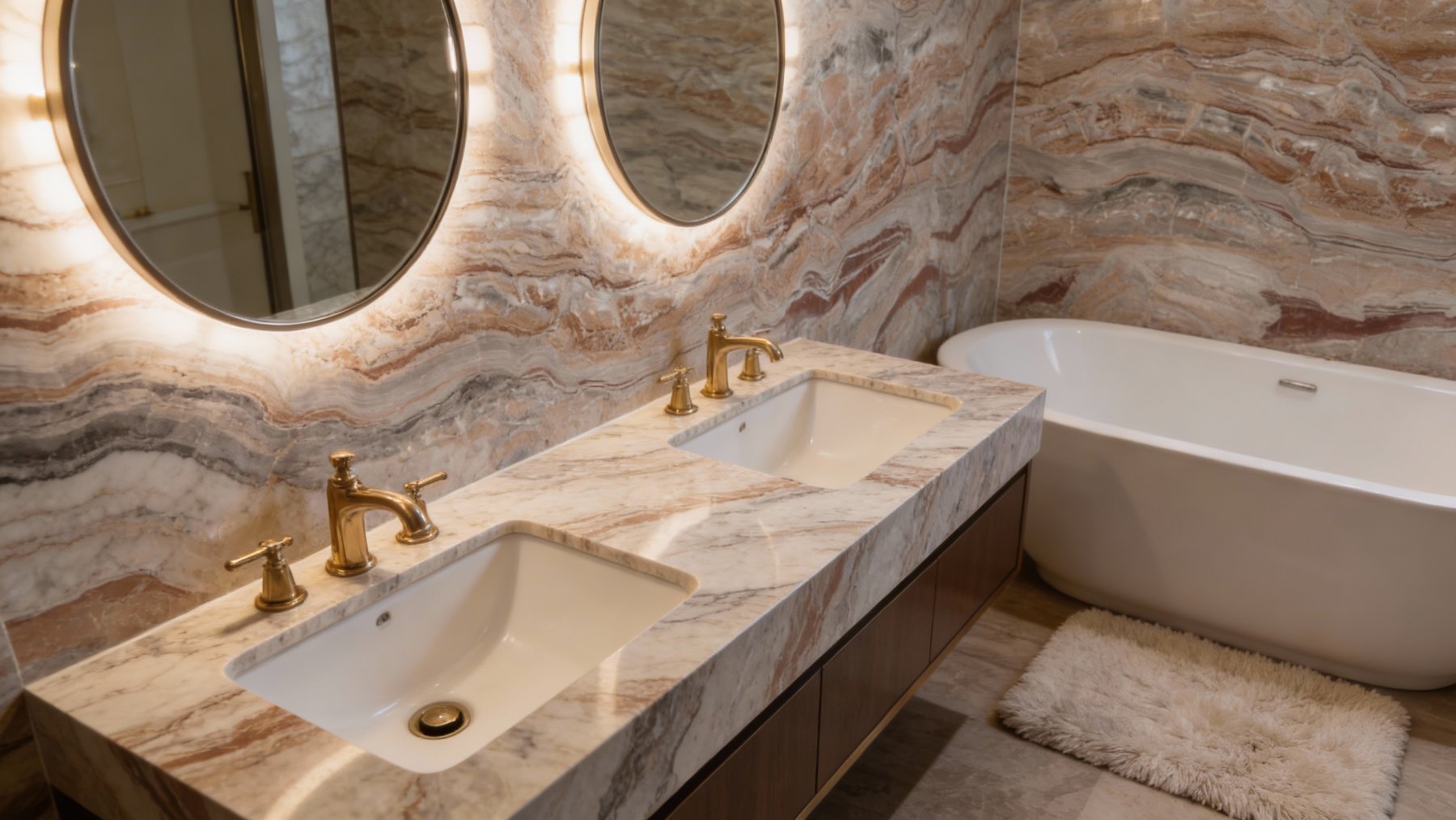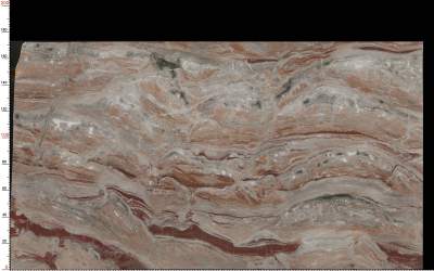 #### 1. 底色基调 以浅灰与米白交织的柔和基底为主调,色调温润不刺眼,既保留了天然石材的素雅感,又为纹理提供了干净的衬托背景,整体基调清新而沉稳。 #### 2. 纹理形态 呈现**层叠起伏的波浪状流动纹理**:深浅不一的红棕色条纹(从浅褐到浓郁红棕渐变)与浅灰米白基底自然交织,如岩层沉积般富有韵律感;局部点缀深灰或近黑色的细小斑点,打破单调感,增加了纹理的层次感与自然变化,仿佛将地质运动的动态轨迹凝固定格。 #### 3. 细节质感 表面细腻温润,带有天然石材特有的柔和光泽(非镜面高光,而是内敛的哑光或半哑光质感);纹理边缘过渡自然,无生硬切割痕迹,尽显天然形成的流畅感;触摸时能感受到细微的纹理起伏——平滑中藏着微妙的肌理变化,既兼具石材的坚固厚重感,又不失雅致温润的触觉体验,整体传递出“自然雕琢、质感天成”的高级感。