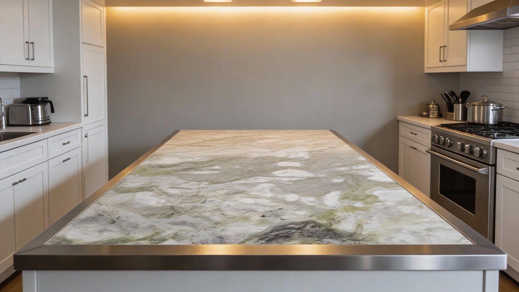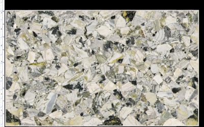 表面经精细抛光处理,触感光滑温润,光泽细腻柔和,尽显石材的致密坚实;纹理边缘过渡自然,无生硬界限,绿色脉络的丝缕感清晰可见,白色斑块则带着细腻的肌理变化,既保留了天然石材的独特性,又通过抛光工艺赋予其精致高级的质感,适合营造轻奢、自然的空间氛围。
