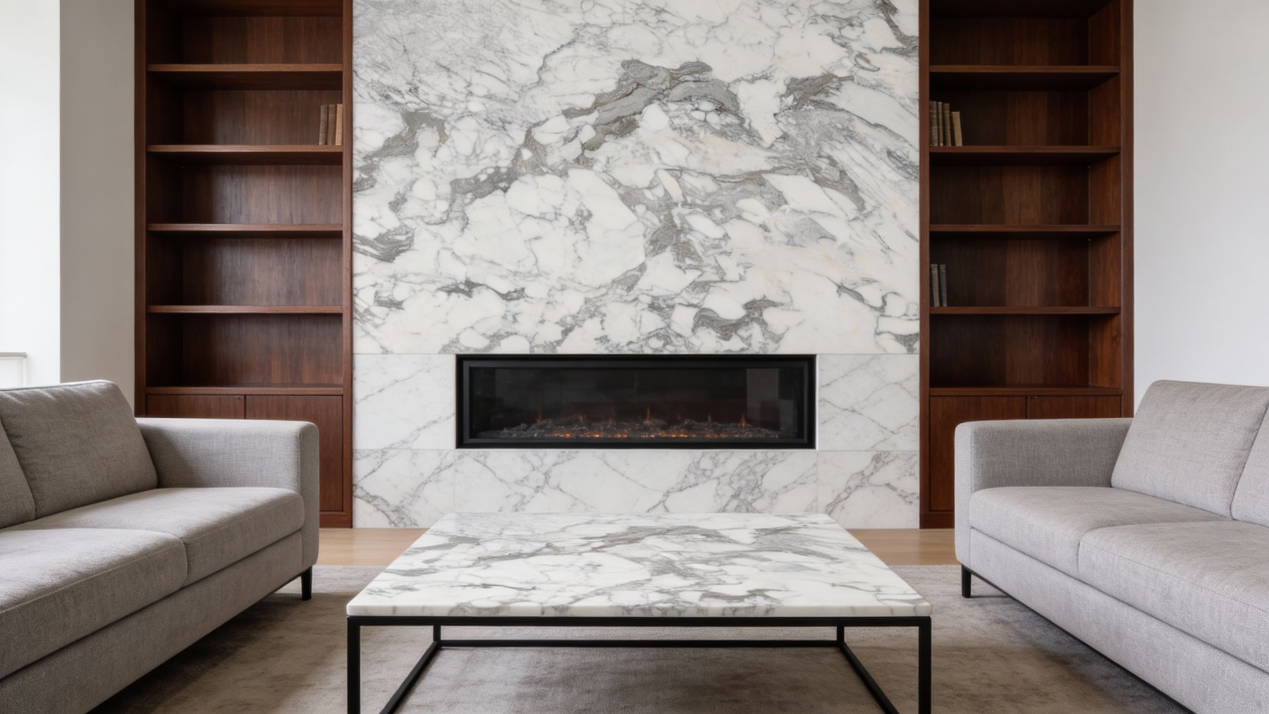 ### 底色基调 这款石材的底色基调为温润的乳白色,基调纯净柔和,略带自然的浅灰白晕染,整体干净通透且不失温润感,既保留了天然石材的原生质感,又为纹理提供了清爽雅致的展示背景,给人以静谧舒适的视觉初印象。### 纹理形态 纹理以深浅不一的灰色为主,呈现出**自然流动的脉络状**。深灰与浅灰交织错落,形态灵动多变:既有蜿蜒舒展的粗条带状纹理,如山水间的溪流般随性舒展;也有细碎朦胧的云雾状浅灰斑块,似烟霞弥散于石面。纹理整体呈不规则的自然走向,起伏蜿蜒中带着动态韵律,层次丰富且无刻意雕琢感,仿佛将自然山水的气韵凝于方寸之间。### 细节质感 石材表面抛光细腻,触感顺滑温润,光泽柔和不刺眼,呈现出高级的柔光质感。纹理边缘既有清晰的线条分割,又有模糊的晕染过渡:深灰色区域质感略显厚重凝练,似墨色沉淀;浅灰色部分则更轻盈通透,如薄雾浮动。整体细节丰富却不杂乱,兼具细腻的触摸感与视觉上的雅致感,既保留了天然石材的肌理温度,又透出精致高级的装饰性。