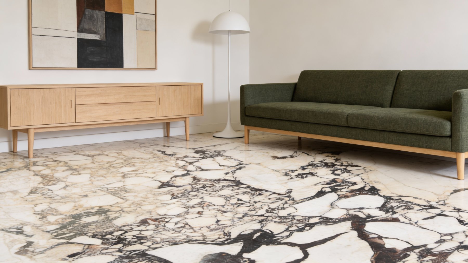 石材的底色基调为**温润柔和的乳白色**,间杂浅米白的微妙层次,整体色调纯净却不刺眼,如同清晨薄雾般轻盈雅致。白色基底并非单调的纯白,而是带有自然石材的细微肌理感,传递出静谧、典雅的氛围。