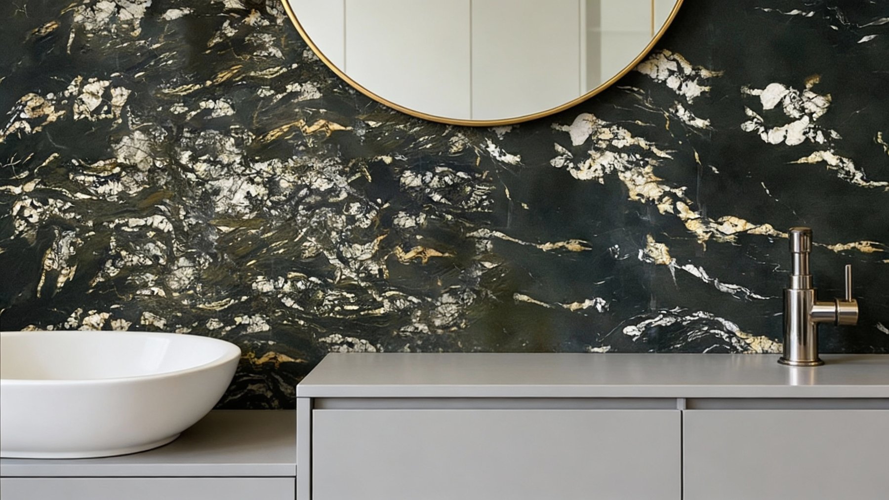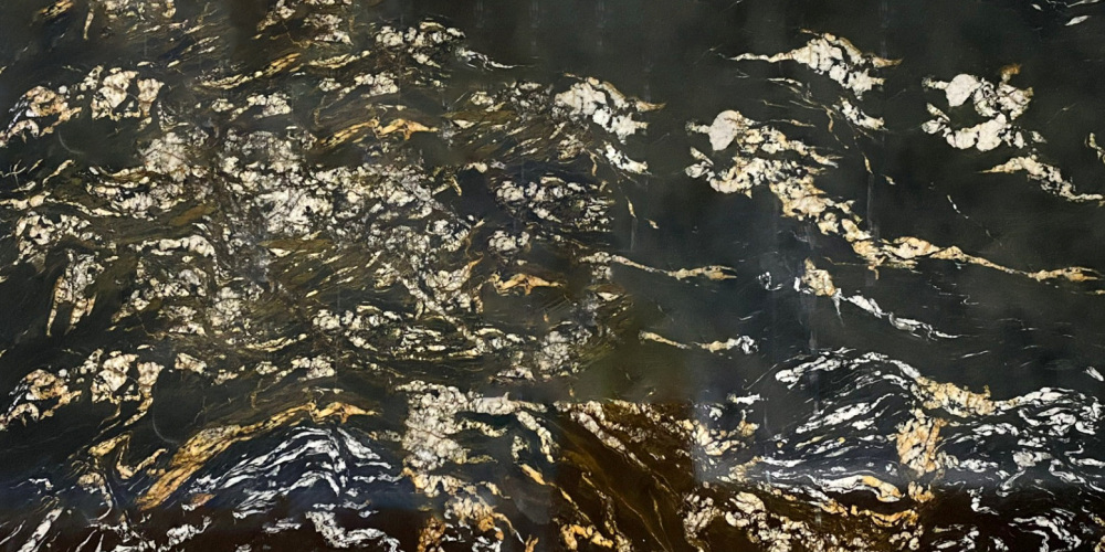 以深邃的墨黑为核心基底,隐约交织着暗绿与深褐的底色层次,整体色调浓郁沉稳,既保留了石材的厚重感,又通过细微的底色变化避免了单调,为表层纹理提供了极具张力的视觉衬托。
