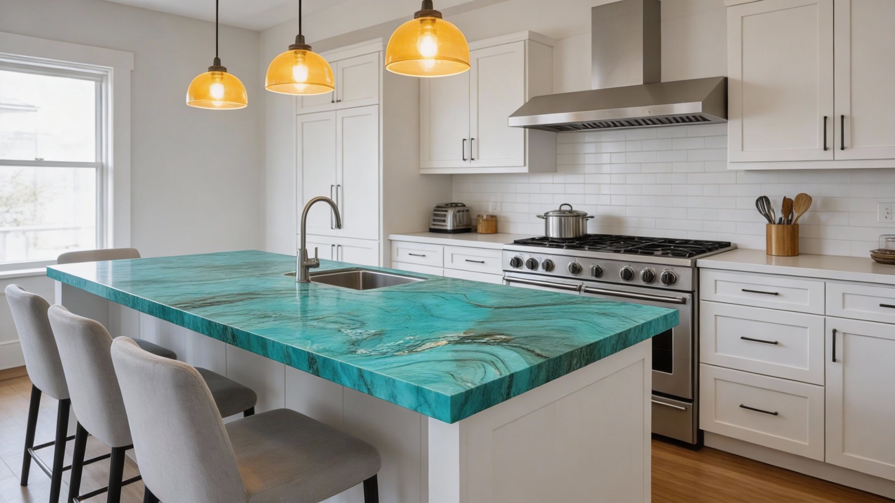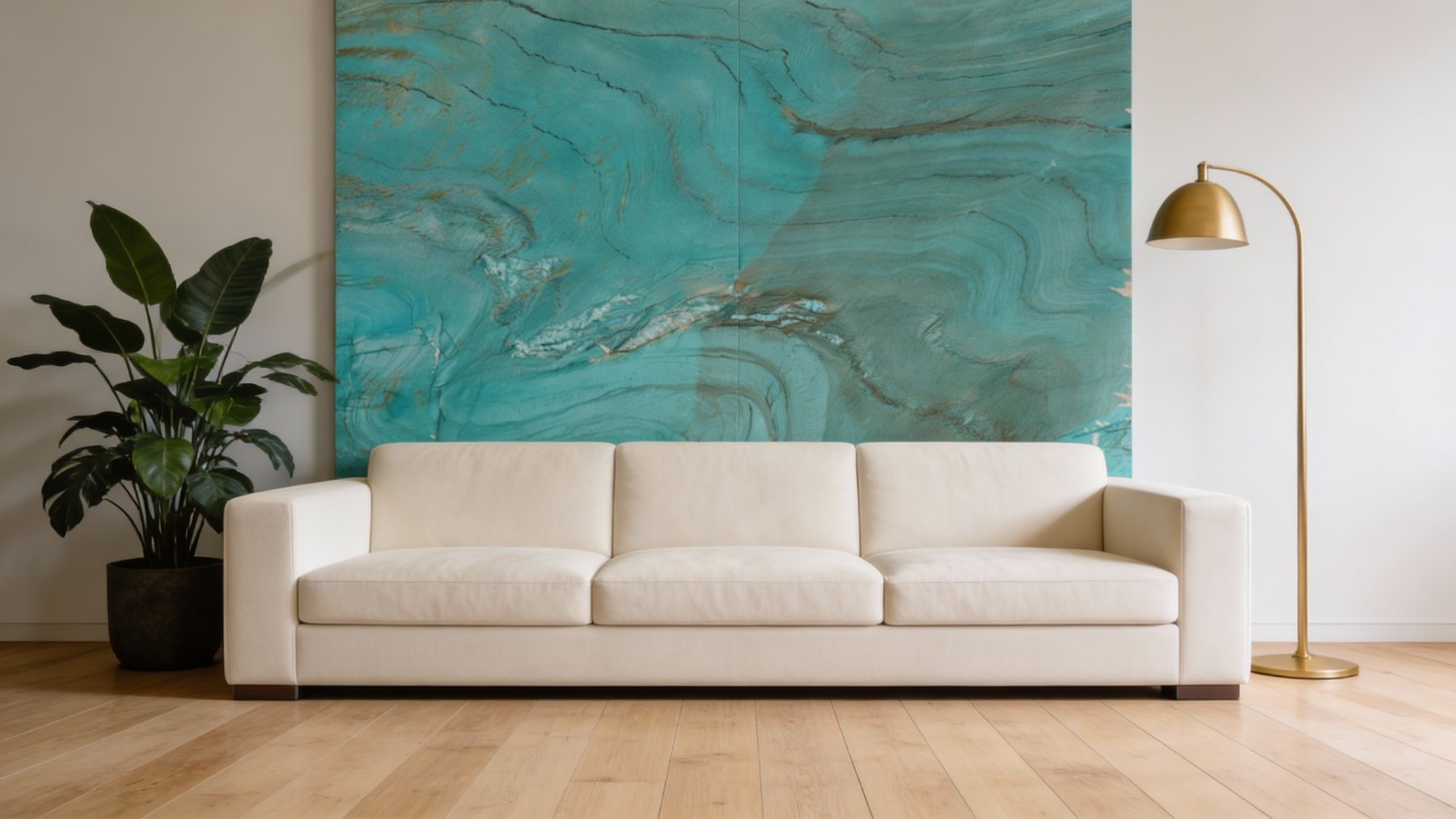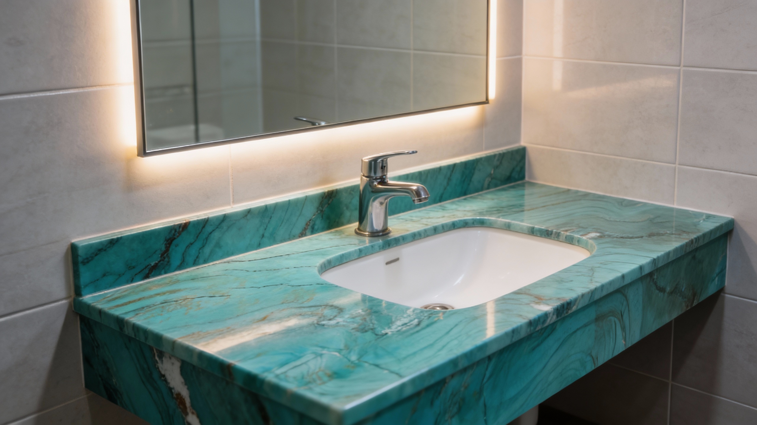 ### **一、底色基调:清新温润的蓝绿韵调** 石材以**清新雅致的蓝绿色为核心基调**,深浅过渡自然柔和——浅处如春日湖水般澄澈透亮,深处似翡翠凝萃般温润厚重,整体色调既保留了自然石材的质朴感,又透出灵动的生命力,仿佛将山林间的清冽绿意与湖水的静谧蓝调揉合一体,给人宁静治愈的视觉感受。### **二、纹理形态:灵动婉转的自然流动感** 纹理呈**自然蜿蜒的流动曲线**,似山间溪流冲刷过的痕迹,又若云雾翻卷的柔美感——深灰、墨绿的细密线条与底色交织,时而如平行层叠的波浪,时而如交织缠绕的云纹,无规则却富有韵律,仿佛时光在石材表面镌刻的天然轨迹。纹理的方向感不强,却因曲线的柔缓转折,形成了层次丰富的视觉纵深,避免了呆板感。### **三、细节质感:细腻高级的天然肌理** 表面**光滑细腻,泛着温润的柔光**,触手顺滑无明显颗粒感,兼具石材的厚重与玉石般的细腻;局部点缀着**浅白或银灰色的絮状结晶**,如星辰散落于蓝绿底色中,增添了天然的独特性与辨识度;深色纹理线条粗细有致,错落分布,既未破坏整体的和谐感,又通过细微对比强化了纹理的立体感,整体质感高级而不张扬,质朴中藏着自然的精致。