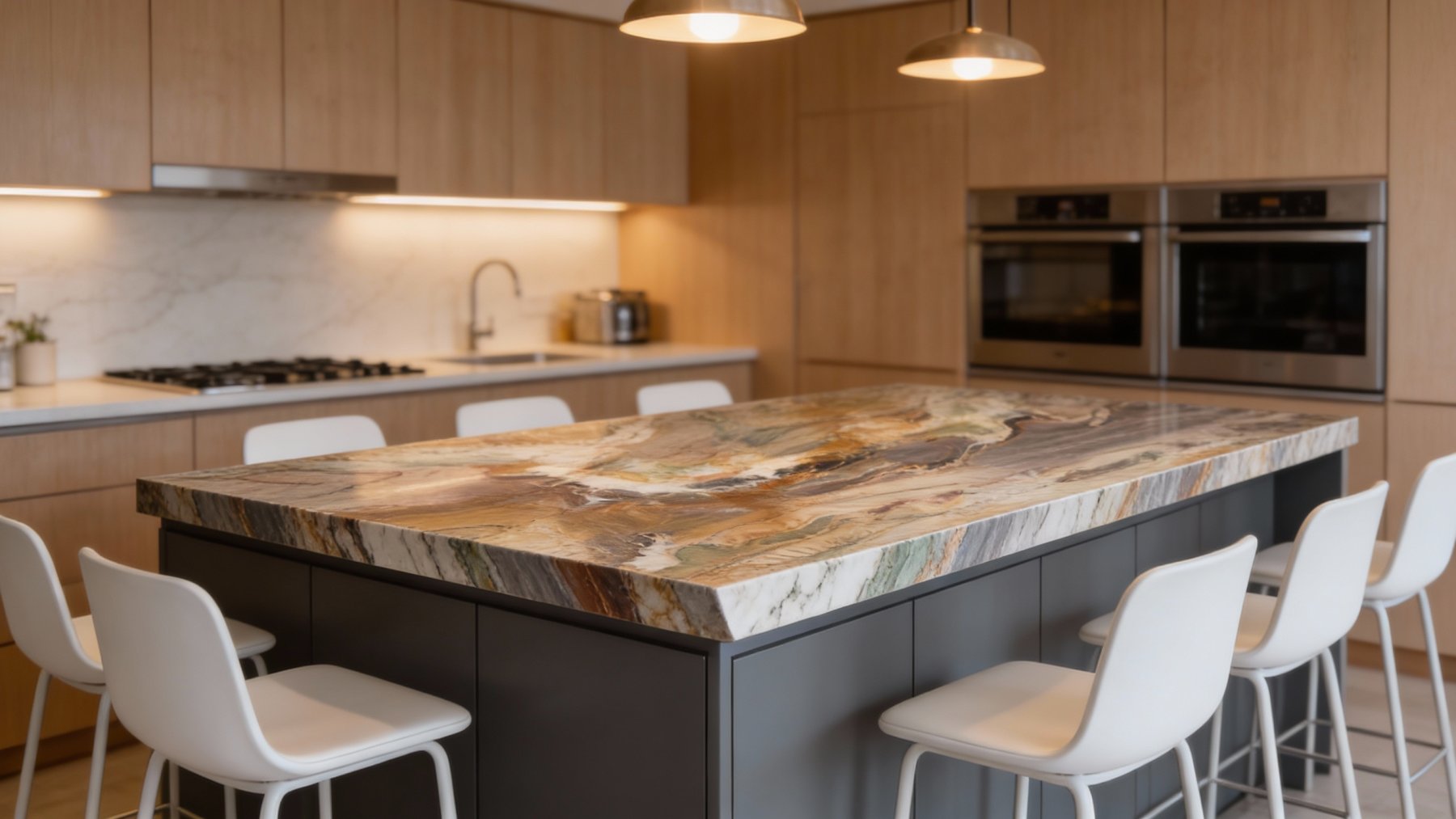 这款石材的底色呈现**冷暖交织的复合基调**:以柔和的浅灰、米白为基底,交织着暖调的琥珀棕、焦糖色,以及冷调的深灰、墨黑斑块。整体基调温润中透着沉静,浅色系赋予空间柔和感,深色与暖色块则增添厚重与暖意,冷暖平衡间尽显自然的层次感。