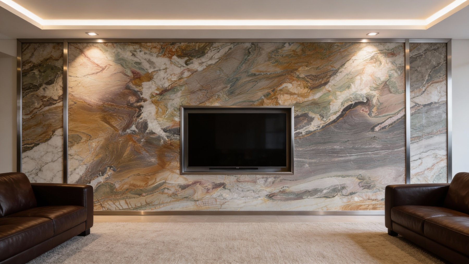 抛光后的表面**细腻温润,带有柔和的缎面光泽**,触感应平滑致密;细节处可见色彩的自然晕染:浅灰向深灰的渐变无生硬边界,焦糖色斑块与米白基底融合得恰到好处,偶有细密的矿物结晶点隐约闪烁,增添了石材的天然质感。整体质感厚重却不失灵动,既有石材的坚硬底蕴,又透出温润如玉的细腻触感。