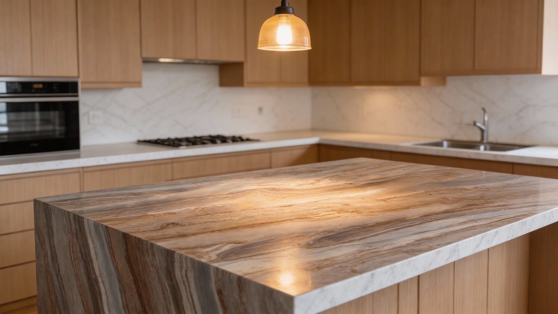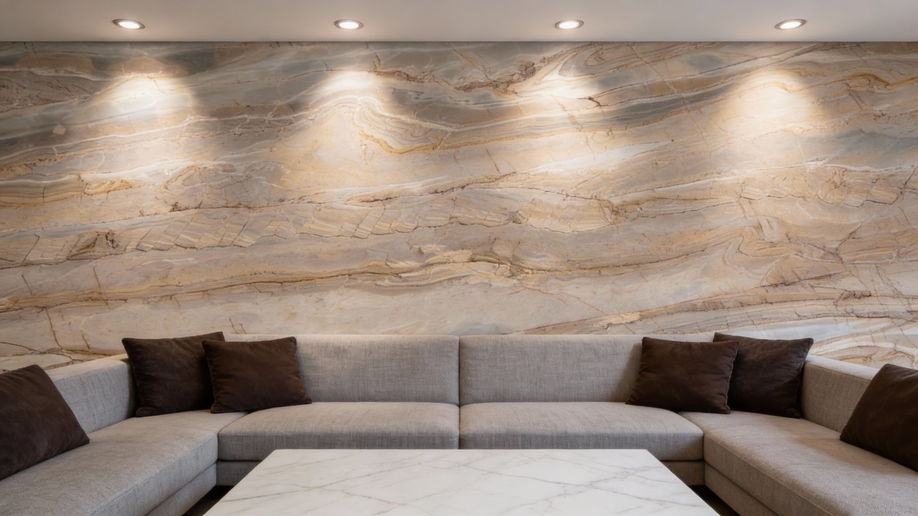 ### 底色基调 以浅米黄与灰褐色为核心交织底色,辅以淡灰白、浅棕褐的自然过渡色调,整体呈现**温润柔和的暖中性基调**。色彩层次丰富却无生硬割裂感,深浅色阶自然晕染,似清晨薄雾笼罩的大地肌理,尽显质朴雅致的天然质感。### 纹理形态 纹理呈**自然流动的波浪状层理结构**,如地质沉积的岩层叠嶂,又若流云舒展的曲线交织。线条流畅且富有韵律:时而宽幅延展如缓坡,时而细密蜿蜒似溪流,层与层之间过渡自然,形成动态的视觉张力,仿佛时光镌刻的自然轨迹,自带舒缓的流动感。### 细节质感 表面肌理**细腻温润**,呈半哑光质感(触感应平滑致密)。纹理边缘处可见深浅色阶的微妙渐变,偶有细碎的矿物点晕或浅白细纹点缀其间——既保留了天然石材的原始肌理感,又无粗糙颗粒感,整体散发着厚重而雅致的自然气息,兼具视觉的柔和度与触感的舒适度。