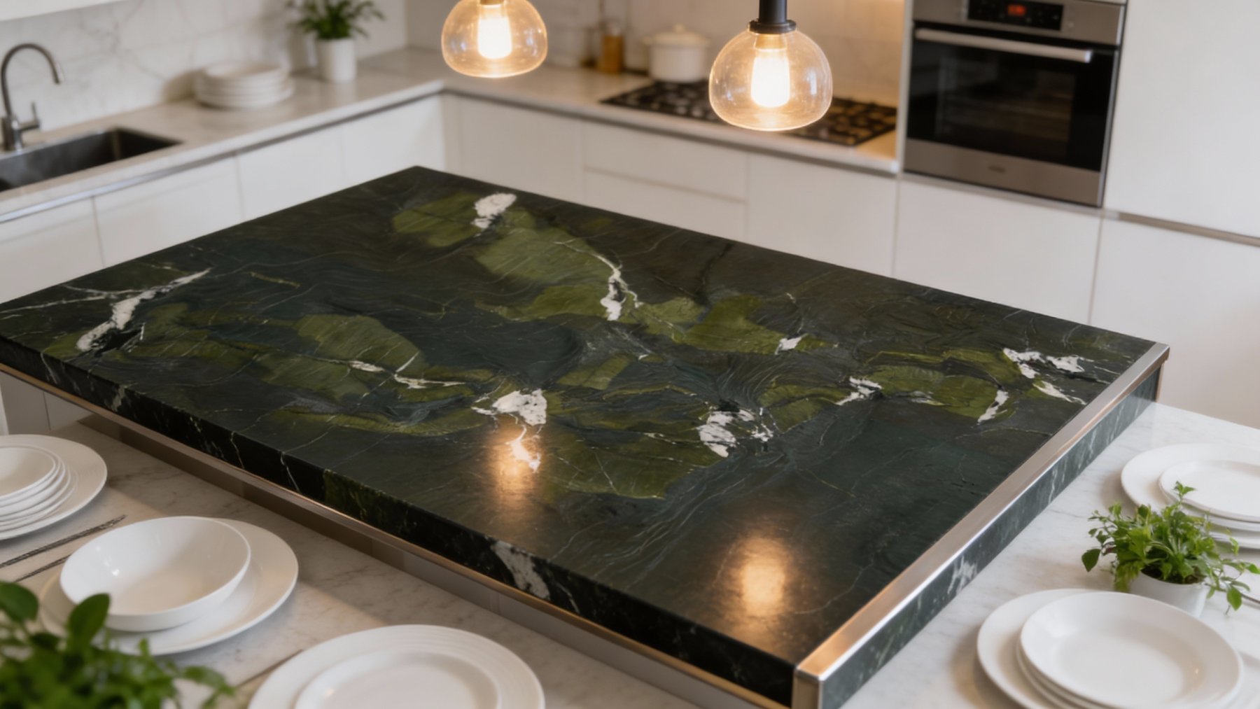 石材表面细腻温润,触感应是平滑微凉的天然质感。墨绿色区域肌理层次丰富,深浅过渡自然,似有细腻的矿物颗粒隐于其中;白色部分通透莹润,与深色基底形成鲜明对比却又和谐相融。整体光泽柔和内敛,不刺眼却能在光线下折射出微妙的肌理变化,每一处纹理细节皆独一无二,藏着天然石材的原始张力与精致感。