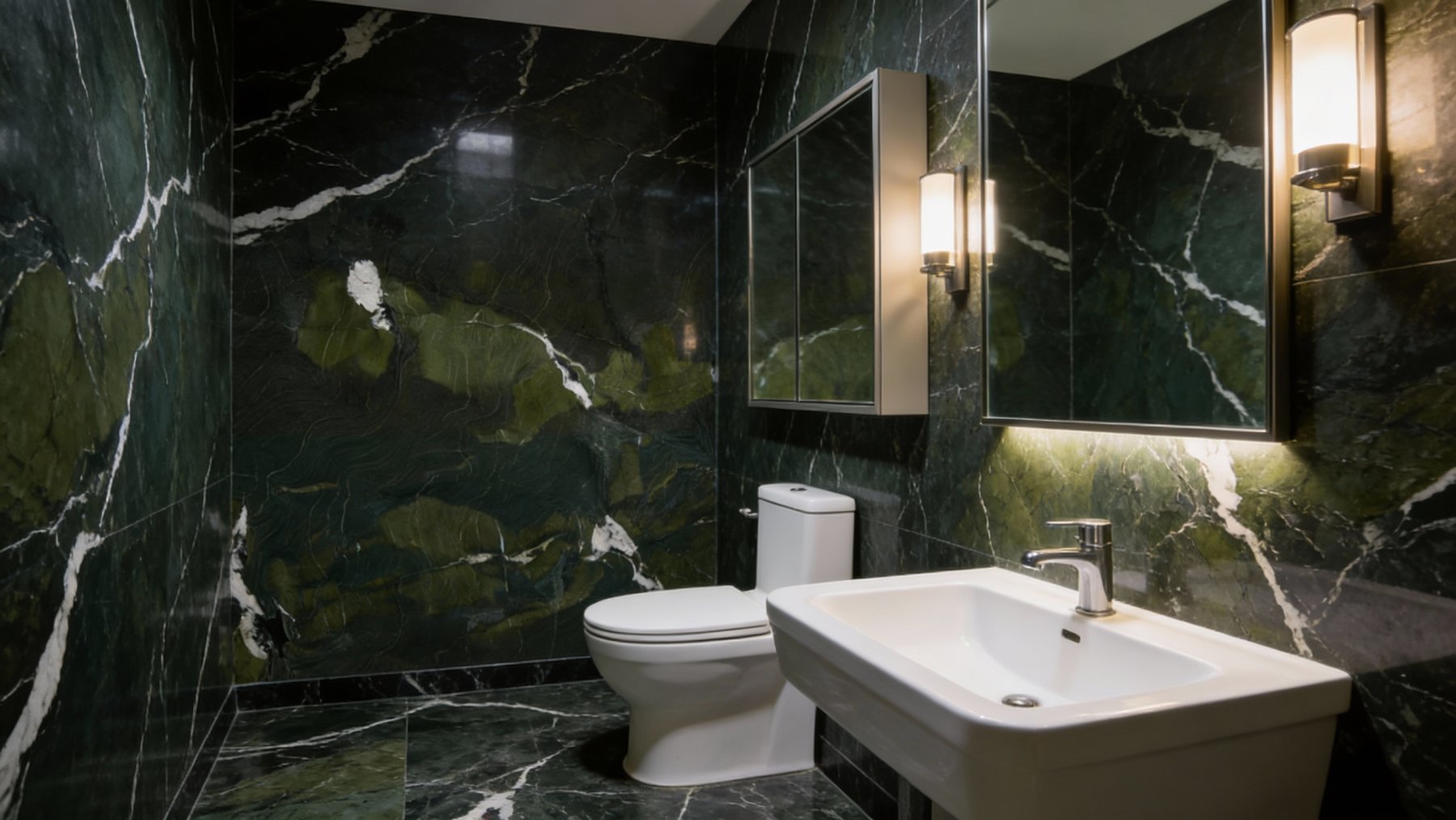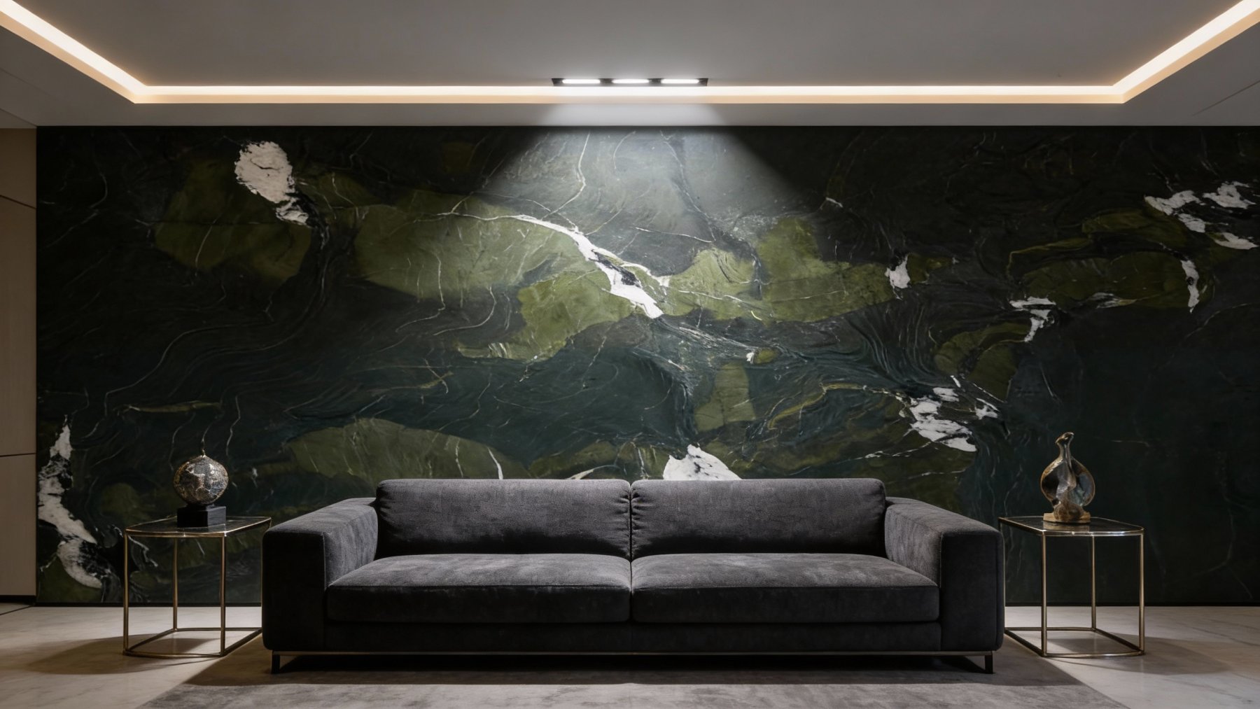 以深墨绿与炭黑交织为基底,色调浓郁沉稳,似将暗夜森林的静谧与深海的深邃凝于一石,自带高级内敛的氛围感,既不张扬却又暗藏张力,为空间奠定低调奢华的基调。