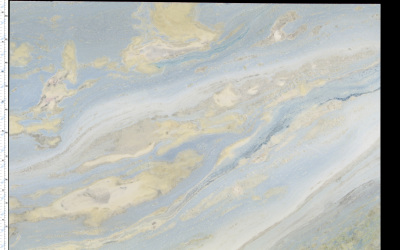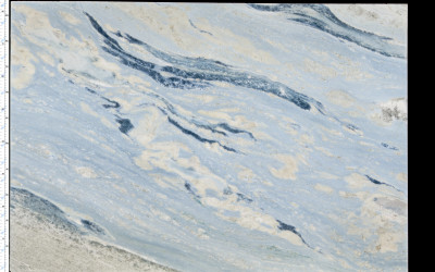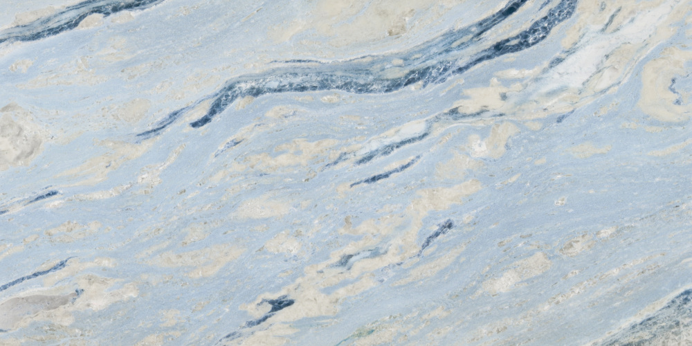 石材表面经抛光处理后**细腻光滑**,带有温润的光泽感,触感应是冰凉细腻的。浅色肌理中隐约可见细小的天然颗粒与斑点,增添了质感的层次与原生气息;深色蓝色纹理的边缘过渡柔和,似墨色晕染般雅致,无生硬切割感。整体质感既保留了石材的坚硬厚重,又因色调柔和与纹理灵动而显得温润雅致,兼具实用耐用性与艺术装饰性。