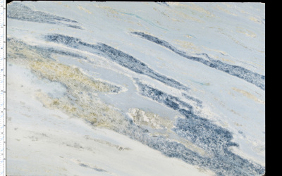 纹理呈现**自然流动的韵律感**:深蓝色的脉络以不规则的条状、丝状及云雾状分布,或粗或细、或浓或淡——粗处如蜿蜒的溪流在基底上舒展,细处似轻盈的飘带随风摇曳,整体走势流畅无拘,毫无刻意雕琢的痕迹,尽显天然石材的随性灵动之美,宛如一幅动态的水墨风景画。