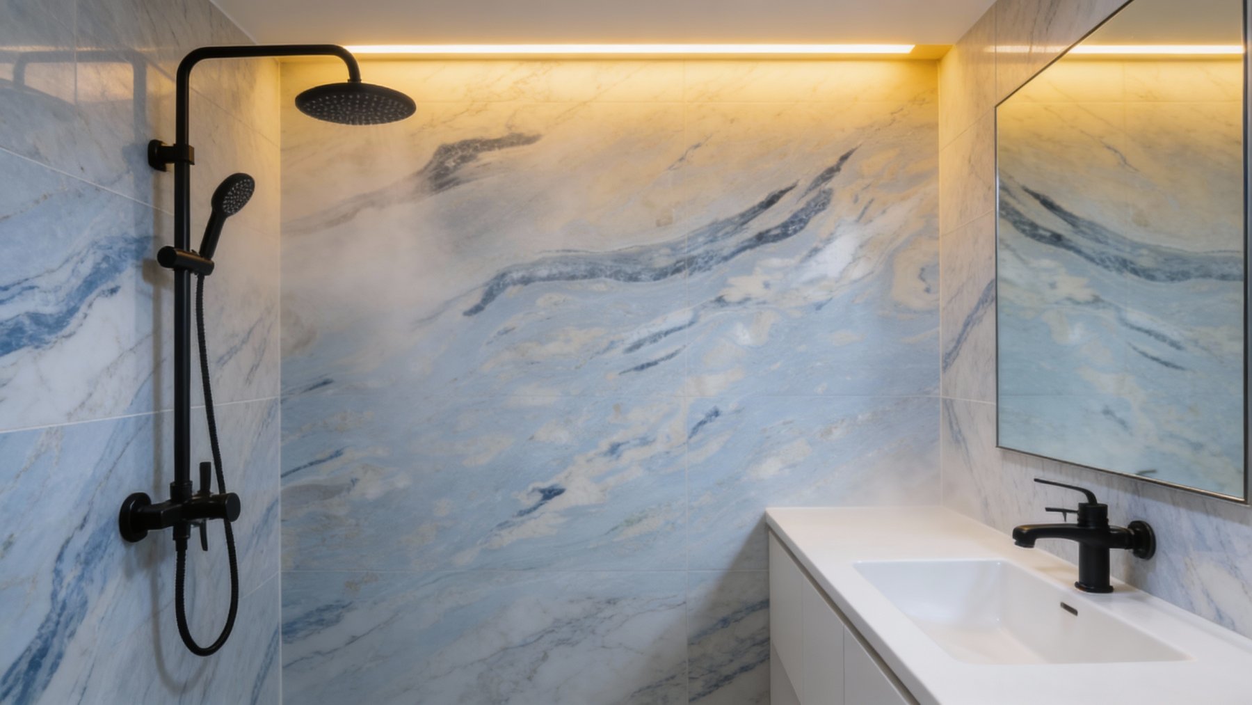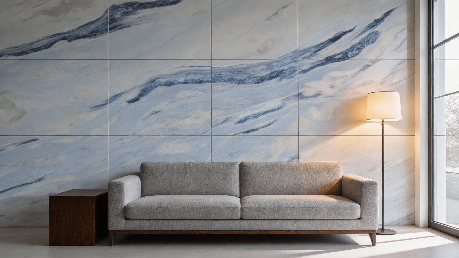 石材的底色基调以**柔和浅蓝灰**为主调,交织着**温润米白色**的肌理,整体呈现出清新淡雅的视觉氛围。浅蓝灰似清晨薄雾中的天空,米白如揉碎的云朵,二者自然晕染、相互融合,基调宁静治愈,仿佛将自然旷野的澄澈与温柔凝萃其中,给人松弛舒适的第一观感。