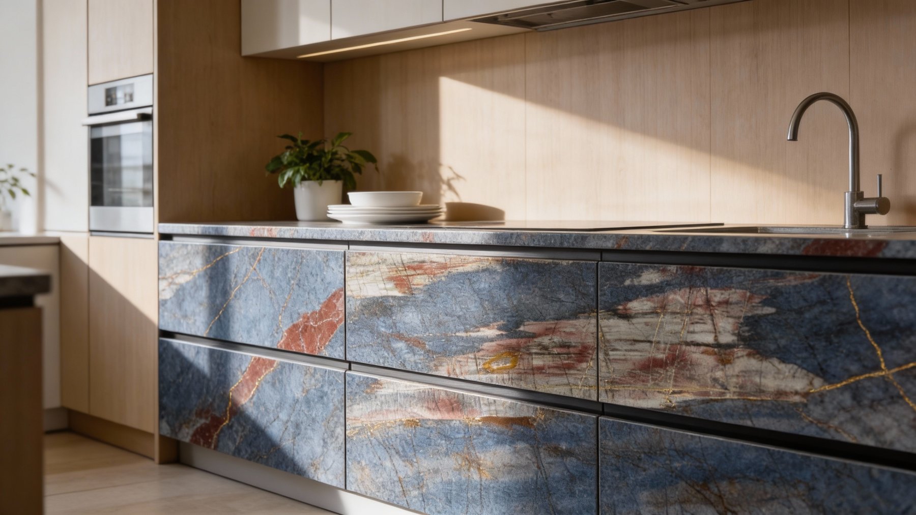 石材底色呈现**多层次自然融合的地质感**,以**沉稳内敛的蓝灰色**为主调,间杂浅灰白的过渡色块与暖润的红棕色条带,局部点缀零星浅黄矿物斑点。整体色彩既保留了深色调的厚重感,又通过暖红棕与浅灰白的穿插打破单调,形成“冷调基底+暖调点睛”的平衡,传递出地质层积的岁月沉淀感。