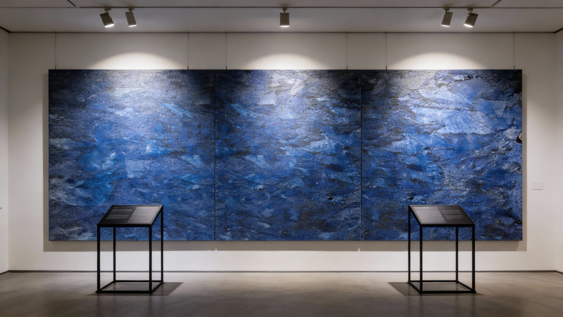 ### 底色基调 这款石材的底色基调为**深邃浓郁的藏蓝色**,间杂着浅灰与墨蓝的自然过渡层次,整体色调沉稳厚重,如夜幕般静谧深邃,又因局部色泽的细微渐变(从饱和的钴蓝到朦胧的灰蓝)而避免单调,奠定了优雅大气且富有质感的视觉基底。### 纹理形态 纹理呈现为**不规则的片状与絮状交织**,仿佛天然矿物晶体碎裂后散落的痕迹——深浅不一的蓝色斑块(如青金石般的晶状质感)与灰调纹理相互渗透,无明显规律却和谐共生,形成斑驳而富有动感的视觉效果,既保留了石材的原始地质肌理,又似将星空的朦胧感凝于表面。### 细节质感 表面具有**细腻的颗粒质感**,触摸时能感受到石材天然的粗糙肌理(非光滑抛光感);光泽度偏向柔和的哑光,光线照射下,不同色块的反光差异赋予表面丰富的层次感,深浅纹理的边缘过渡自然,无生硬界限,尽显石材质朴而真实的原始质感,仿佛能触摸到地质演化的岁月痕迹。