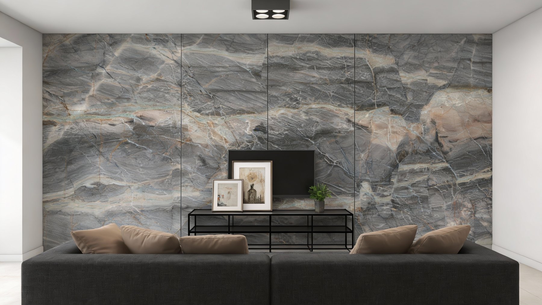 ### 底色基调 以**深灰色**为核心基底,基调沉稳厚重;基底中自然晕染着浅灰、灰褐色、米白色等过渡色调,如同地质层积过程中的矿物沉淀,让整体色彩既保持中性偏冷的静谧感,又因暖调纹理的穿插而避免单调,呈现出丰富且和谐的层次变化。### 纹理形态 纹理兼具**层状延展**与**网状脉络**的双重特征: - 大面积纹理以水平走向的条带状为主,宽幅纹理带与纤细纹路交替出现,边缘过渡自然,似天然岩层的沉积痕迹; - 细密的网状裂隙纹穿插其间,如石材形成时的天然裂隙被矿物填充,线条纤细却清晰,与层状纹理交织出不规则的立体图案,既保留了自然石材的原始张力,又避免了刻板重复,整体流畅且富有动态变化。### 细节质感 表面呈现**细腻温润的半哑光质感**: - 深灰基底部分致密平滑,触感应是细腻坚实,无明显颗粒感; - 浅色调纹理带隐约透出矿物结晶的微光泽感,仿佛蕴含细碎的天然晶体,在光线下会产生微妙的光影层次; - 网状裂隙的线条虽细,但边缘清晰却不尖锐,视觉上增强了石材的立体感,整体质感既具备天然石材的厚重耐用性,又因细节处的纹理变化透出雅致的艺术氛围。