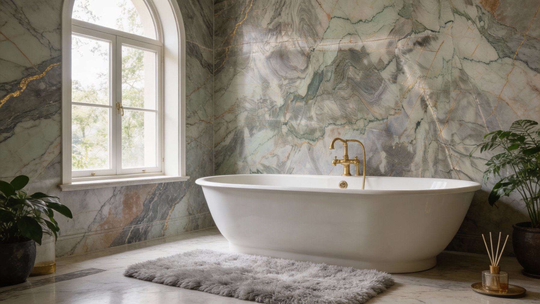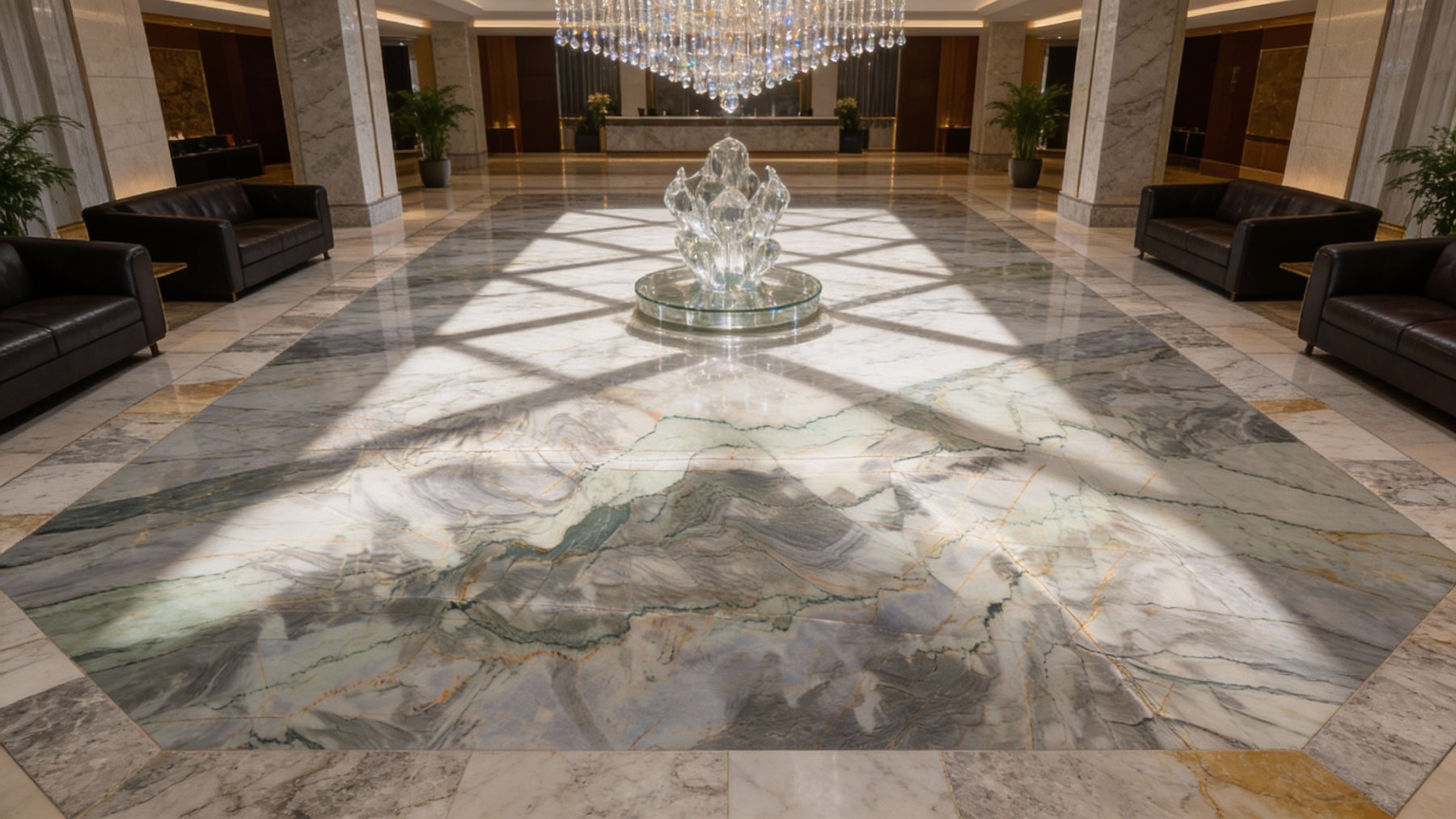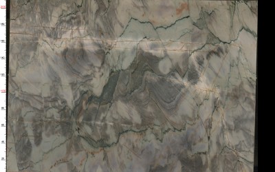 #### **1. 底色基调** 石材底色以**柔和的浅灰色**为核心基底,间杂着淡青、米白的朦胧过渡色调,整体呈现出一种静谧雅致的中性质感。基调不张扬却自带温润氛围,浅灰的沉稳与淡青的清透相互融合,既保留了天然石材的质朴感,又透出一丝雅致的朦胧美,适配性极强。#### **2. 纹理形态** 纹理以**自然流动的层叠状**为主,仿佛山峦叠嶂的写意轮廓,又似水墨在宣纸上晕染开的深浅笔触。深色的灰绿、墨灰条纹与浅色基底交织,形成不规则却和谐的起伏脉络;部分区域可见细密的、类似天然裂隙的线性纹理,穿插在主纹路中,增添了层次感与自然野趣。整体纹路无固定规律,却有着行云流水般的韵律感,兼具“静”的雅致与“动”的生机。#### **3. 细节质感** 表面呈现**细腻温润的致密质感**,触感应是平滑光洁的,带有天然石材特有的柔和光泽。不同区域质感略有差异:浅色基底部分通透感稍强,光泽内敛柔和;深色纹理区域则更显厚重沉稳,光泽度略低,形成微妙的光影对比。整体质感兼具天然石材的质朴与精致加工后的细腻,低调中透出奢华感,仿佛能触摸到自然沉淀的岁月痕迹。