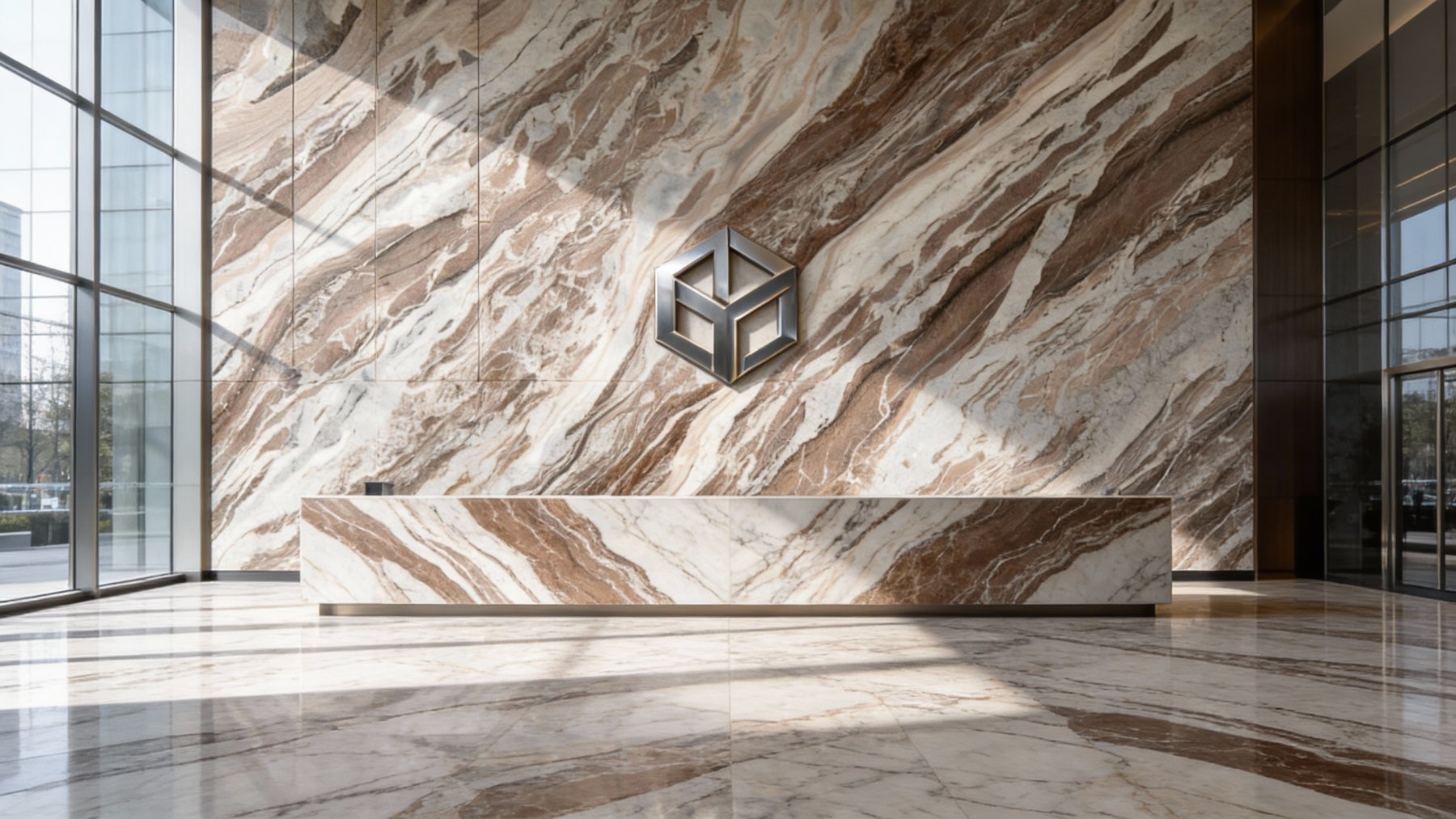 表面经抛光处理后,呈现细腻温润的莹润光泽,触感应平滑细腻。纹理边缘过渡自然,深浅色块交融处无生硬割裂感,尽显柔和;浅灰白色区域略带细微的肌理质感,与棕色调的温润基底形成微妙呼应,整体视觉层次饱满,兼具精致的抛光质感与自然石材的原生肌理感,雅致中透着生动。