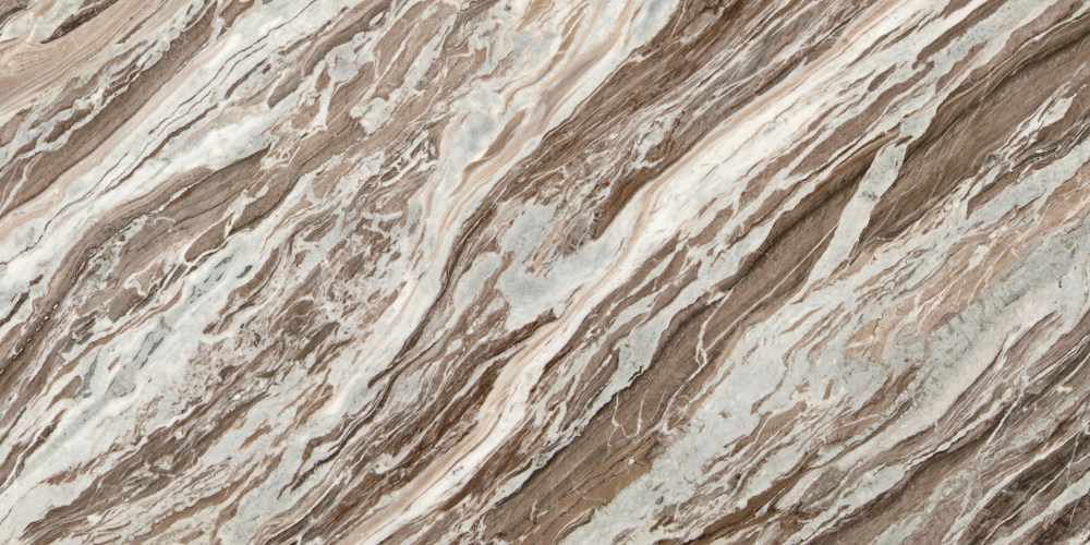 呈现自然流动的波浪状云纹纹理,线条蜿蜒交错、粗细变化有致。浅灰白色的纹理如溪流般穿梭于棕色调基底中,时而舒展如绸带,时而卷曲似涟漪,形成富有韵律的动态感;纹理分布疏密相间,既有大面积的舒展区域,也有局部密集的交织细节,层次丰富却不显杂乱,宛如地质层经岁月流动沉淀的自然痕迹。