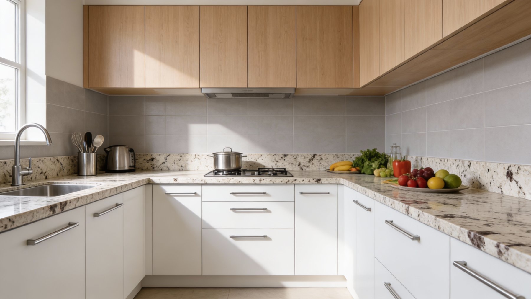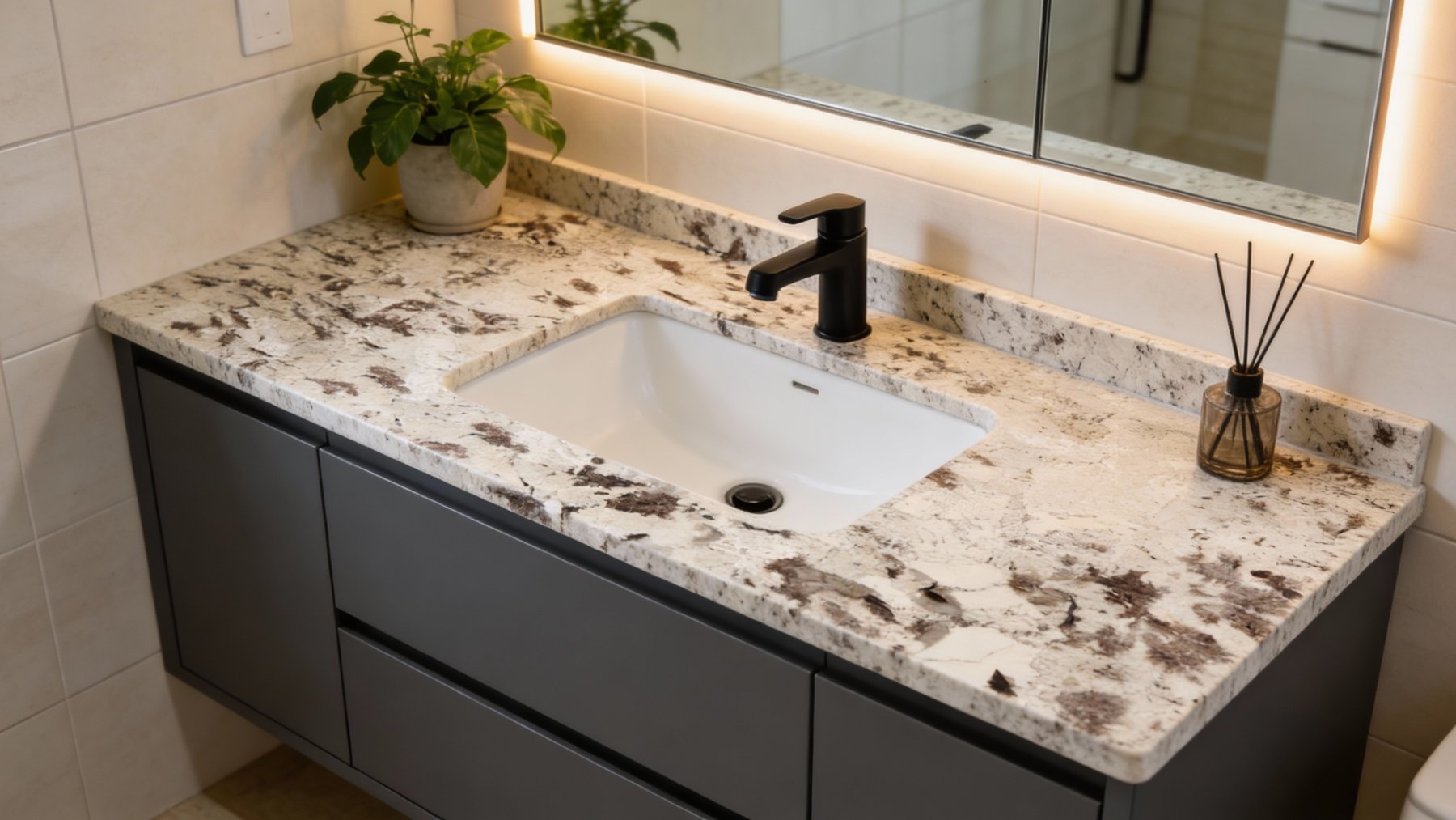 以柔和的浅米白色为核心基底,间杂着淡暖灰色的朦胧晕染,整体色调温润雅致,既保留了浅色石材的干净通透感,又因暖调的融入避免了冰冷生硬,呈现出自然舒适的视觉氛围。