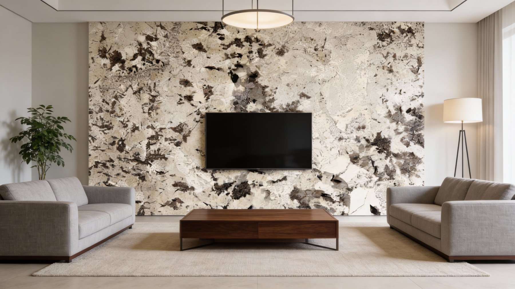 表面带有细腻的天然颗粒质感,呈半哑光的温润触感(非高度抛光的镜面效果);深浅色块间过渡自然柔和,无生硬边界,部分区域可见微小的矿物结晶闪光,整体质感厚重且富有层次——既保留了石材原始的肌理温度,又传递出精致细腻的触感体验,仿佛能触摸到自然沉淀的岁月痕迹。
