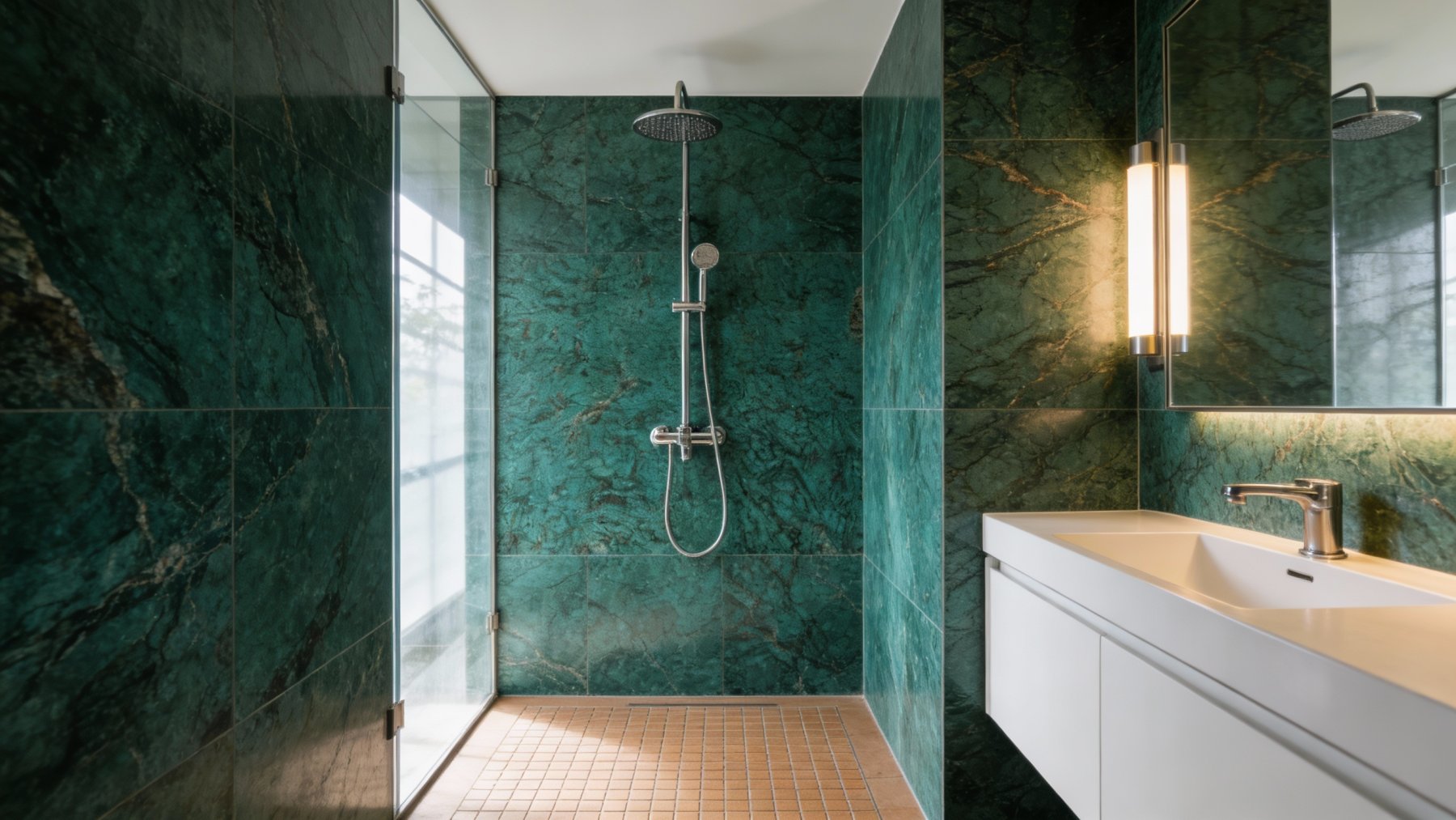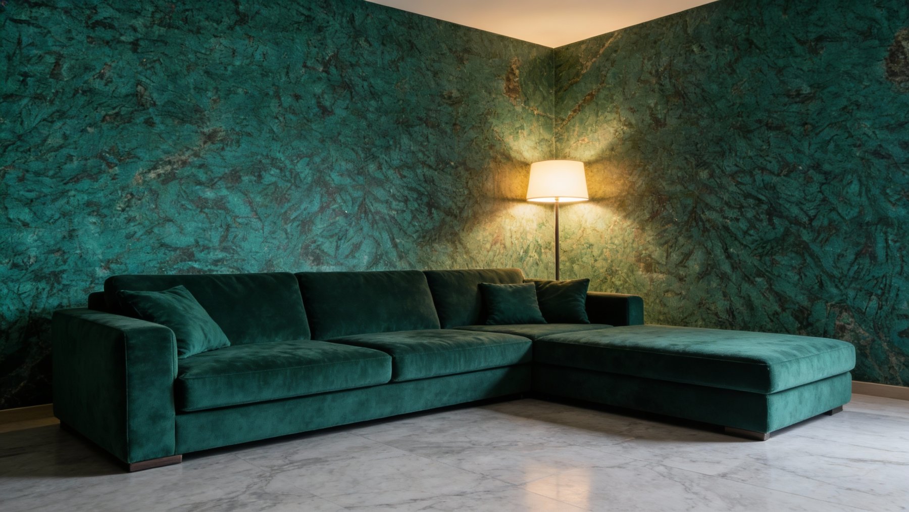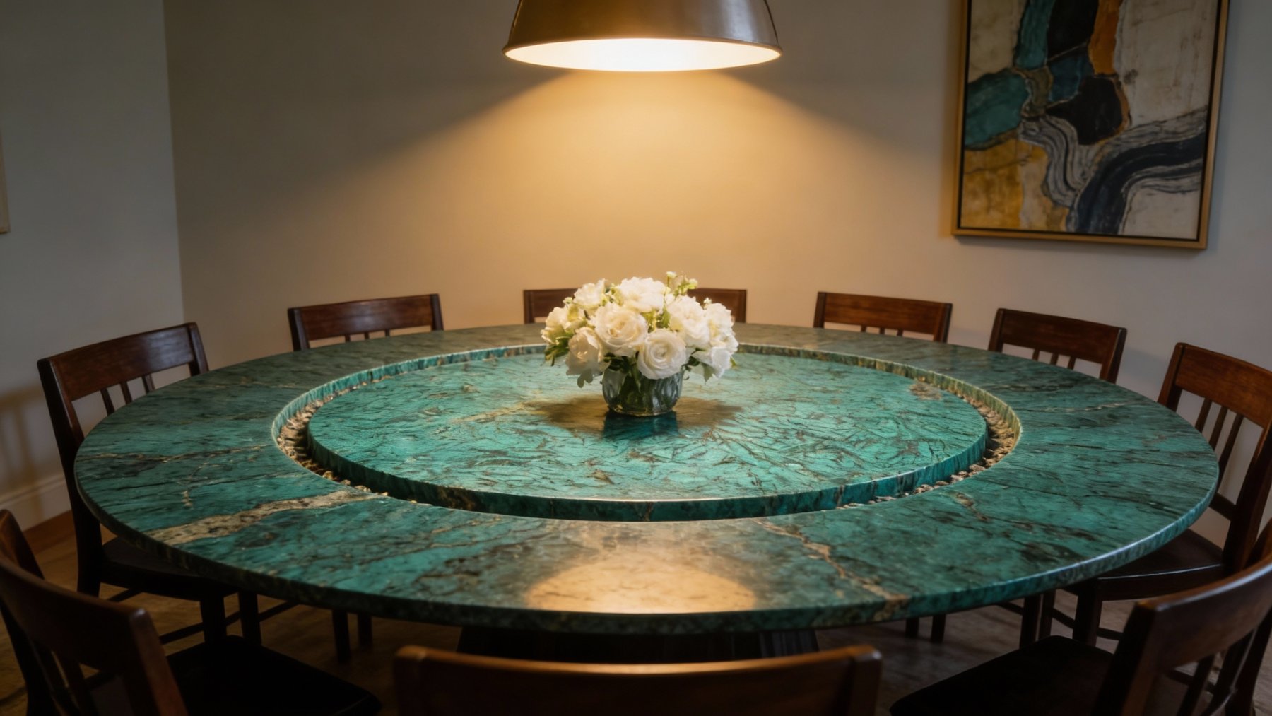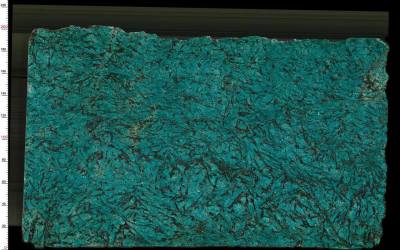 这款石材的底色以**深邃浓郁的蓝绿色**为主调,色泽饱满且富有层次,介于孔雀蓝与翠绿色之间,既保留了天然矿物的沉稳厚重感,又蕴含着鲜活灵动的生命力。色调饱和度高却不刺眼,如同深海绿藻或孔雀尾羽的幽邃色泽,给人强烈的视觉聚焦力。
